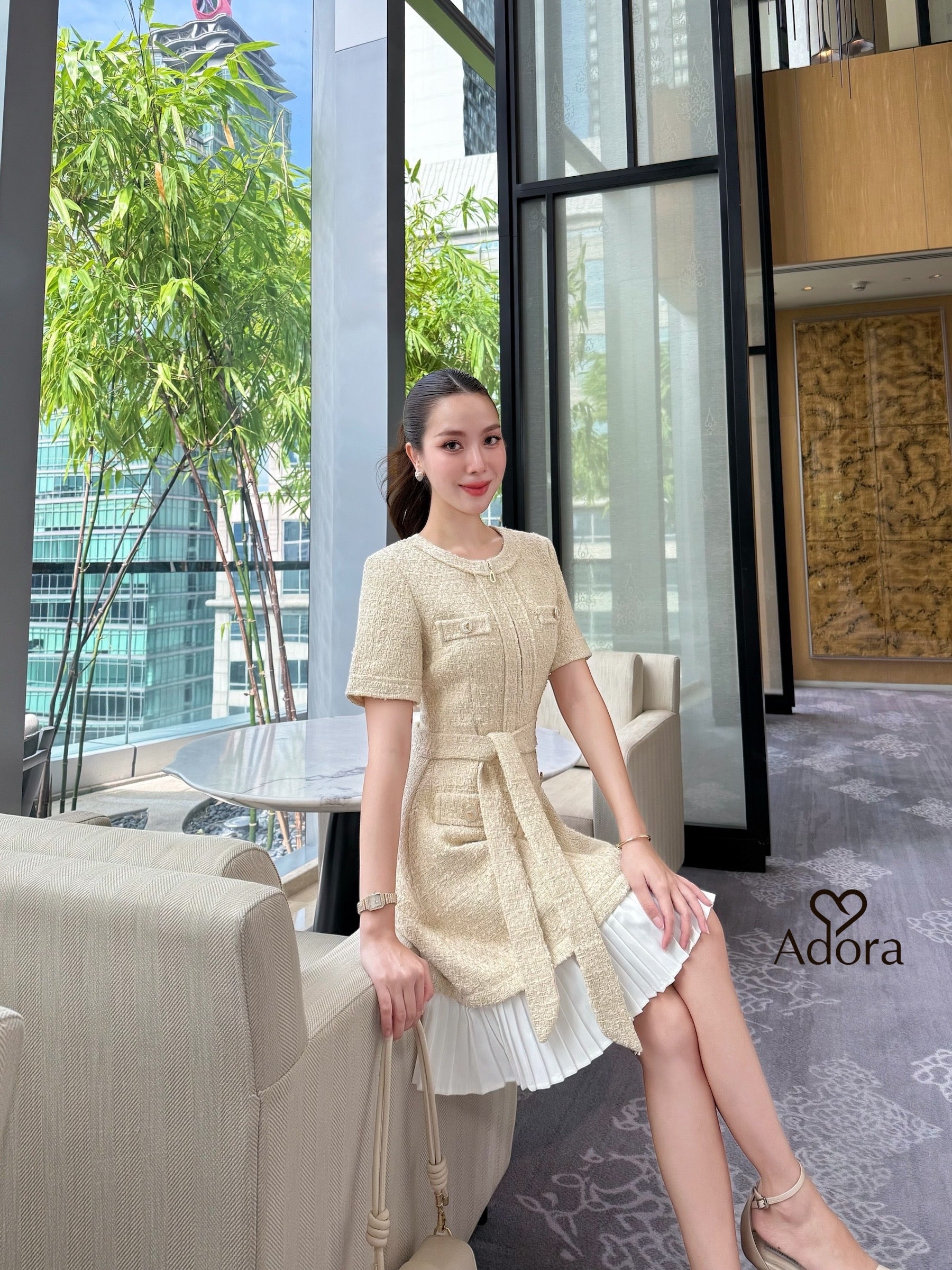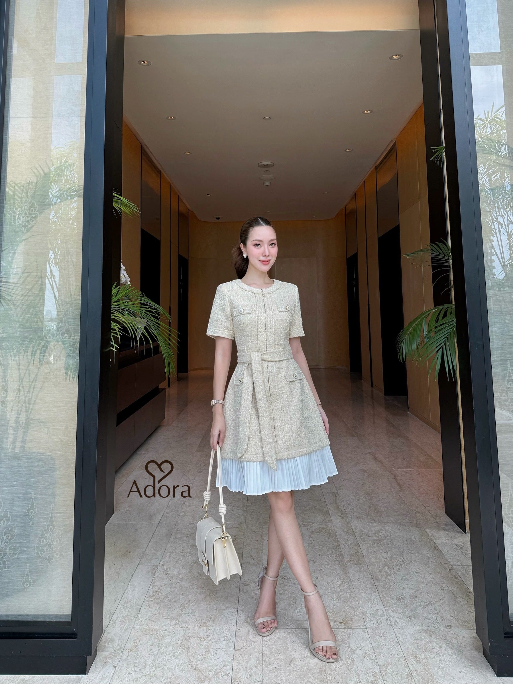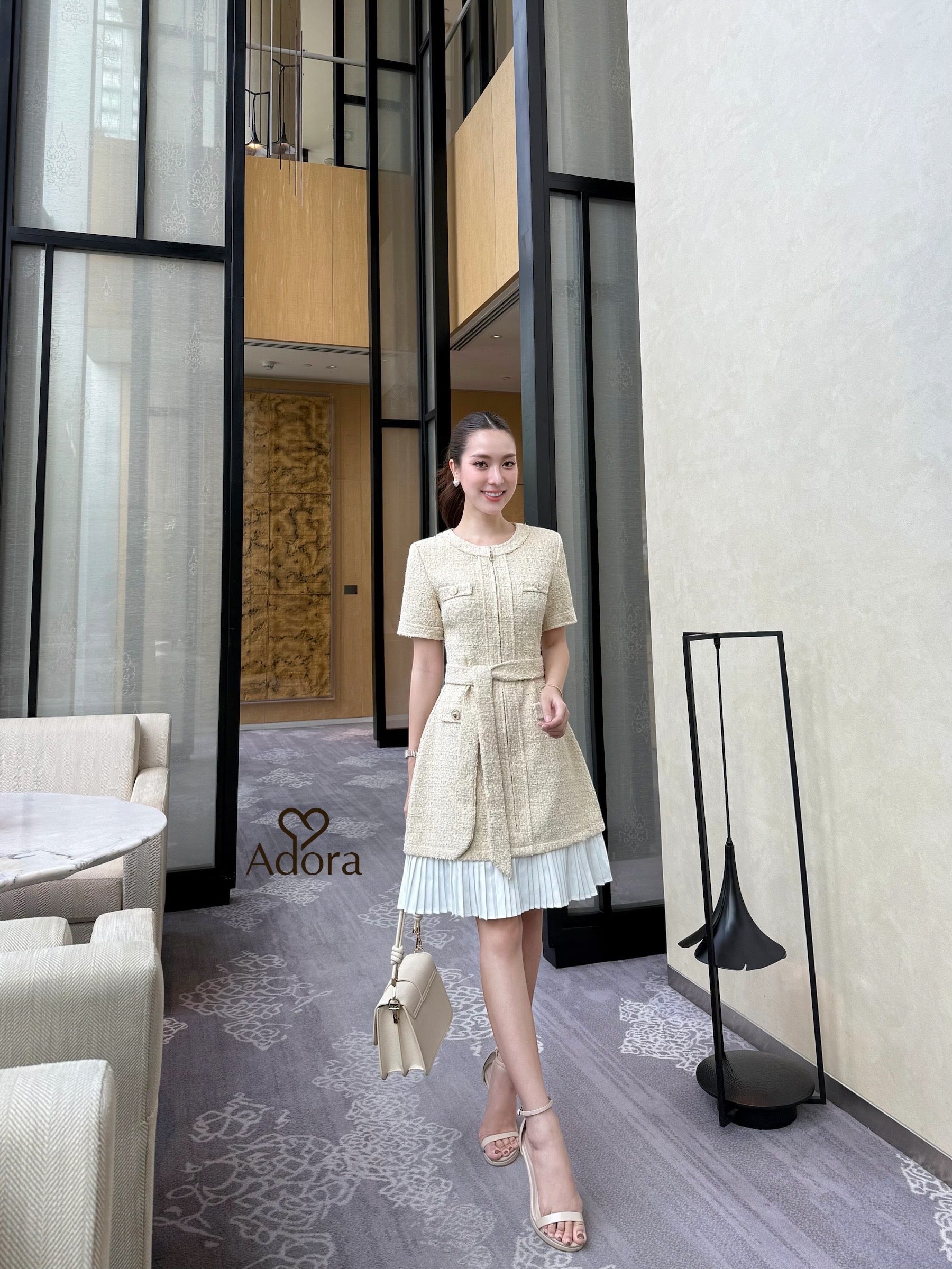 This short-sleeve mini dress is crafted from custom-woven Chanel-inspired tweed and features a front zipper, layered ruffle hem, and elegant decorative buttons for that extra charm.