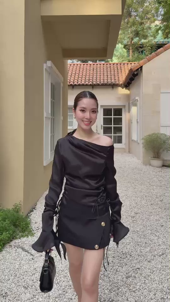 👚 Top: Off-shoulder long-sleeve blouse with flared cuffs,