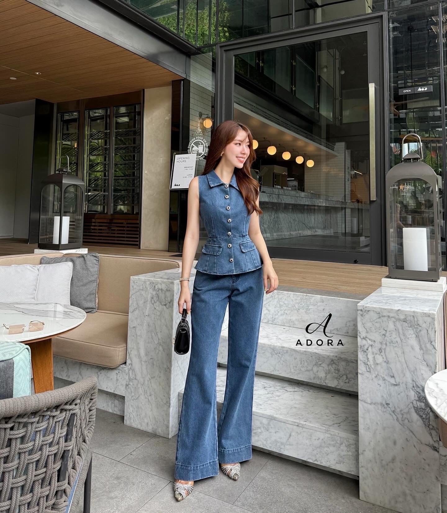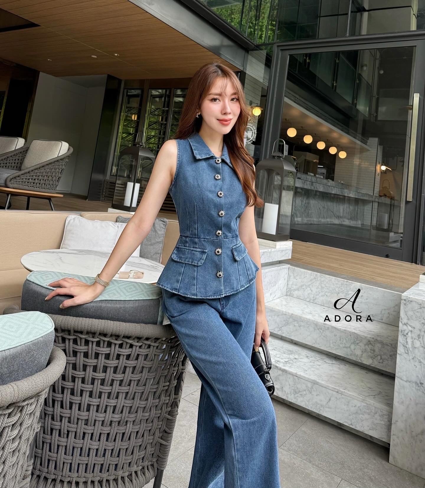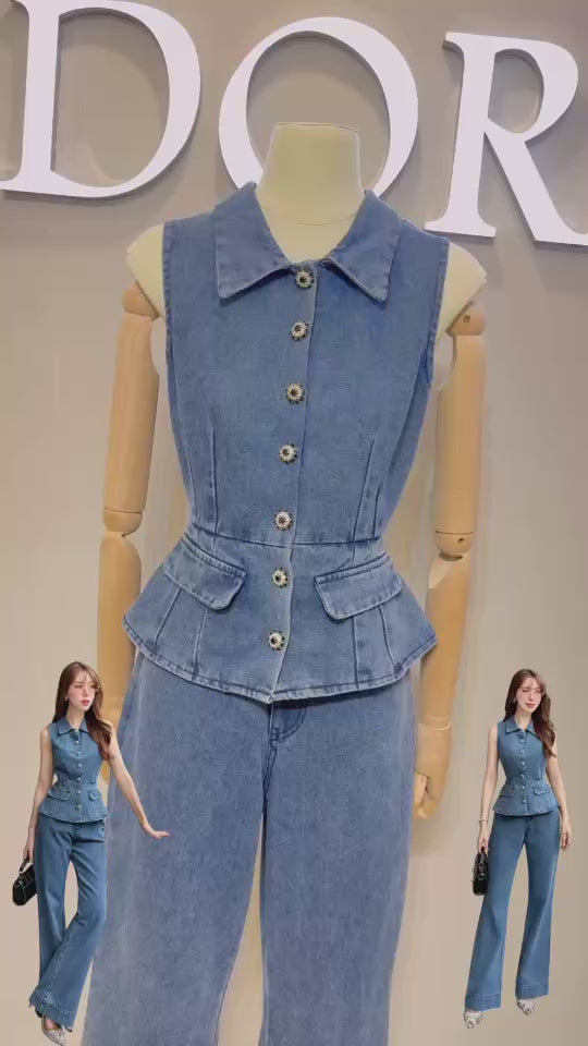 Featuring a sleeveless shirt with a classic collar, front buttons, and soft premium denim fabric with front pocket details and high-quality button hardware.