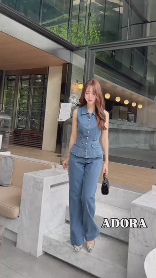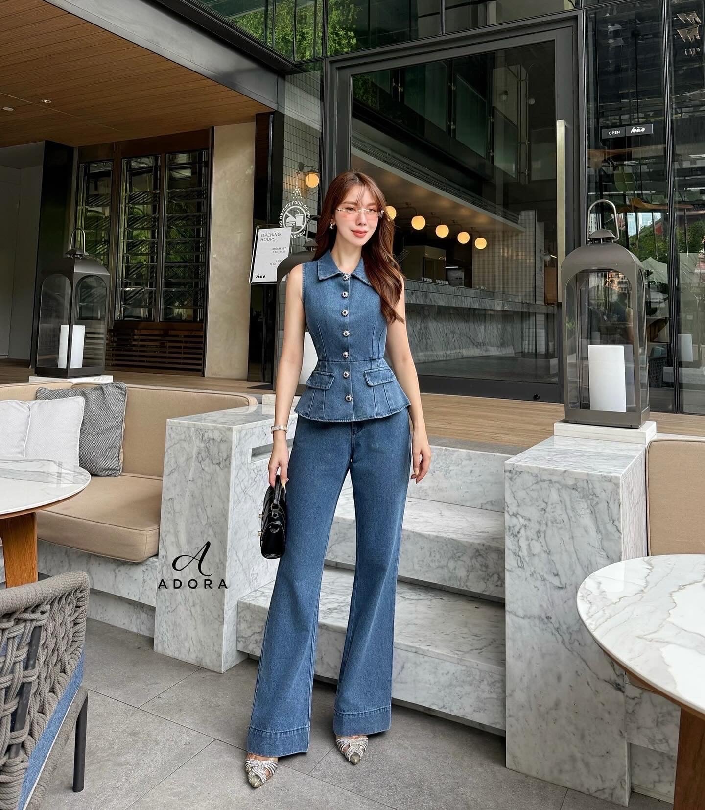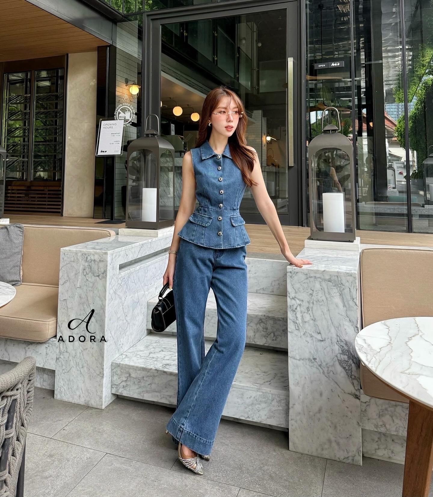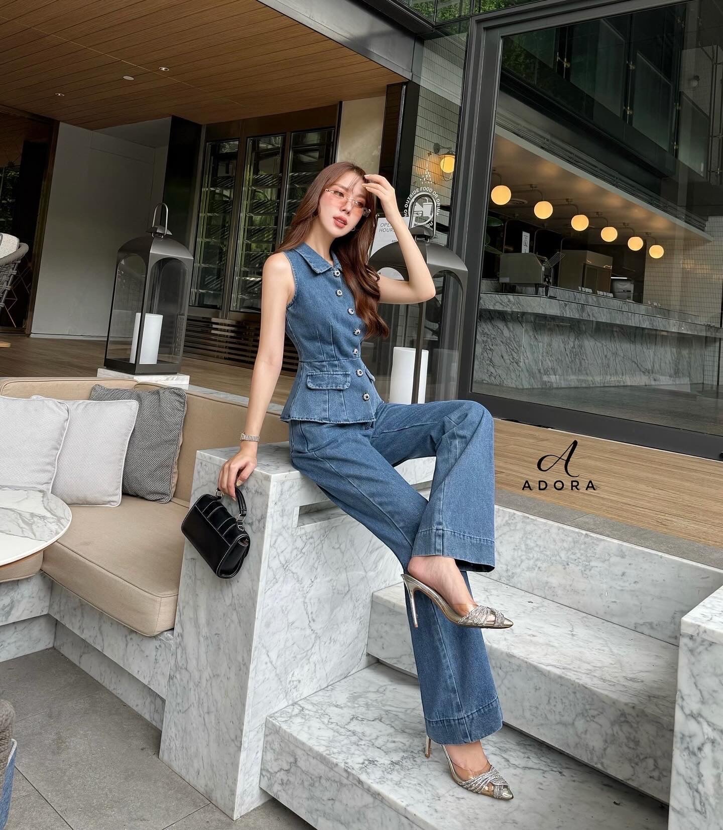 Featuring a sleeveless shirt with a classic collar, front buttons, and soft premium denim fabric with front pocket details and high-quality button hardware.