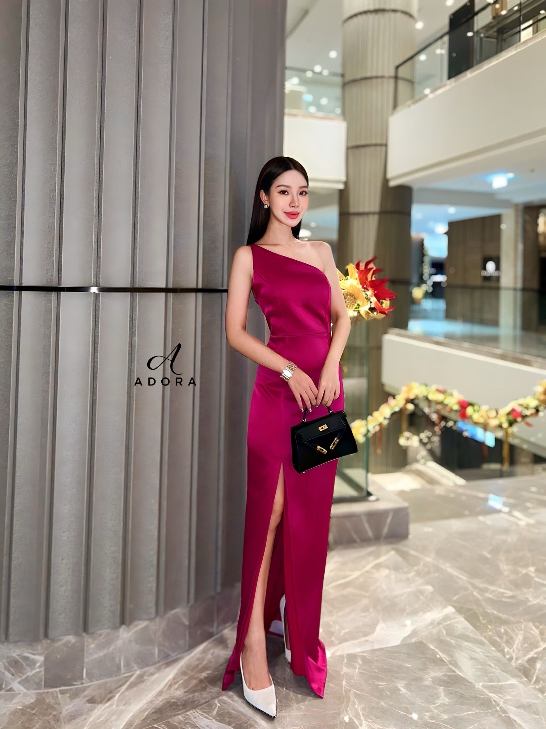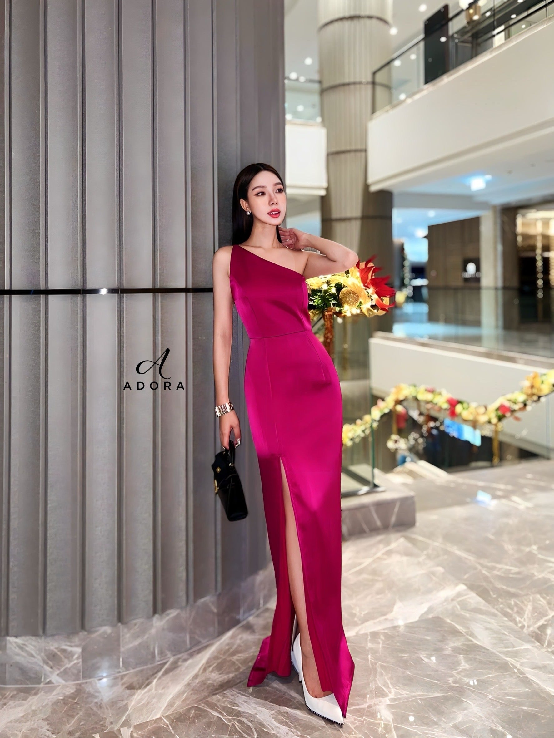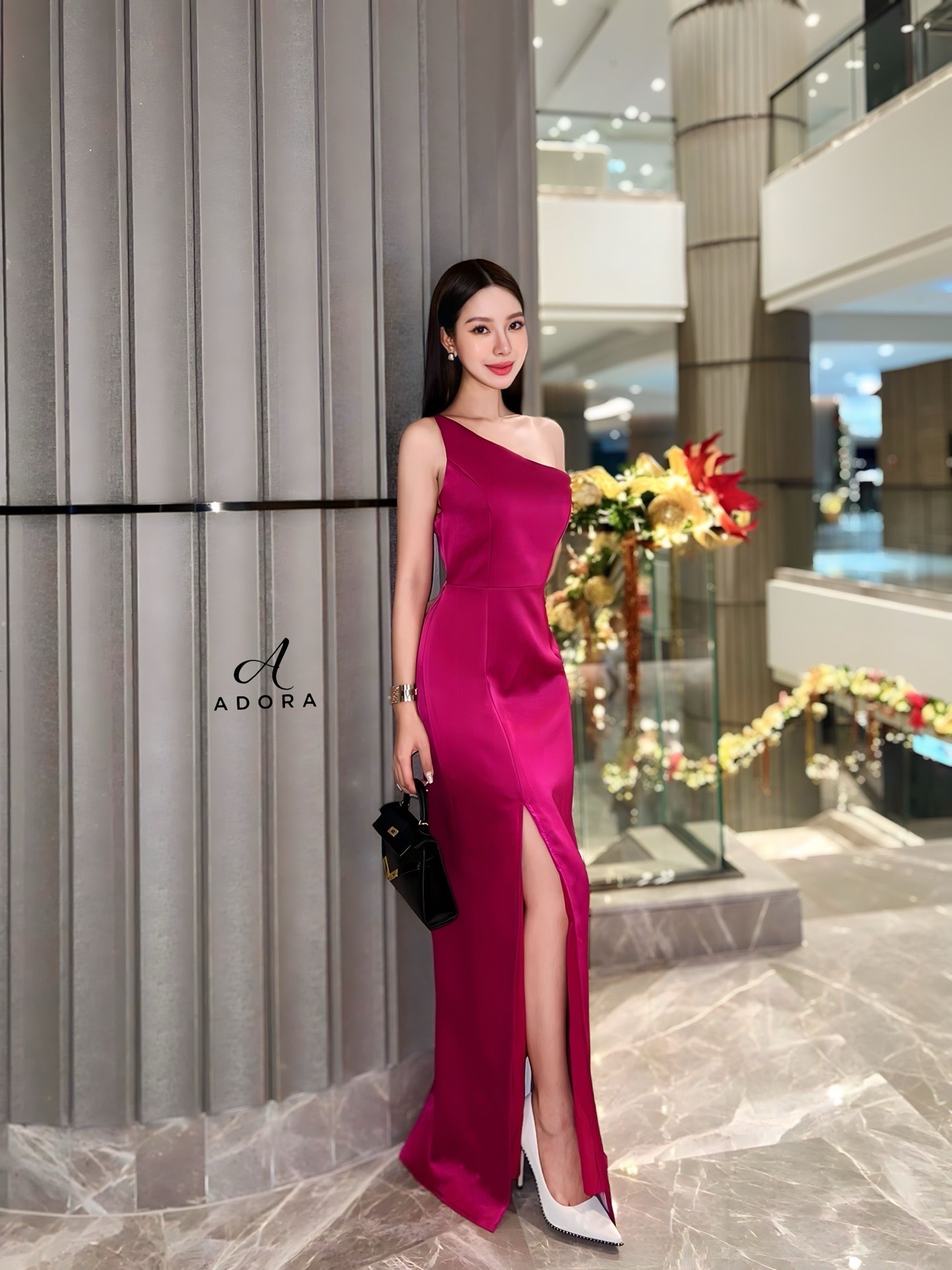Elevate your elegance with this luxurious A D O R A dress! Perfect for weddings, upscale parties, or special occasions, this dress features a stylish asymmetrical shoulder design and a long skirt with a side slit. Crafted from lustrous, premium-quality fabric, it exudes sophistication and glamour. The dress includes an inner lining and a hidden back zipper for a seamless, high-end finish.