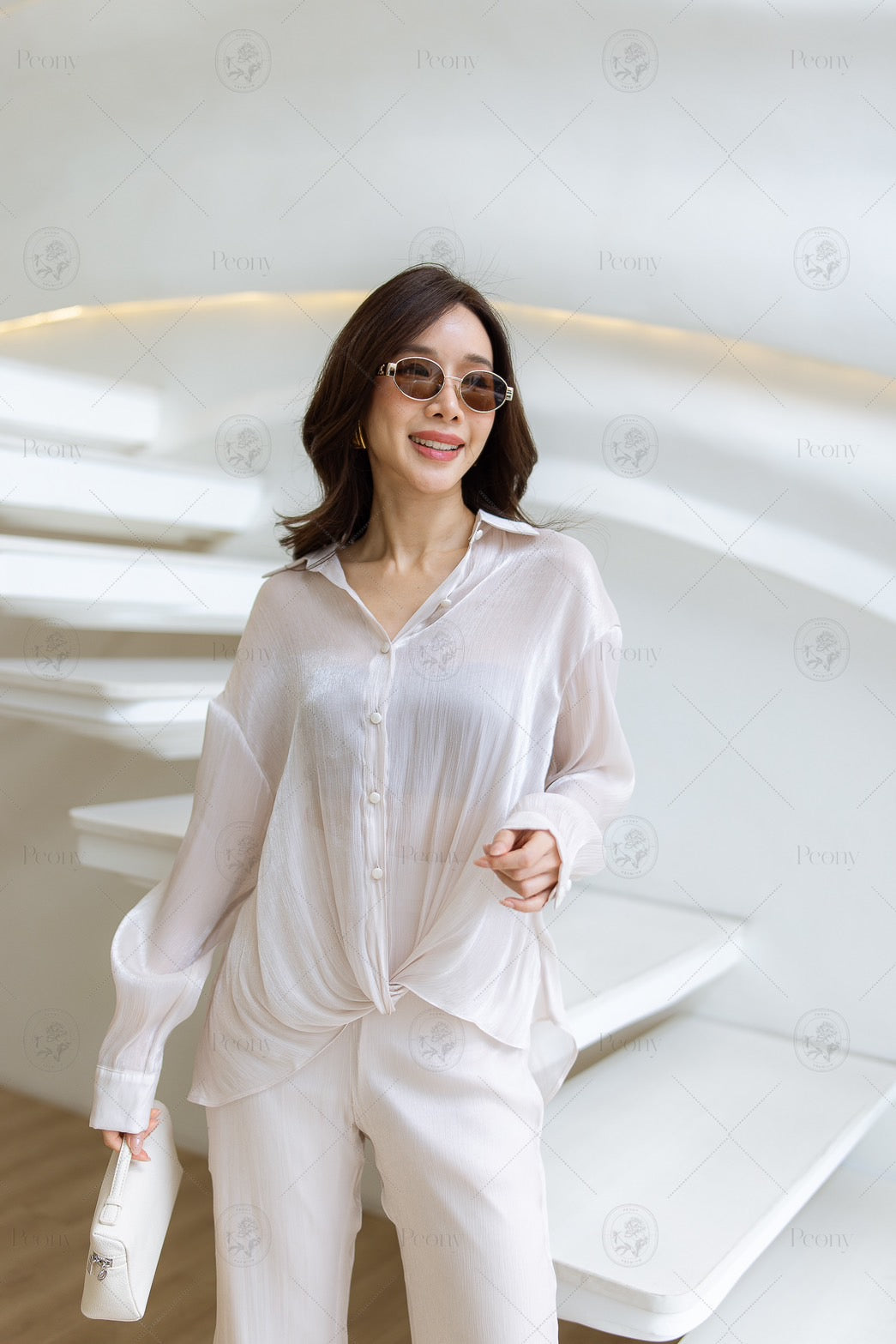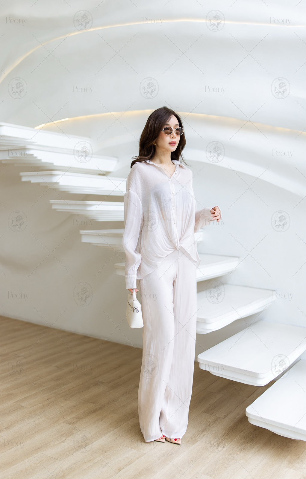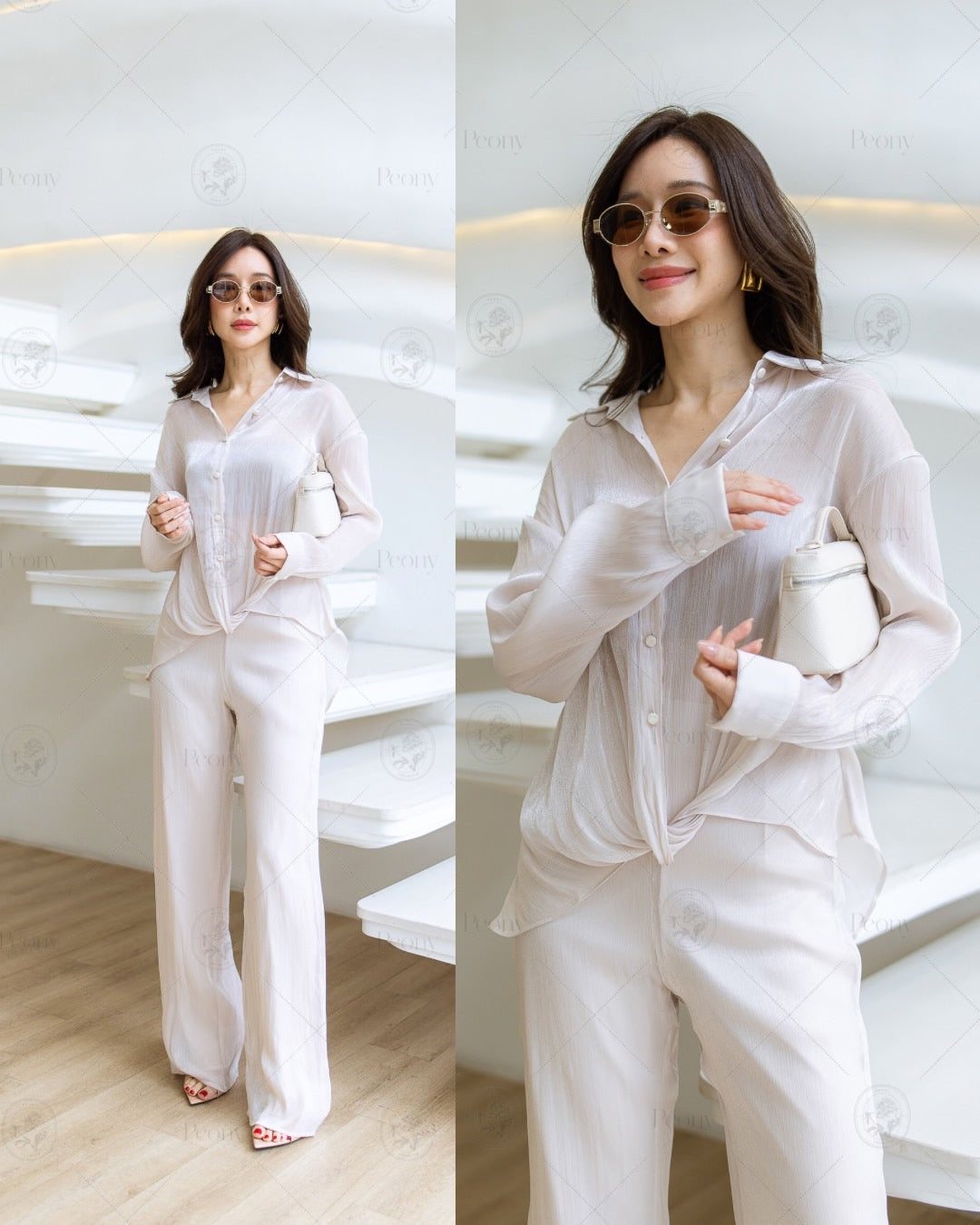 This stunning 2-piece set features a sheer, coated metallic fabric in a soft pink tone—absolutely eye-catching! The loose-fit shirt comes with a stylish front knot detail, paired perfectly with long trousers that are fully lined for comfort and coverage.
