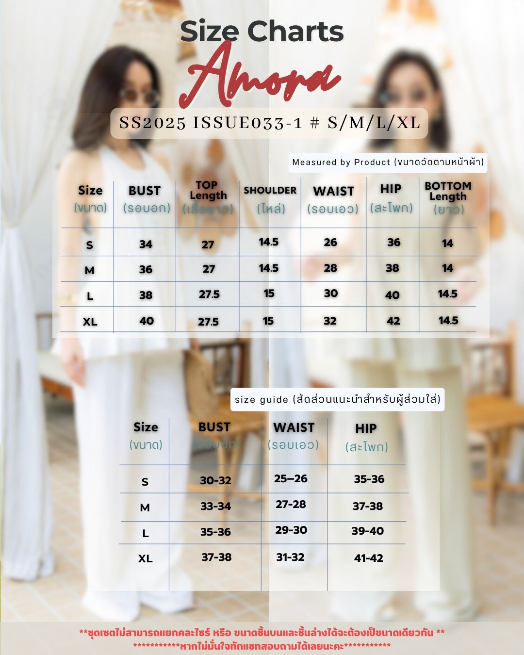 XL = Bust 37–38" / Waist 31–32" / Hips 41–42"