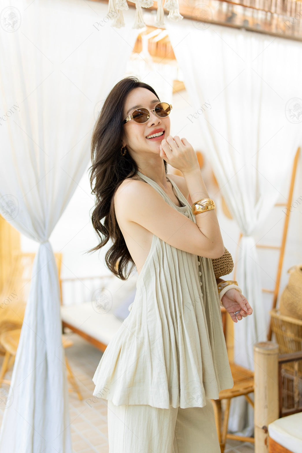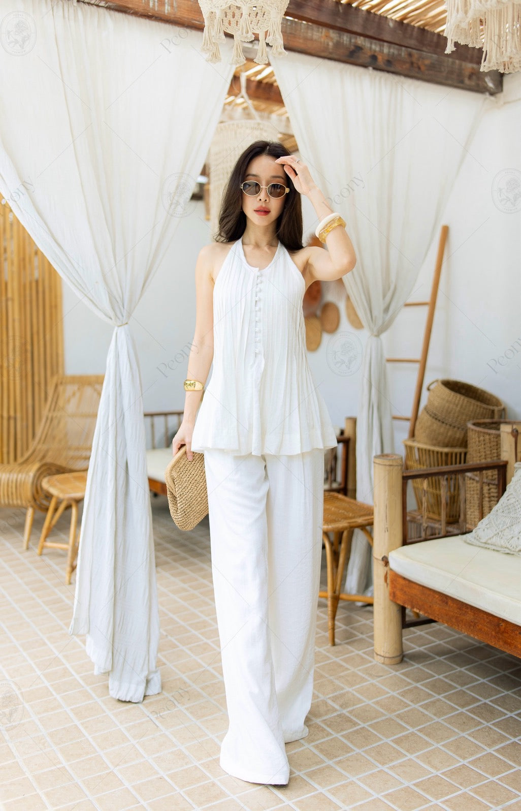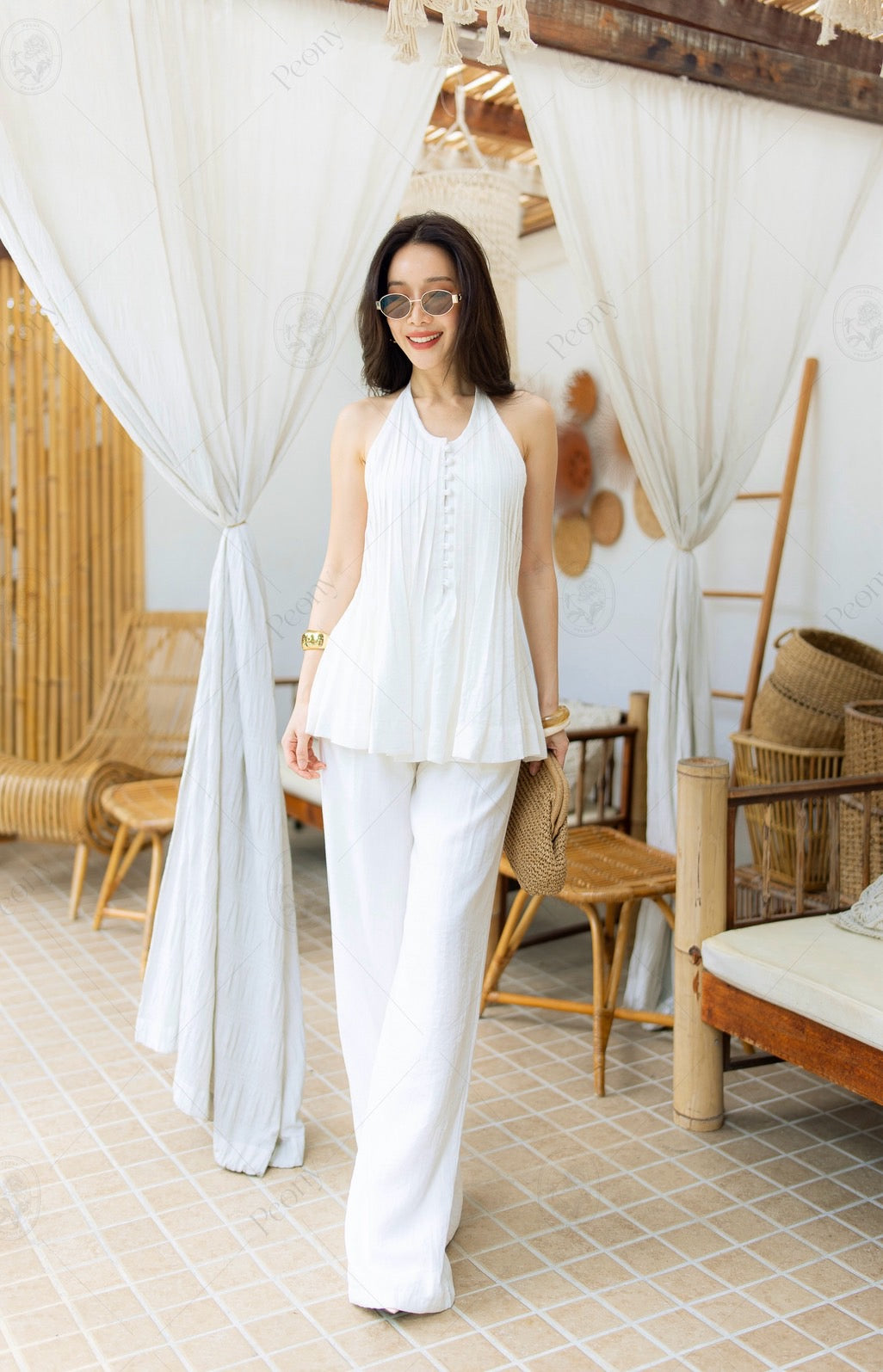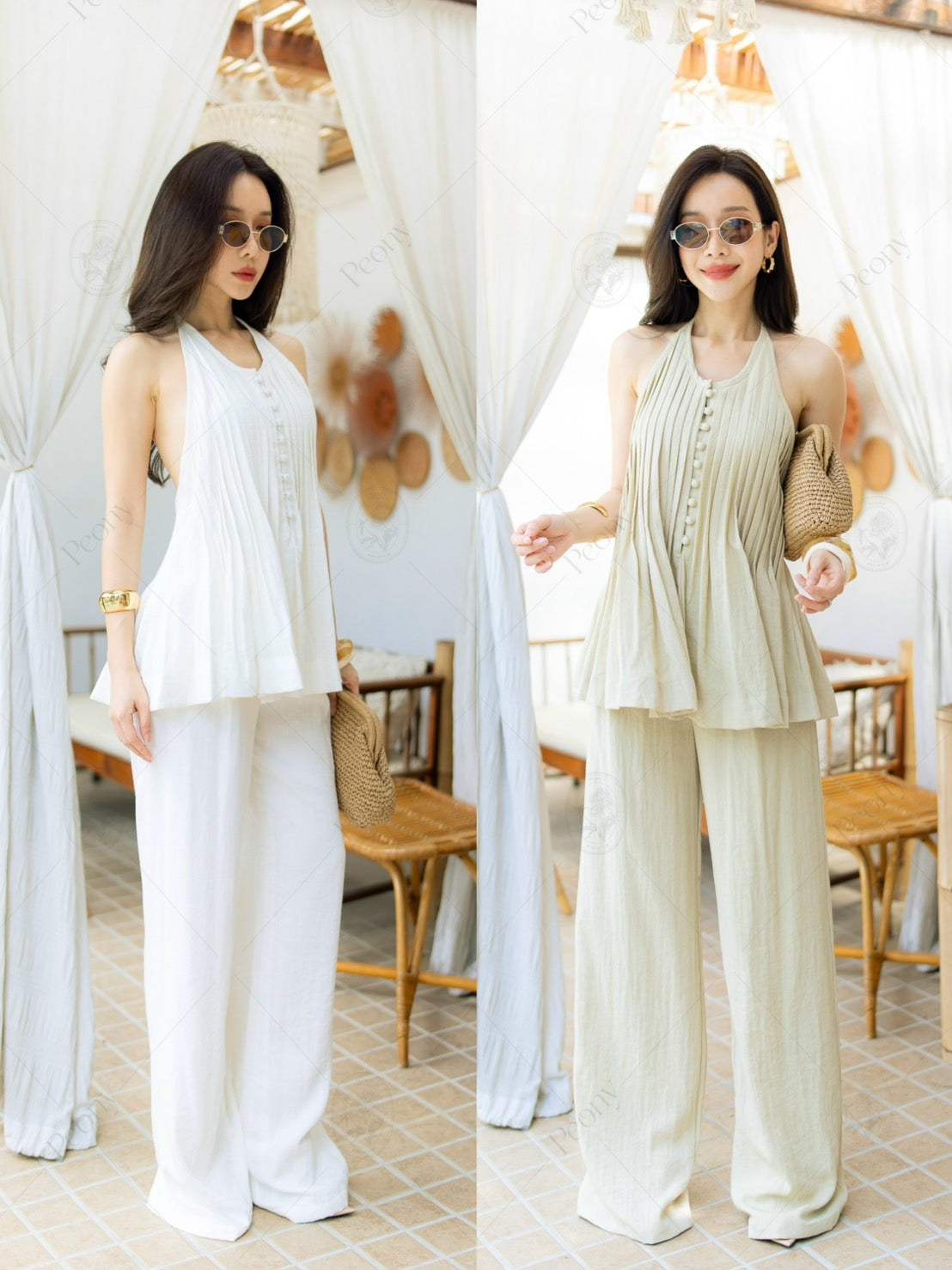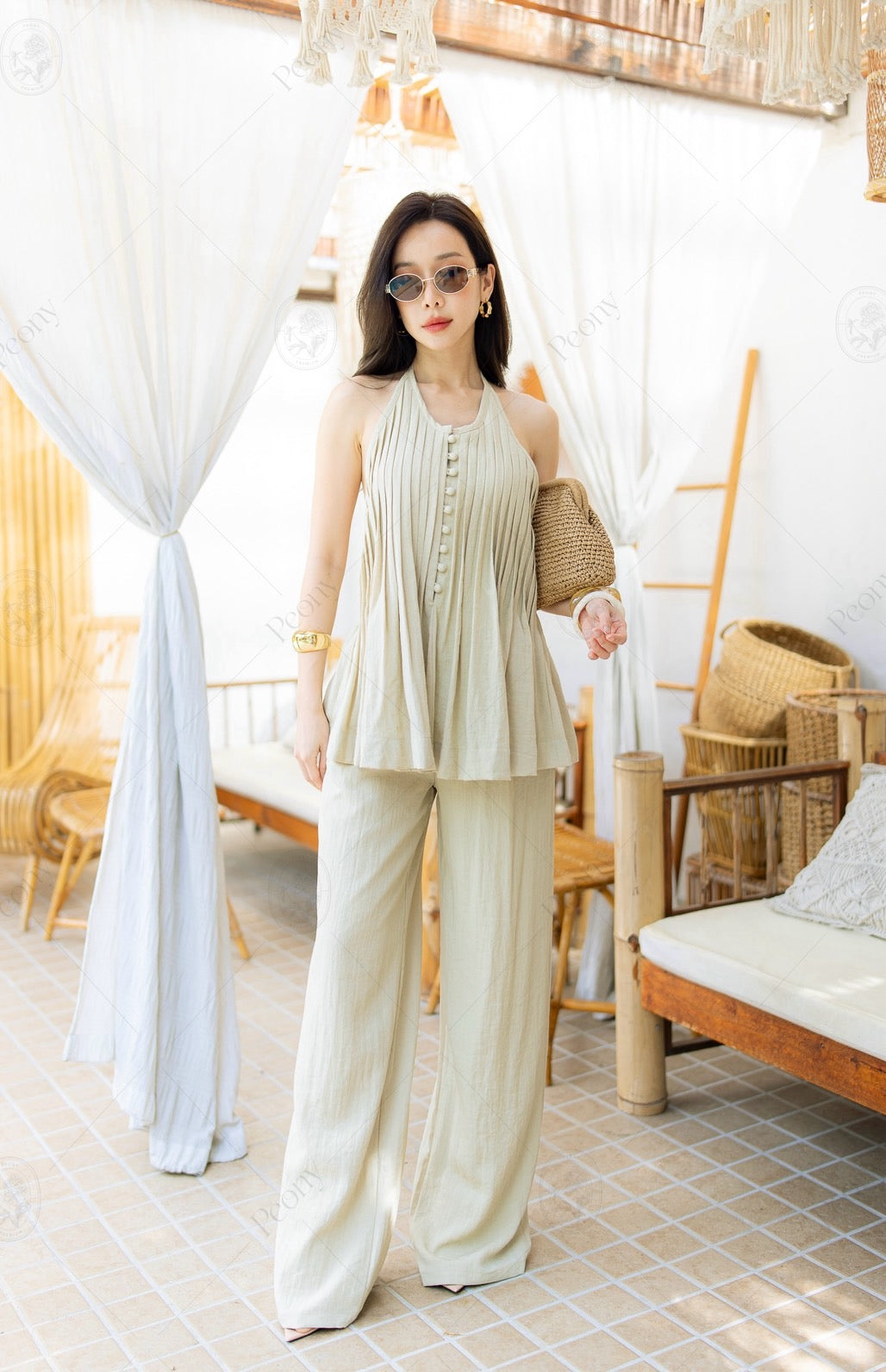 Made from a linen-blend fabric with a unique built-in pattern. Features a halter neck top with front buttons, a cut-out design, and a tie-back detail. Paired with wide-leg high-waisted pants. Comfortable yet stylish—this look is the perfect blend of sexy and sophisticated. A complete outfit that turns heads with elegance. ✨