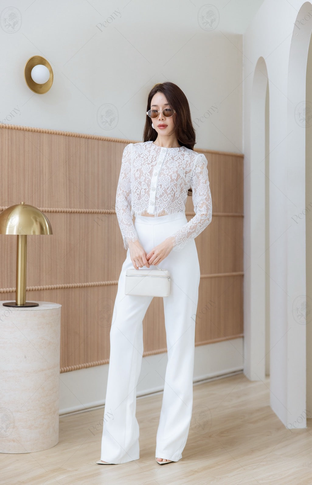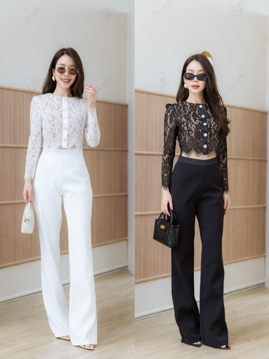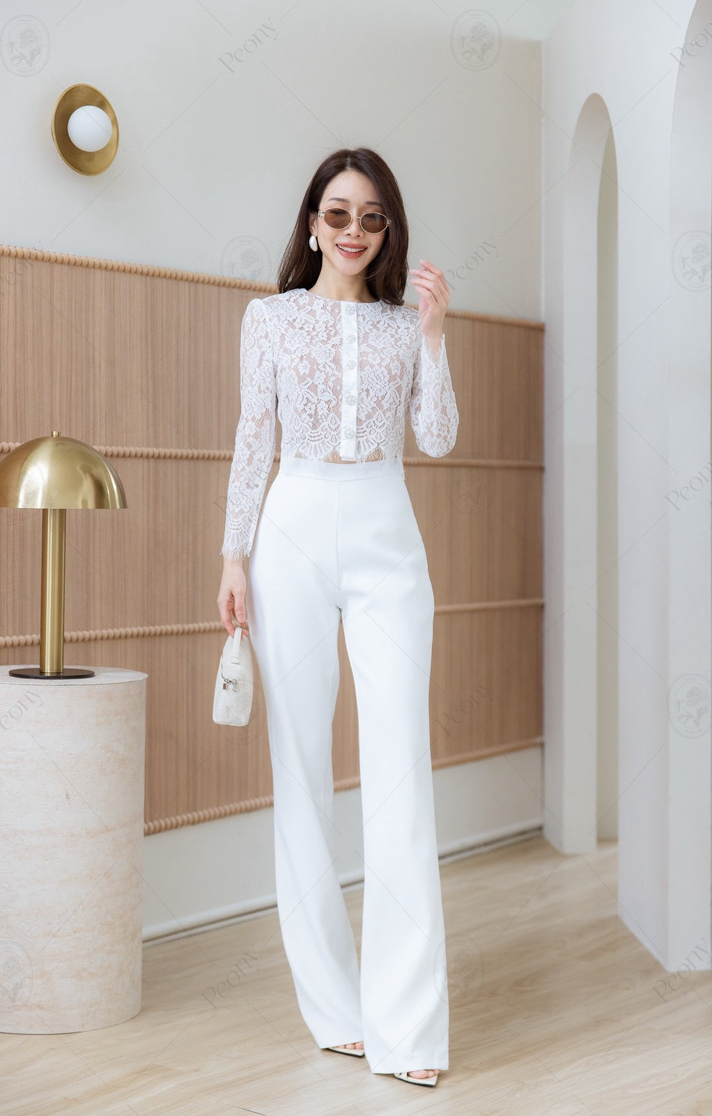 🤍Elegant and classy two-piece set. Features a round-neck lace blouse with front buttons and a nude inner lining. Paired perfectly with high-waisted, tailored long pants for a complete, sophisticated look.