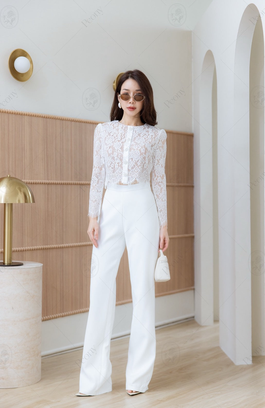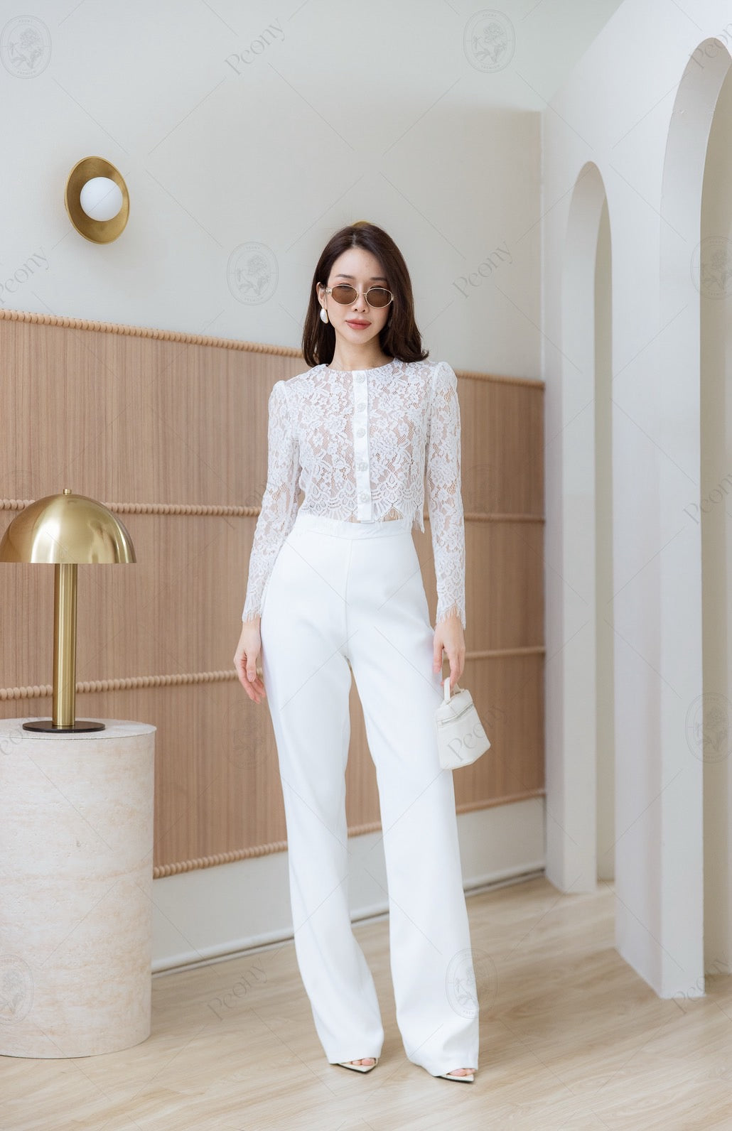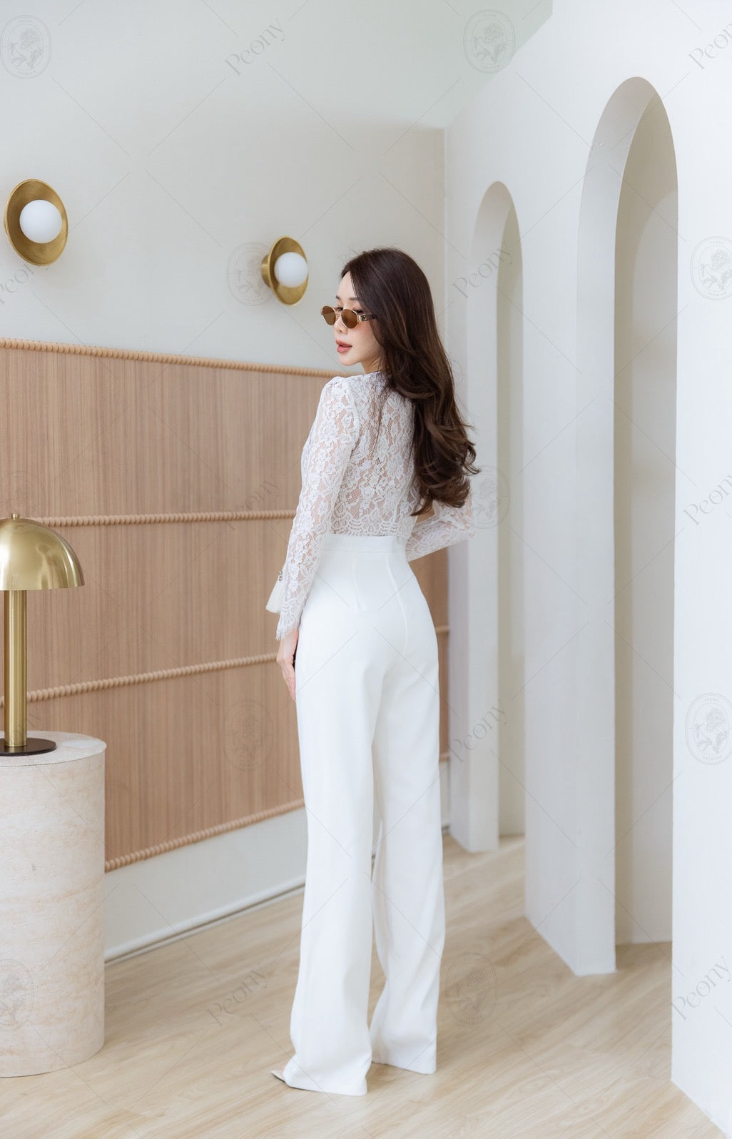 🤍Elegant and classy two-piece set. Features a round-neck lace blouse with front buttons and a nude inner lining. Paired perfectly with high-waisted, tailored long pants for a complete, sophisticated look.
