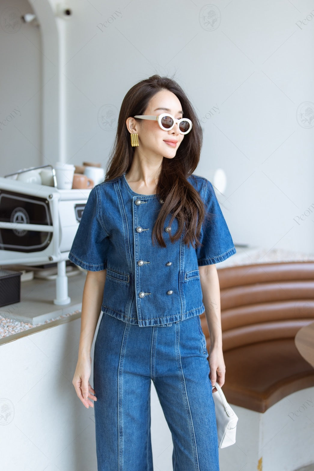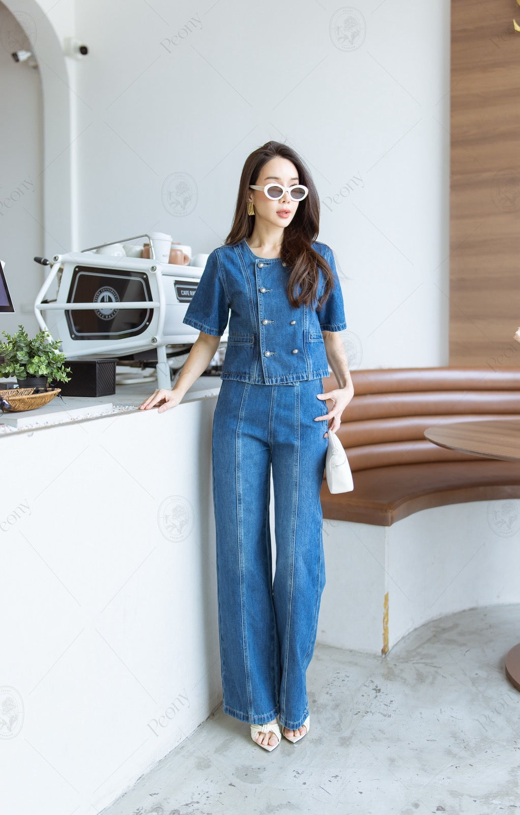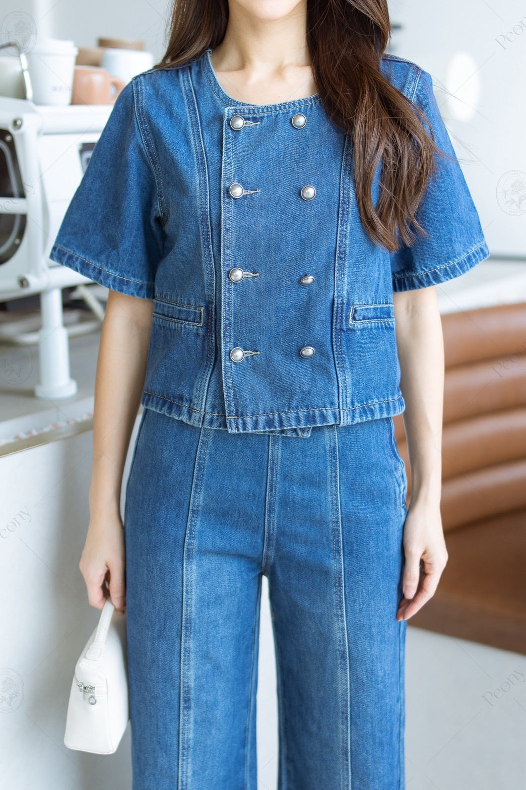 🤍 High-quality denim set. The fabric has a nice weight and is comfortable to wear. The denim color is beautiful. The top features a round neck, front buttons, and short sleeves. It comes as a matching set with long pants. A timeless outfit you can wear again and again.
