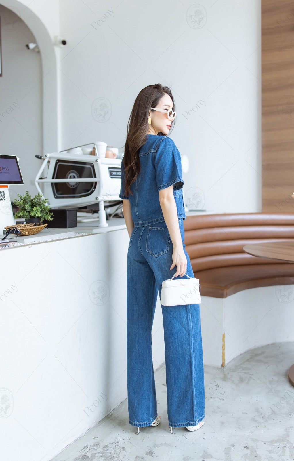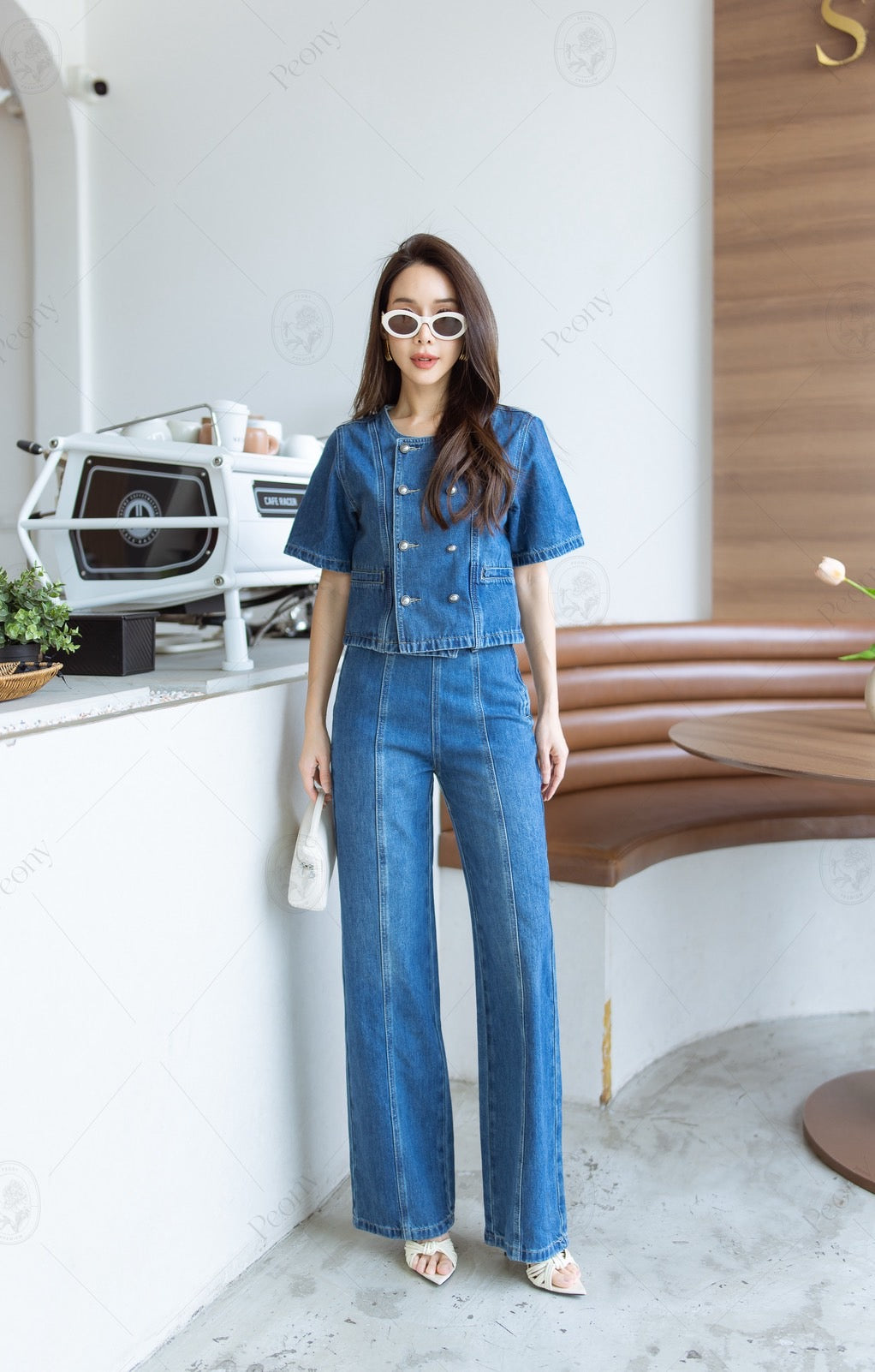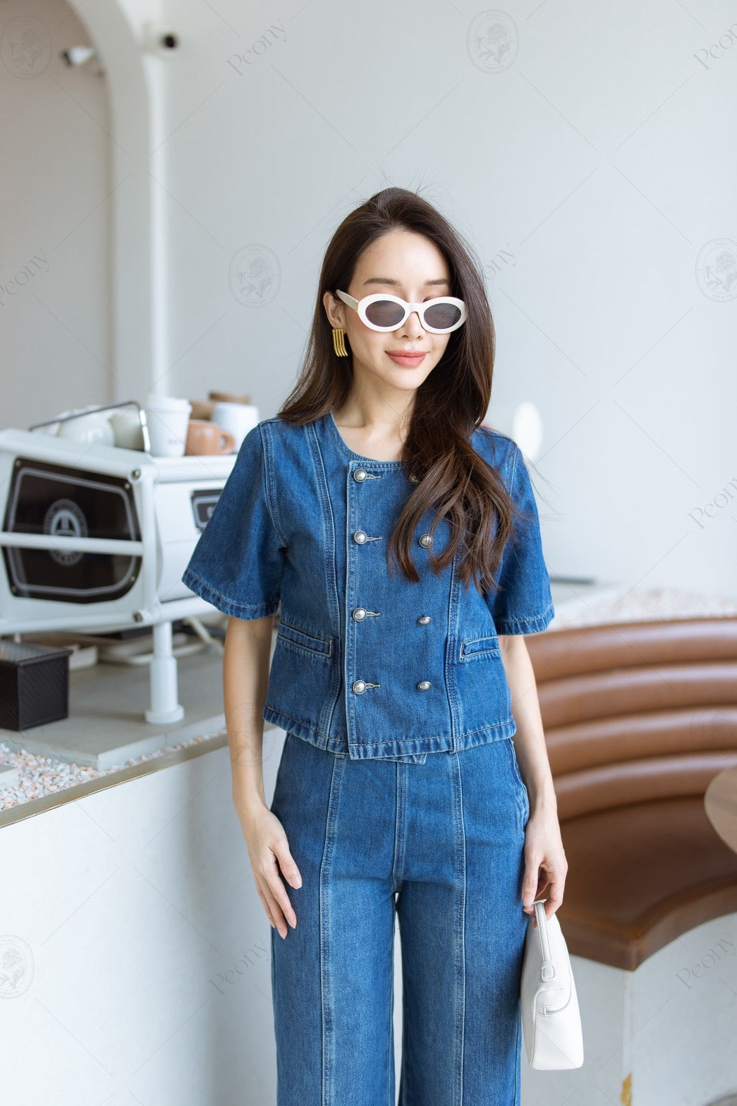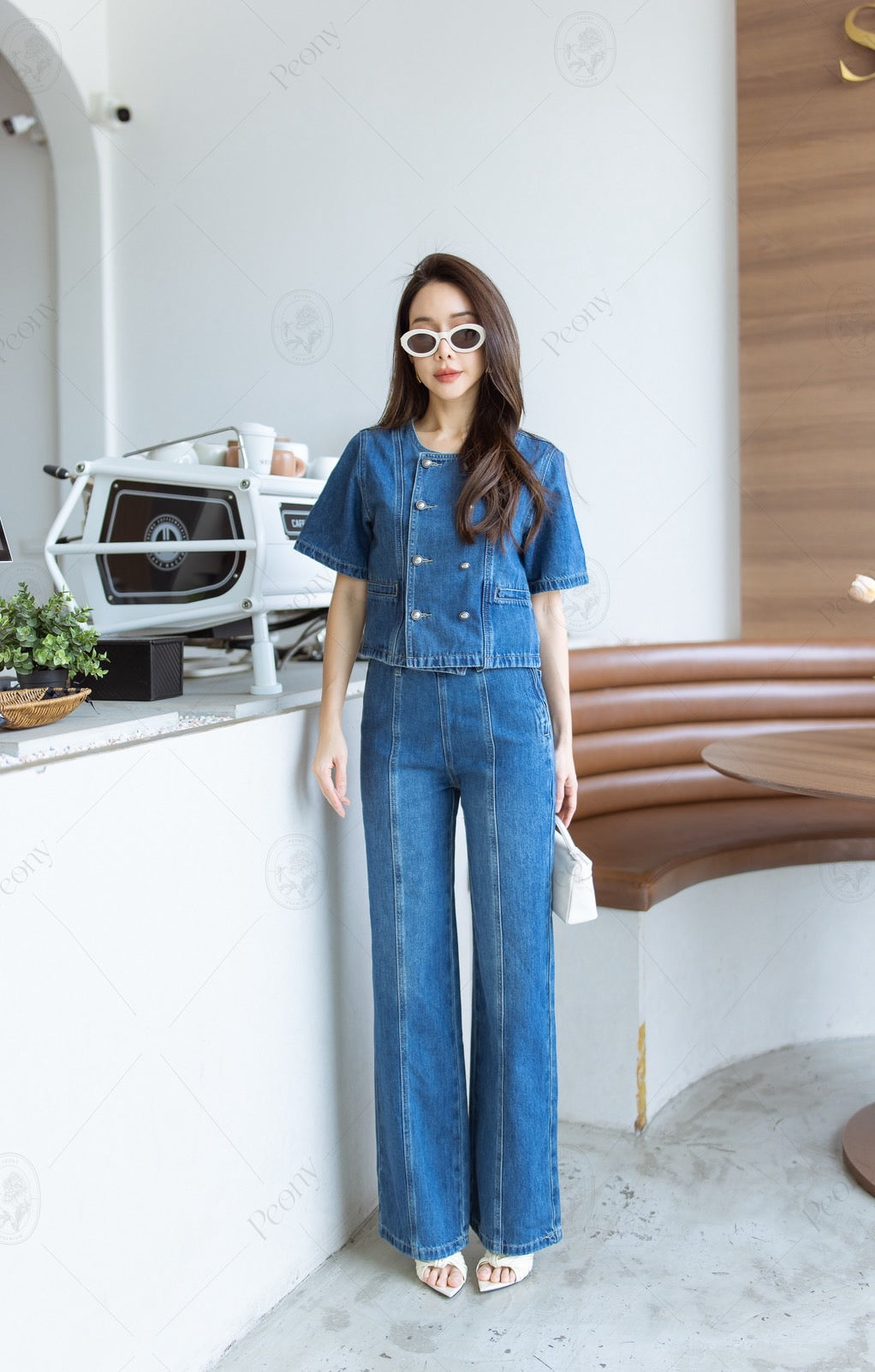 🤍 High-quality denim set. The fabric has a nice weight and is comfortable to wear. The denim color is beautiful. The top features a round neck, front buttons, and short sleeves. It comes as a matching set with long pants. A timeless outfit you can wear again and again.