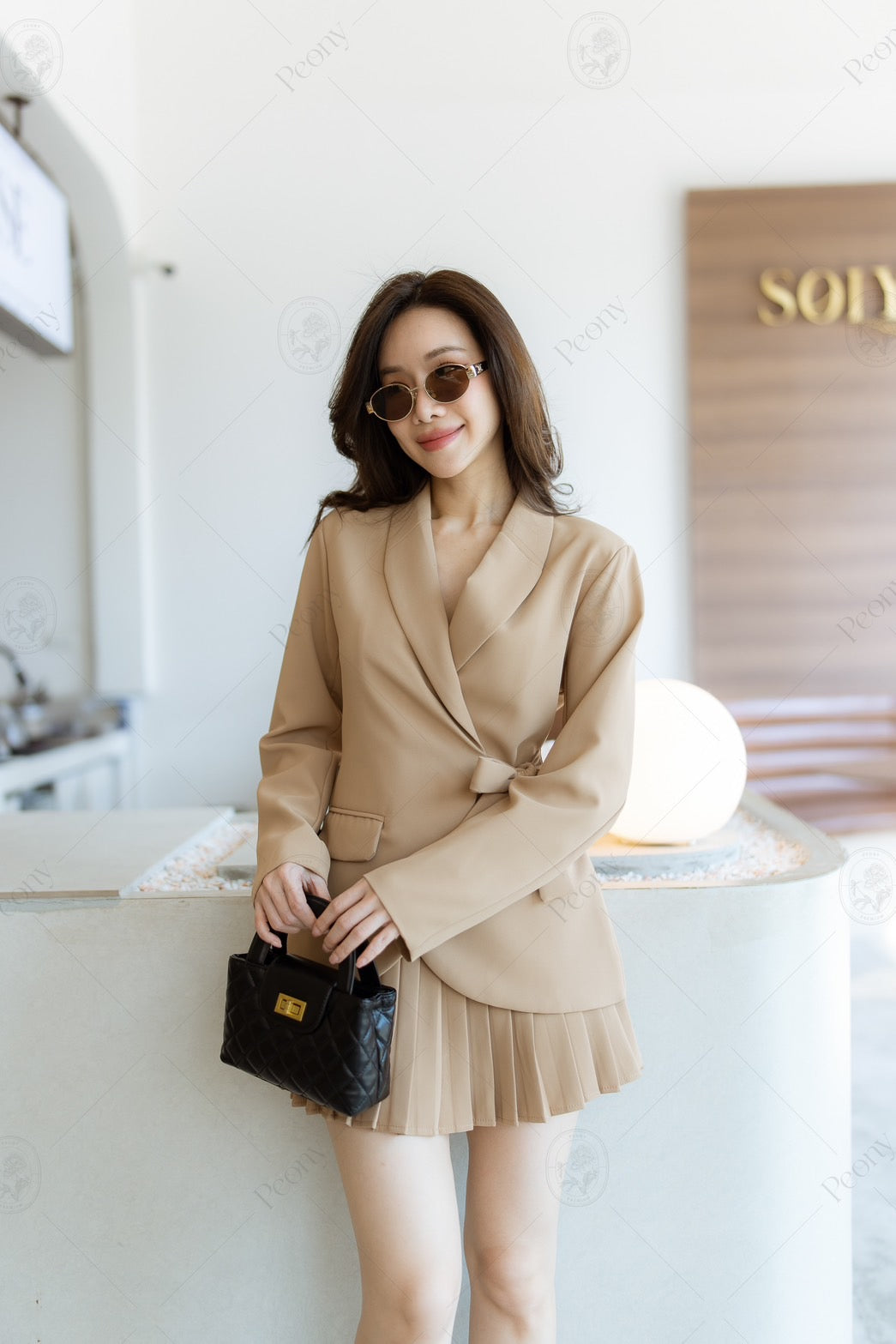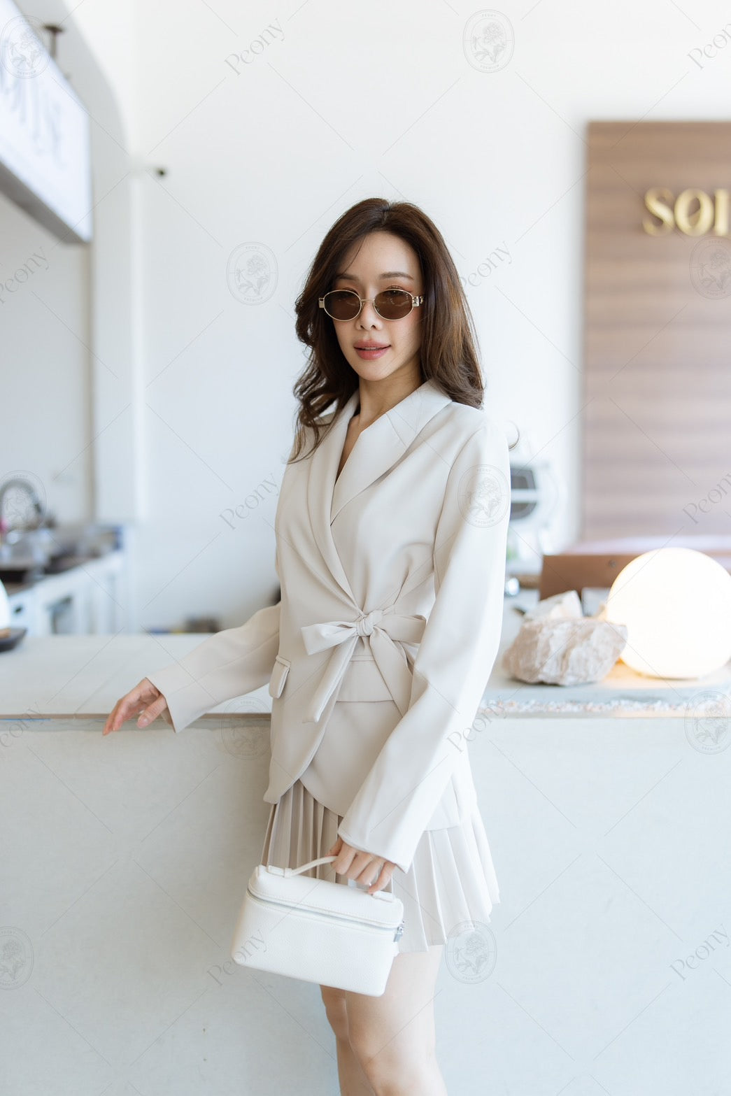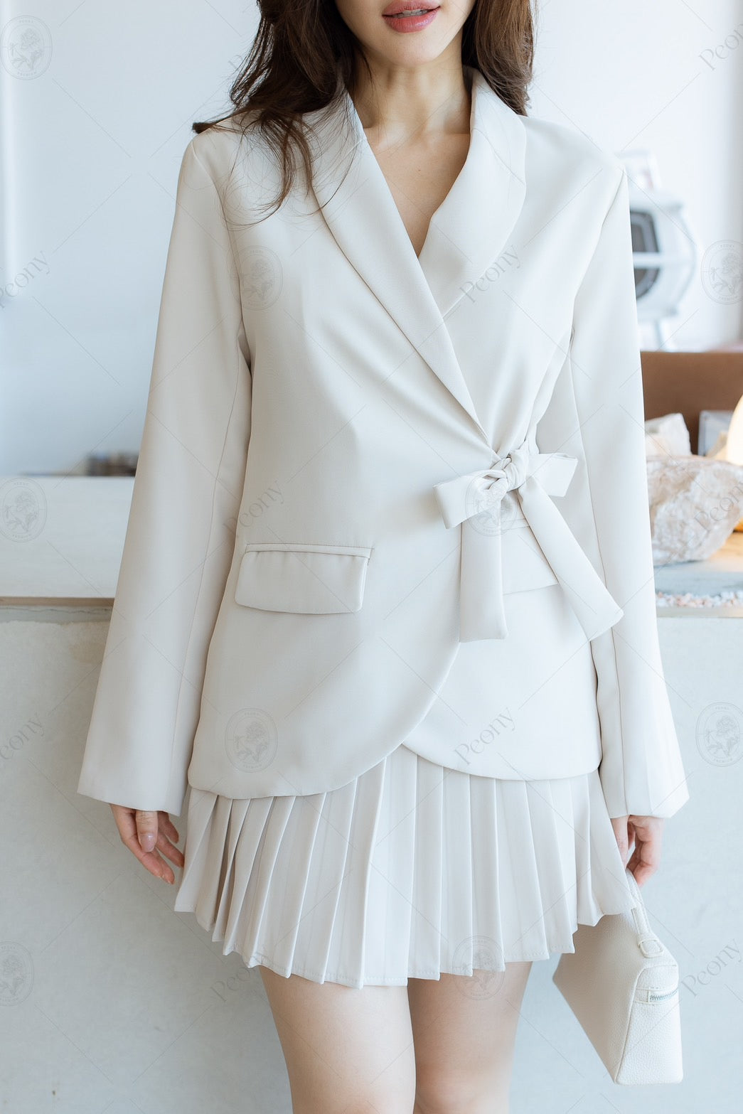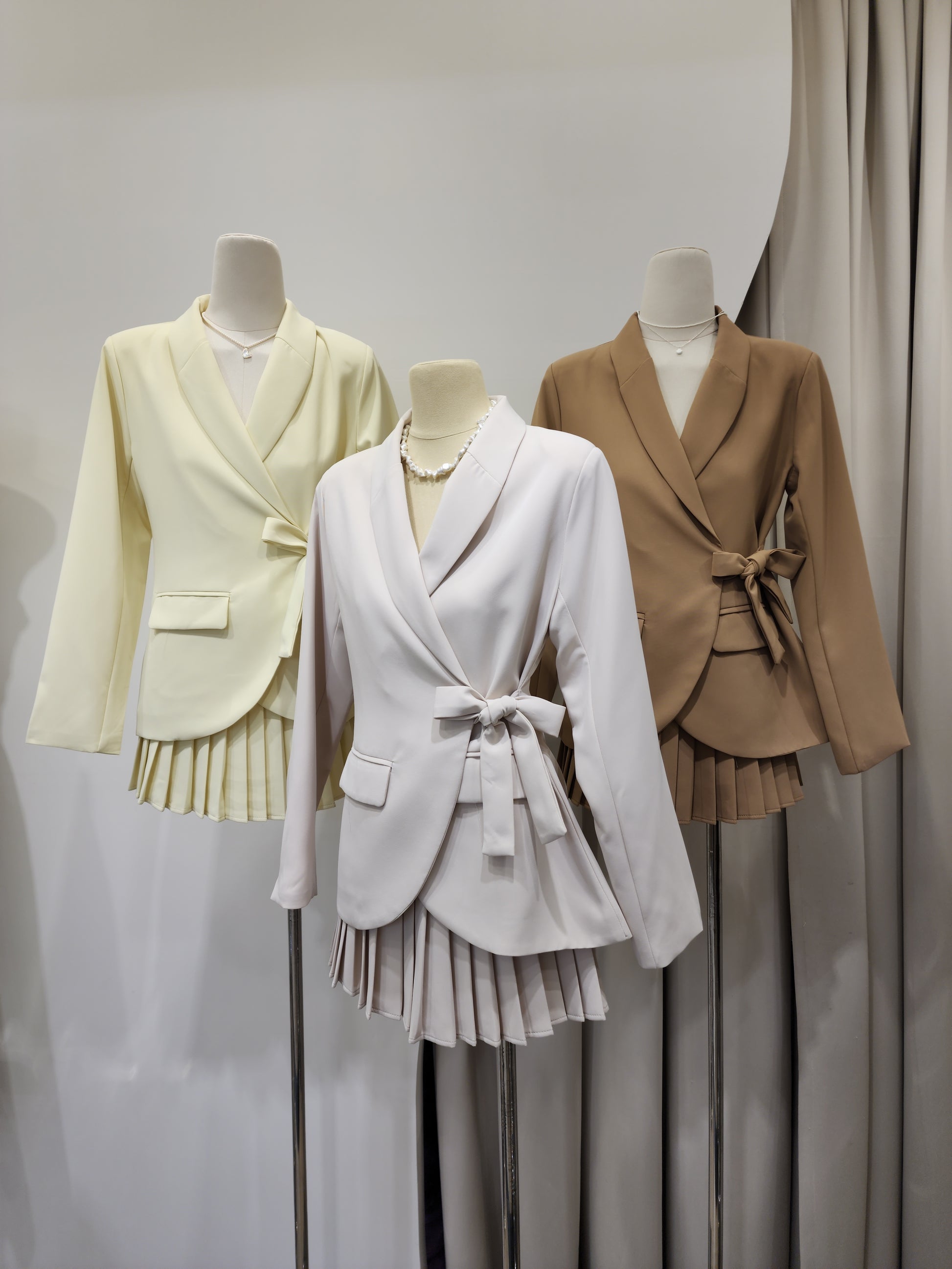 🤍 Presenting a refined coordinated set featuring a tailored long-sleeve blazer with a side-tie detail, offering a sleek and structured silhouette. The look is completed with a pleated skirt that adds movement and elegance. Thoughtfully designed for both style and versatility, this ensemble delivers a polished appearance suitable for any occasion.