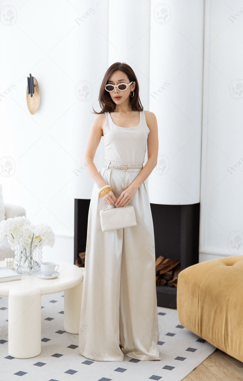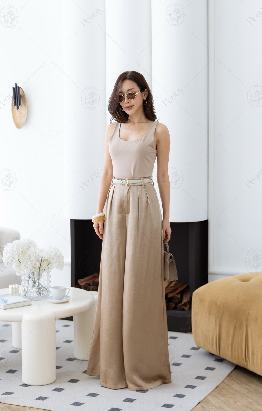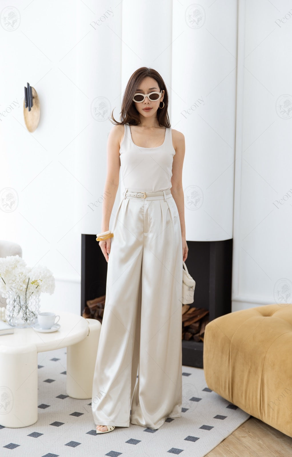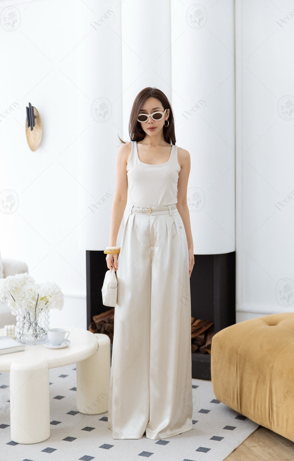 Paired with straight-leg satin silk trousers that fall beautifully, complete with a matching belt.