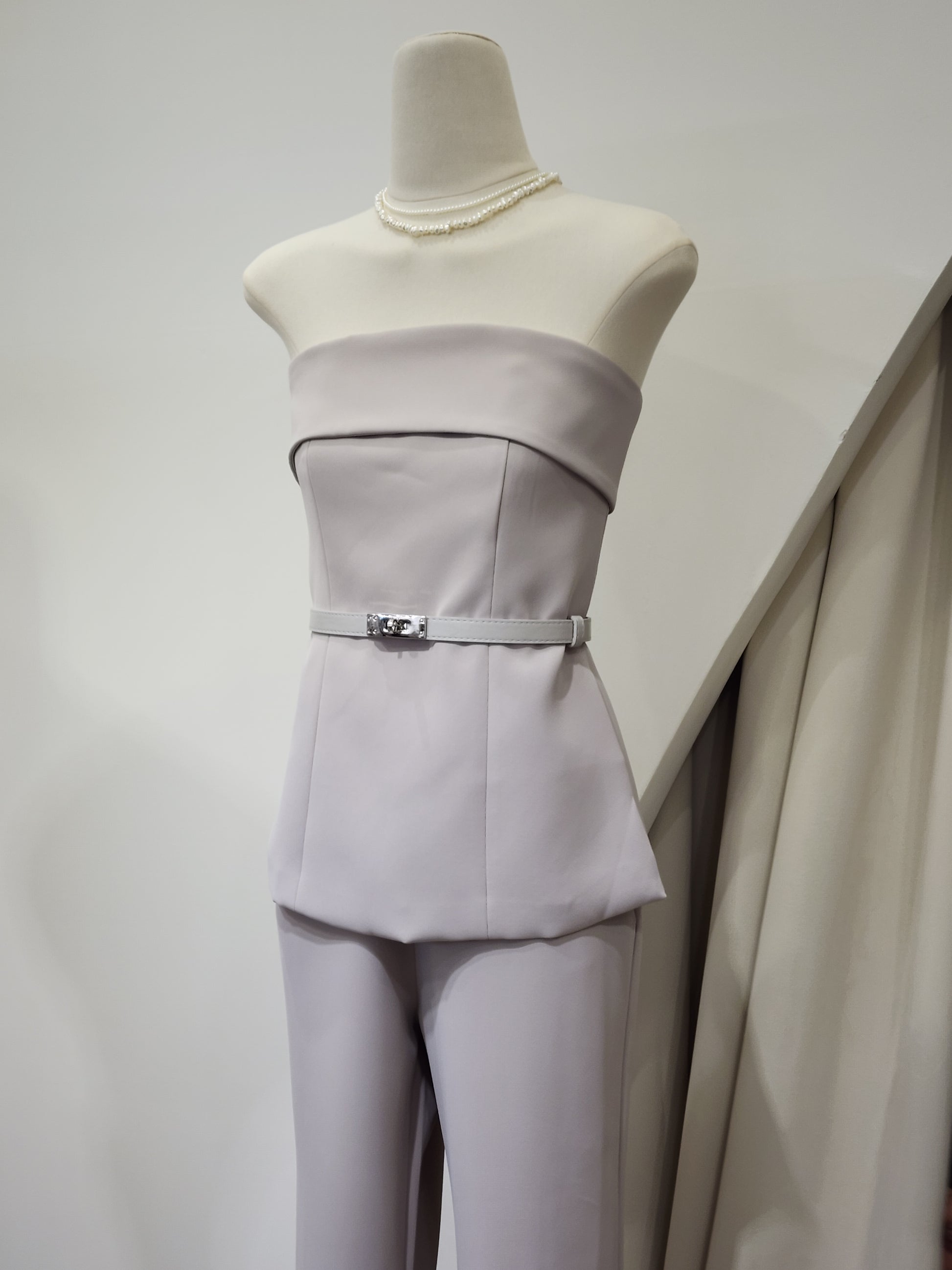Presenting a sophisticated two-piece set, thoughtfully designed for a modern and confident look. Crafted from high-quality solid-tone fabric, the set features a structured bandeau top with refined folded-edge detailing and subtle side slits. The top includes built-in light padding and an inner anti-slip band to ensure comfort and a secure fit. It is paired with straight-leg trousers tailored to perfection, fully lined for added structure and comfort. The ensemble is completed with a matching belt, offering a cohesive and polished appearance—ideal for both professional and semi-formal occasions.
