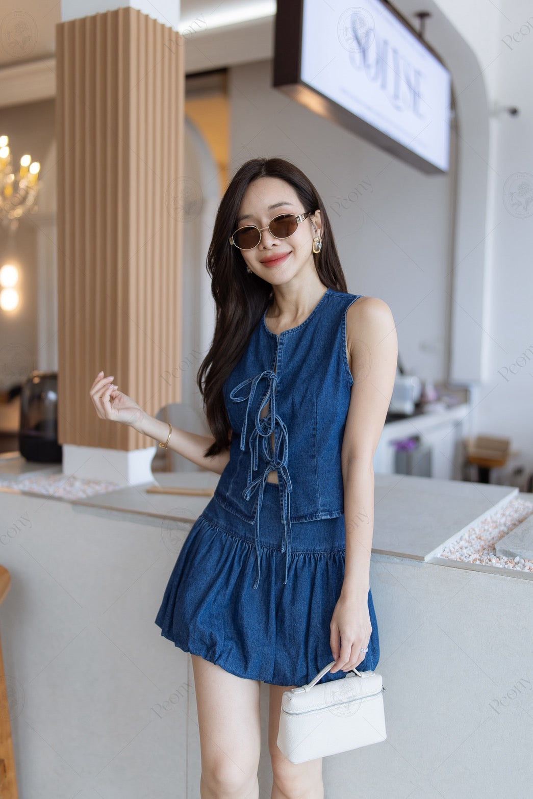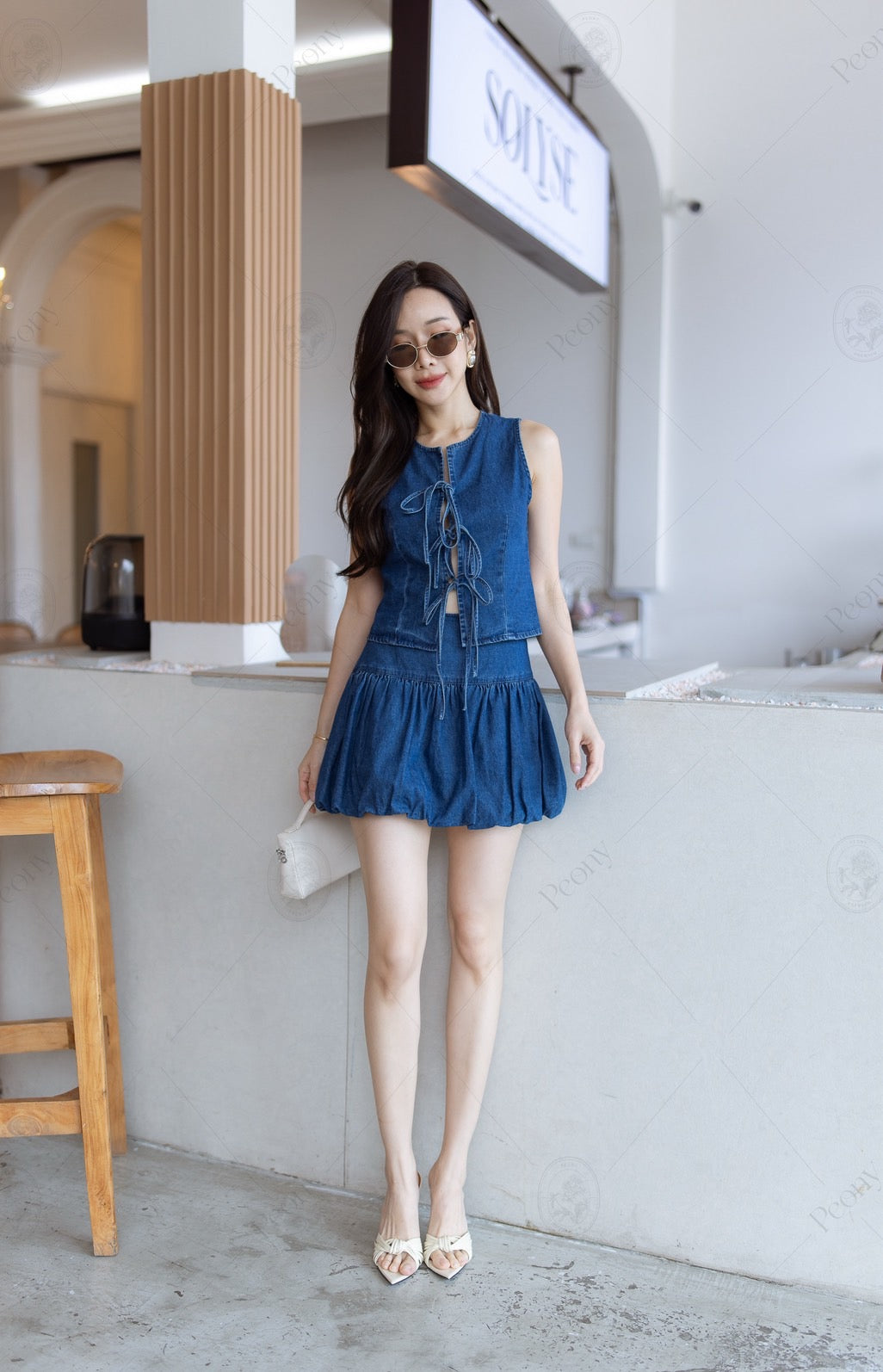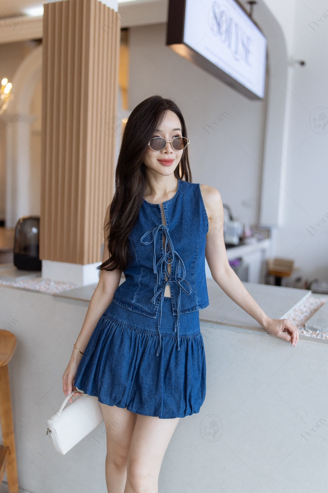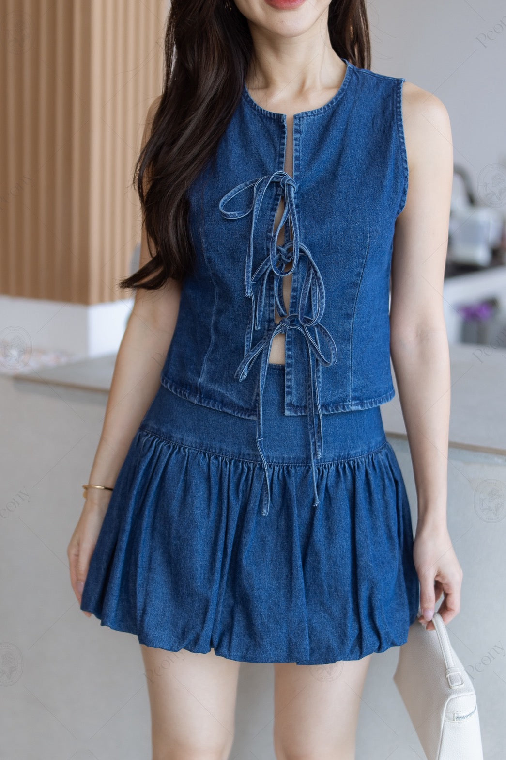 The top features a classic round neckline with a front bow tie detail, perfectly paired with a balloon skirt for a sweet, trendy look.