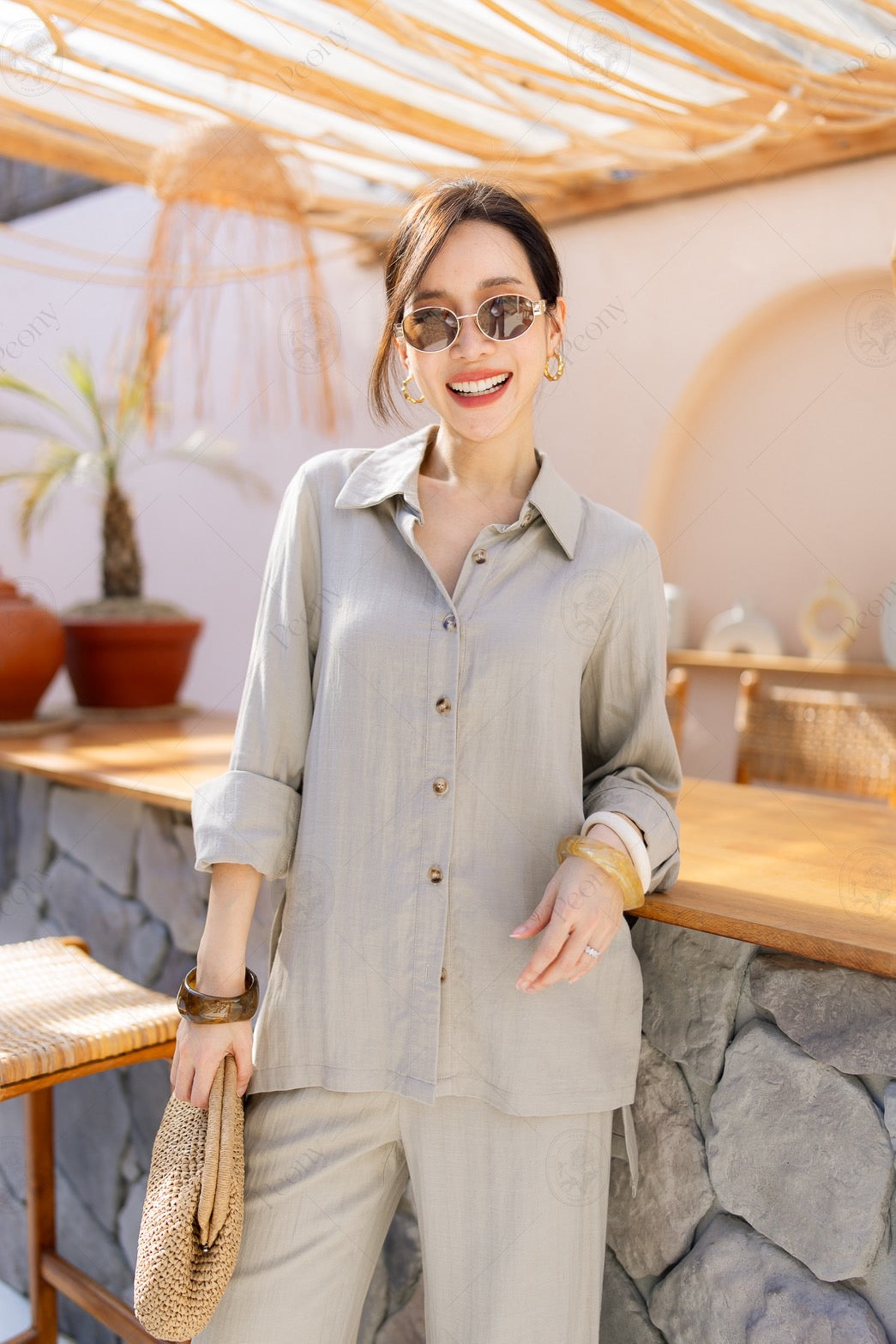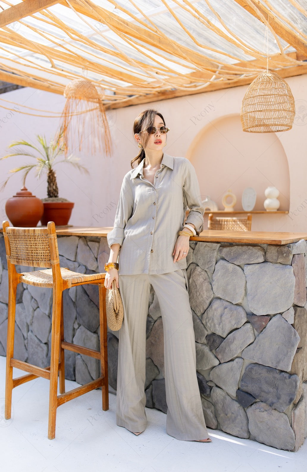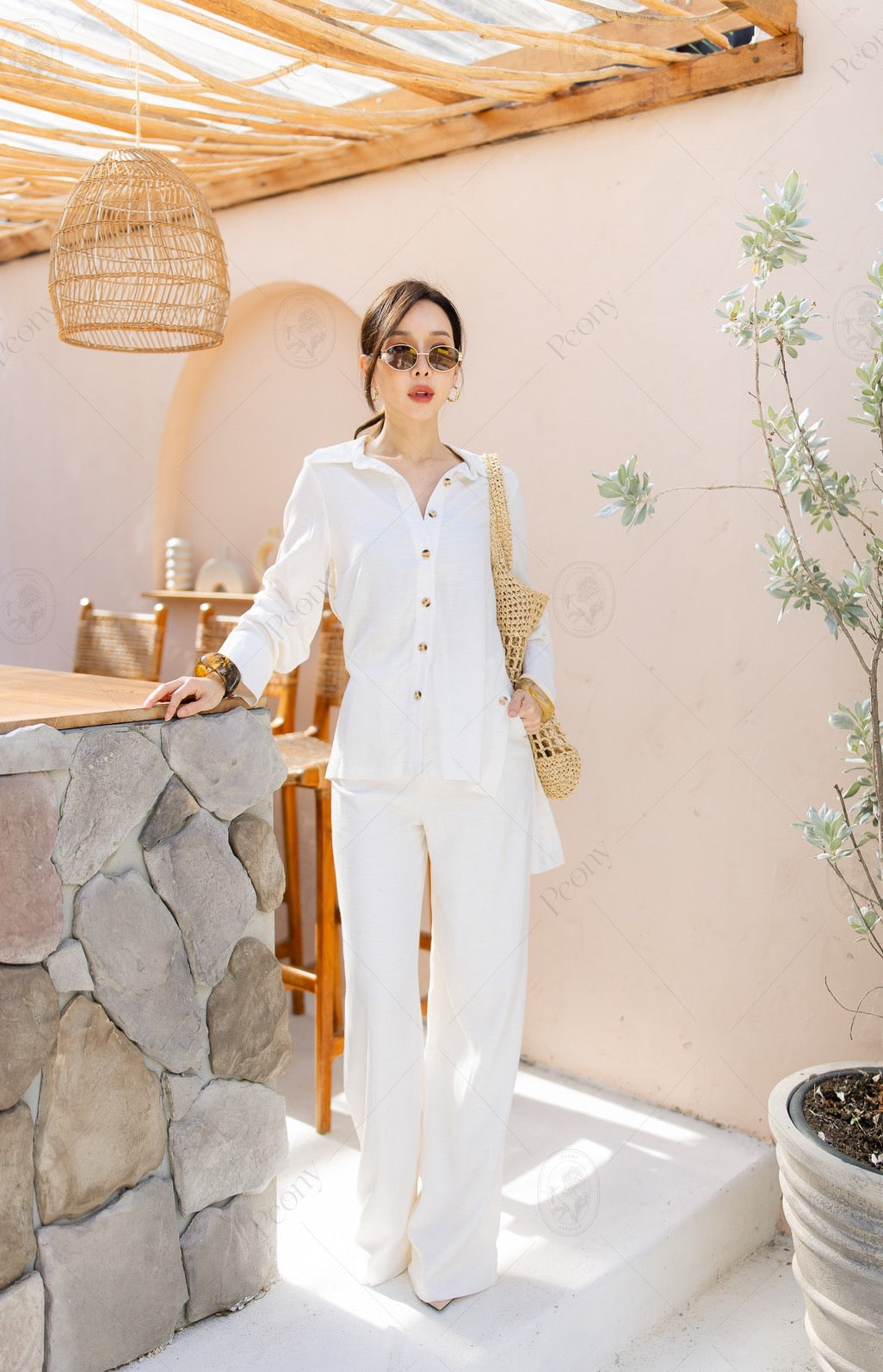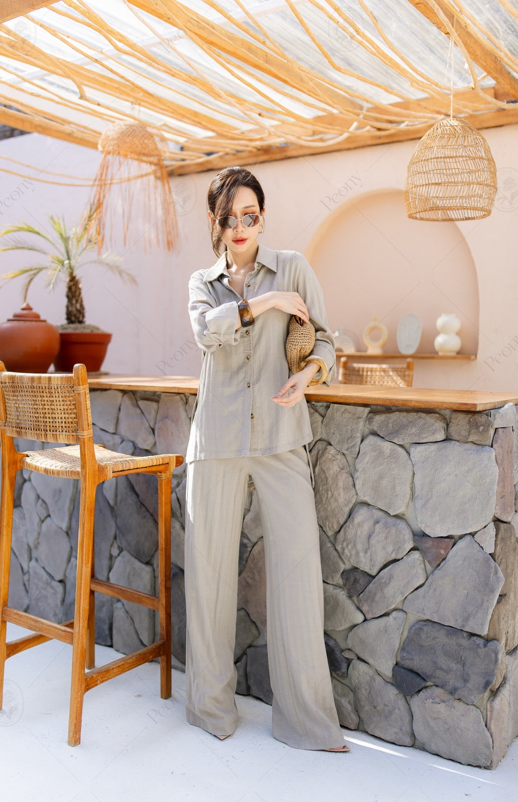๐ค A linen-blend set featuring a distinctive woven texture. The top is a relaxed-fit long-sleeve shirt with front and side button details, paired with straight-leg long pants. A stylish, comfortable set perfect for any occasion.