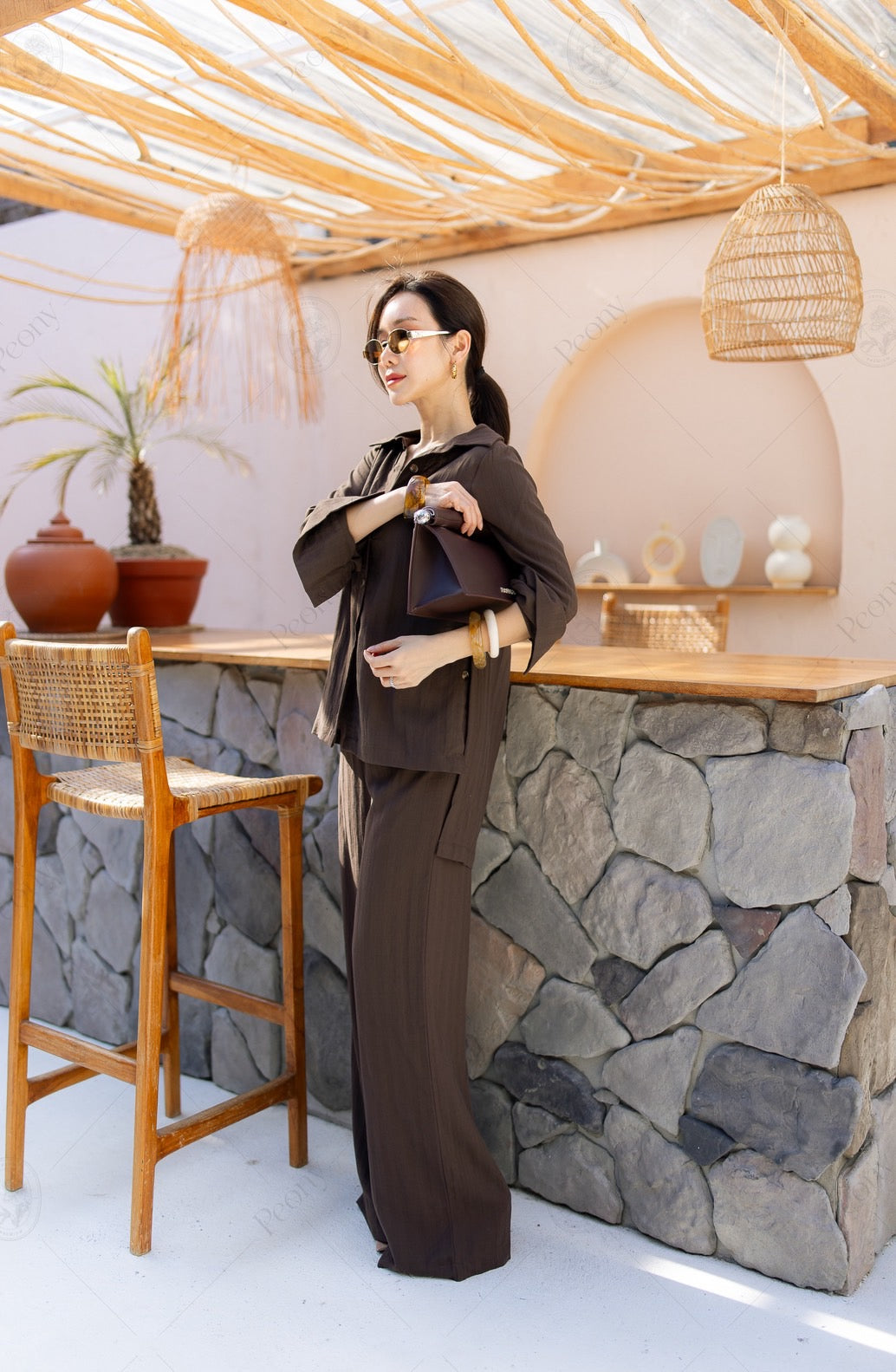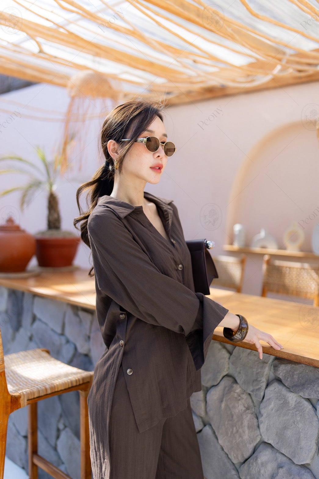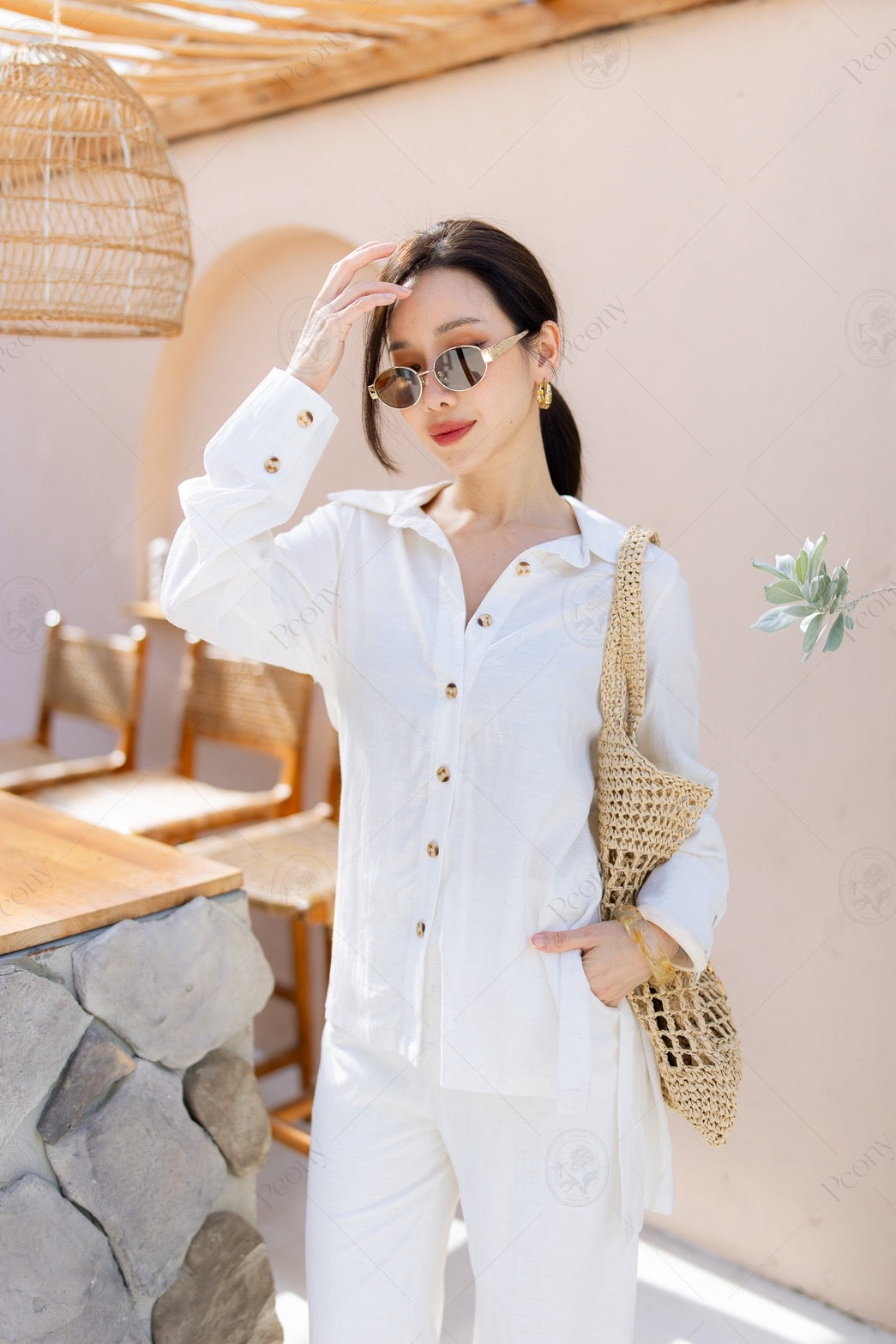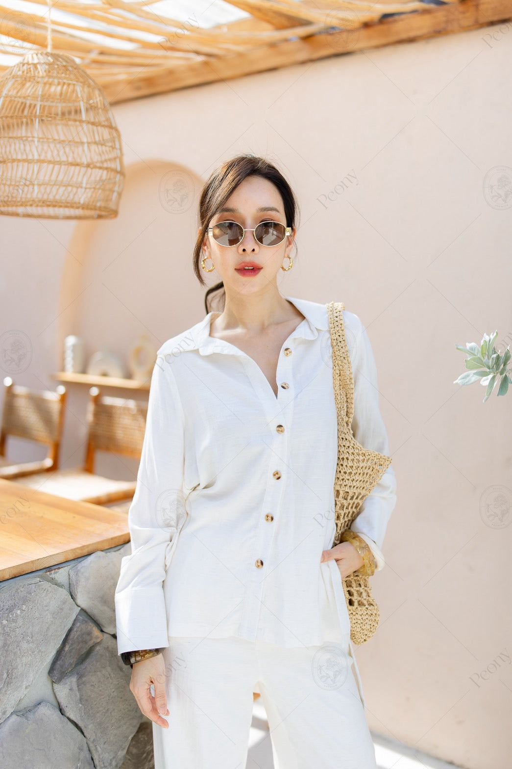 ๐ค A linen-blend set featuring a distinctive woven texture. The top is a relaxed-fit long-sleeve shirt with front and side button details, paired with straight-leg long pants. A stylish, comfortable set perfect for any occasion.