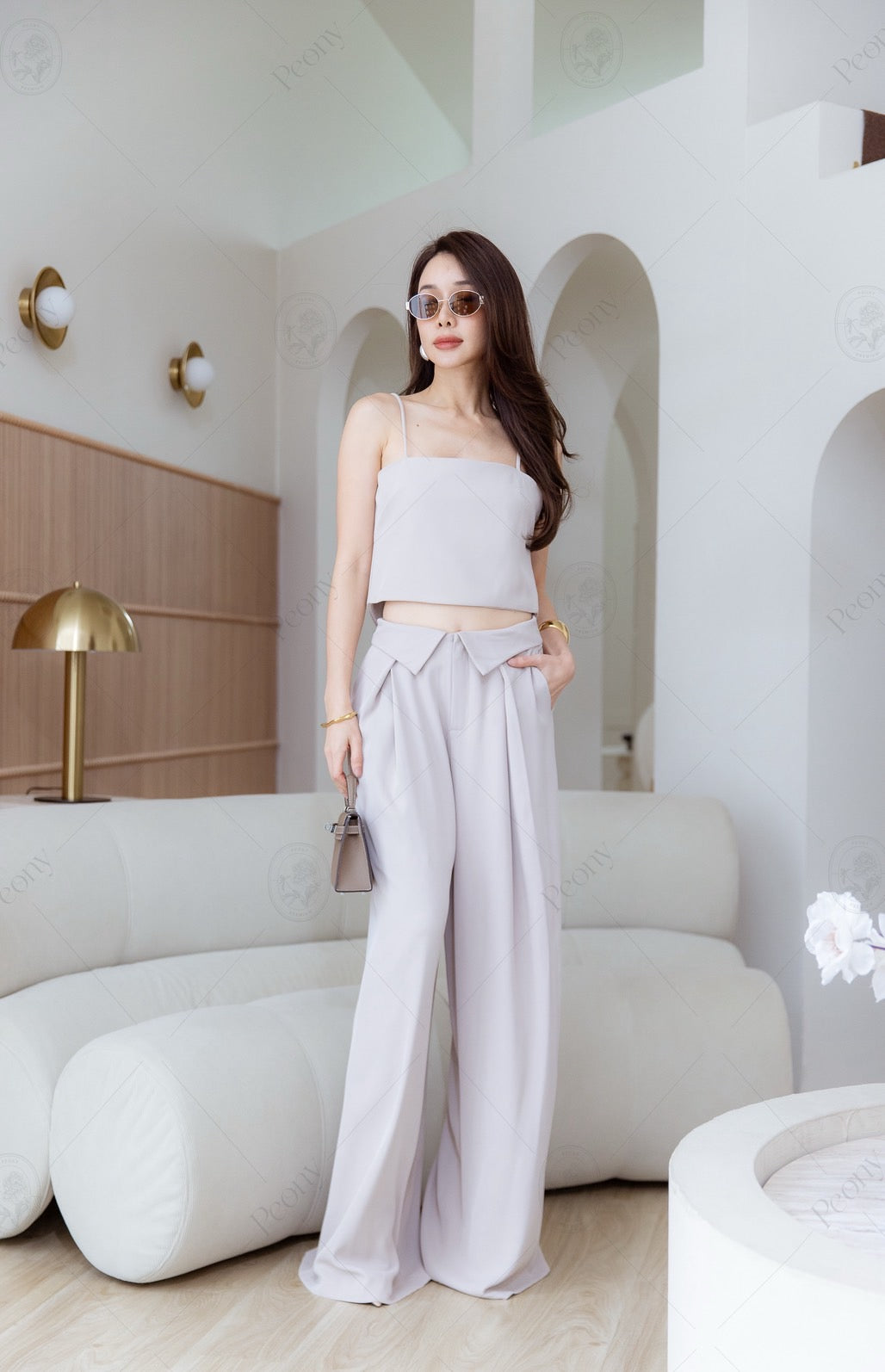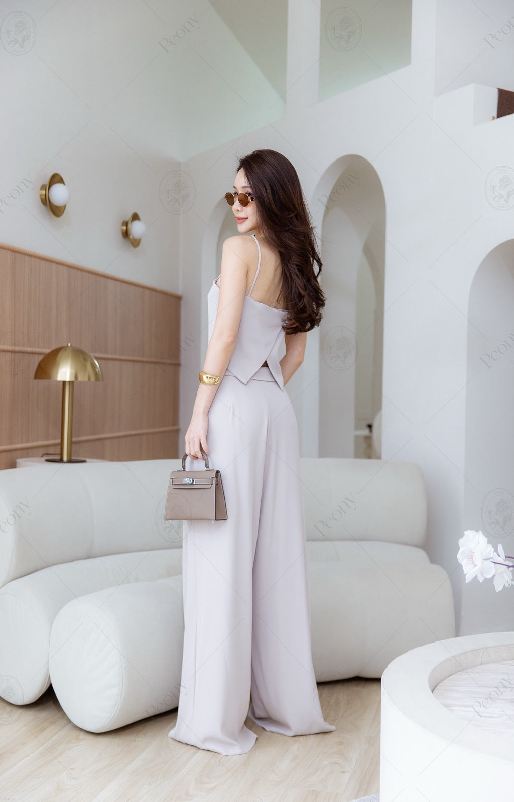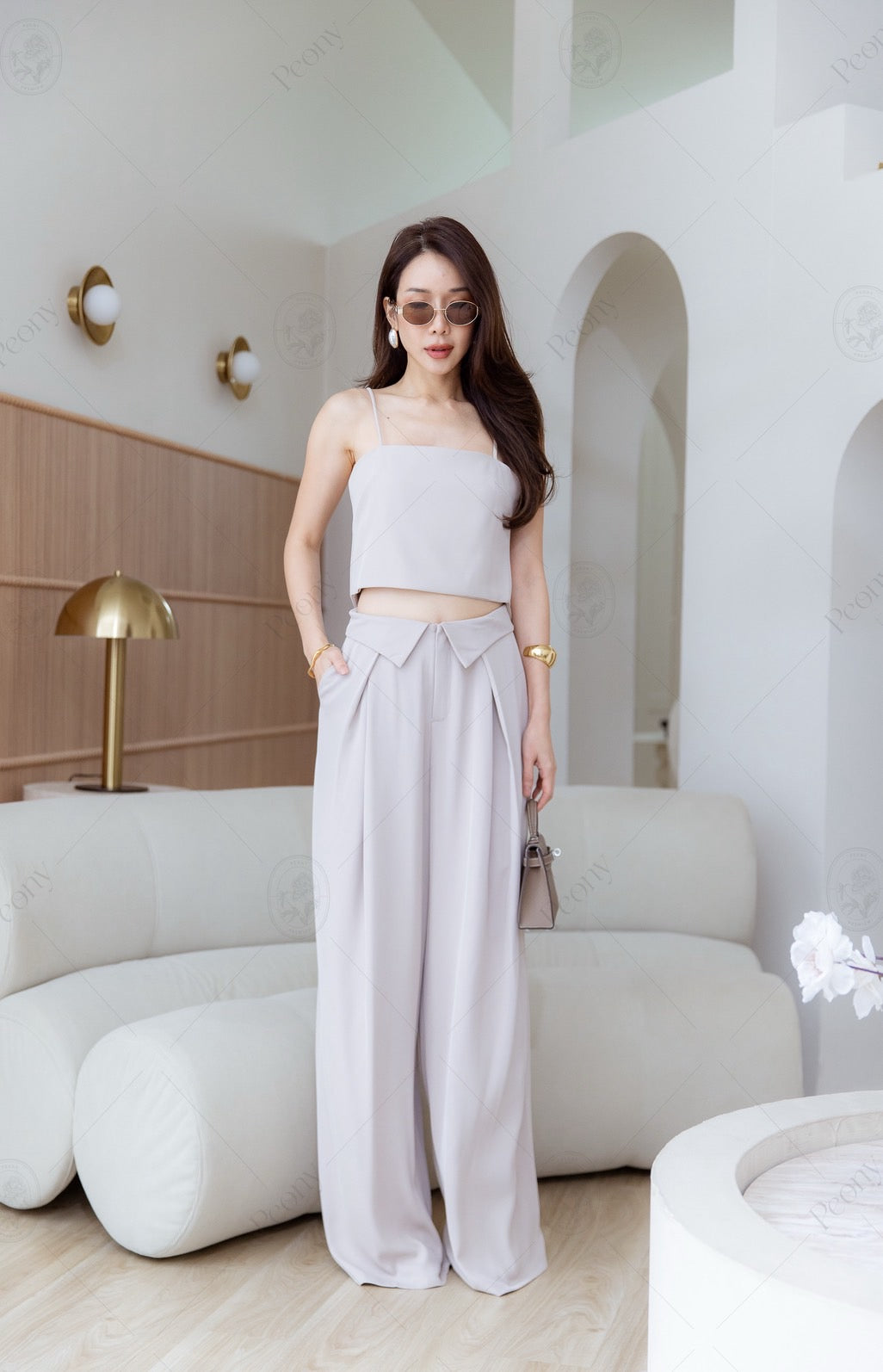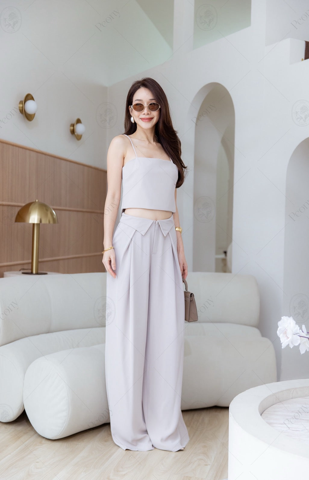 Features a sleeveless cami top with back button detailing, paired with wide-leg flowy pants for a chic and flattering silhouette.