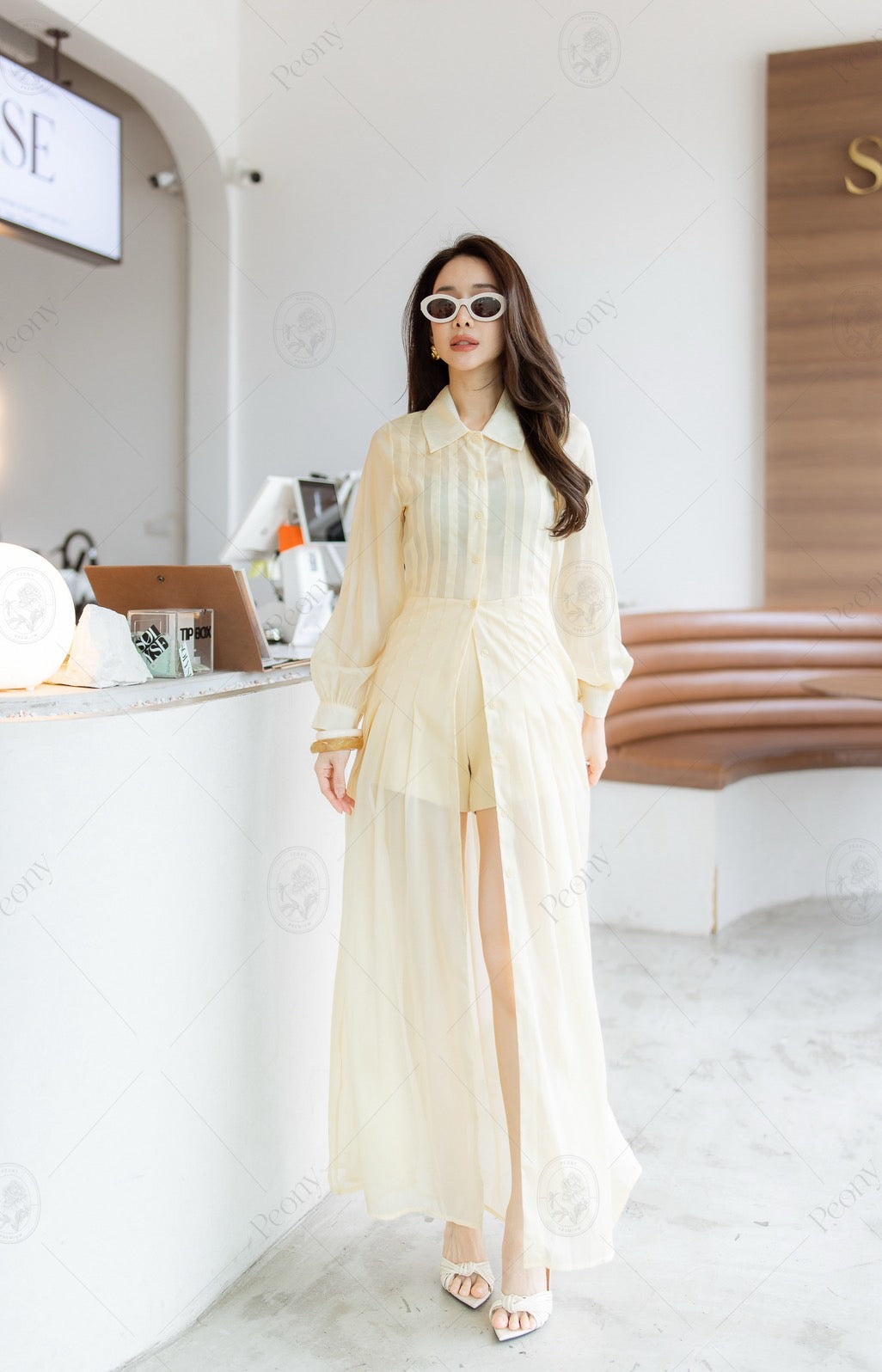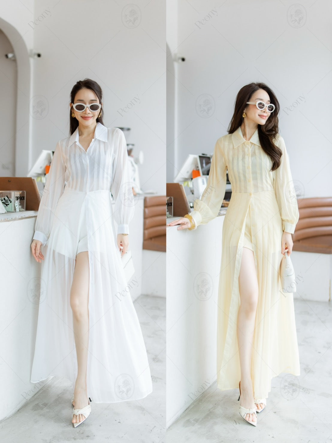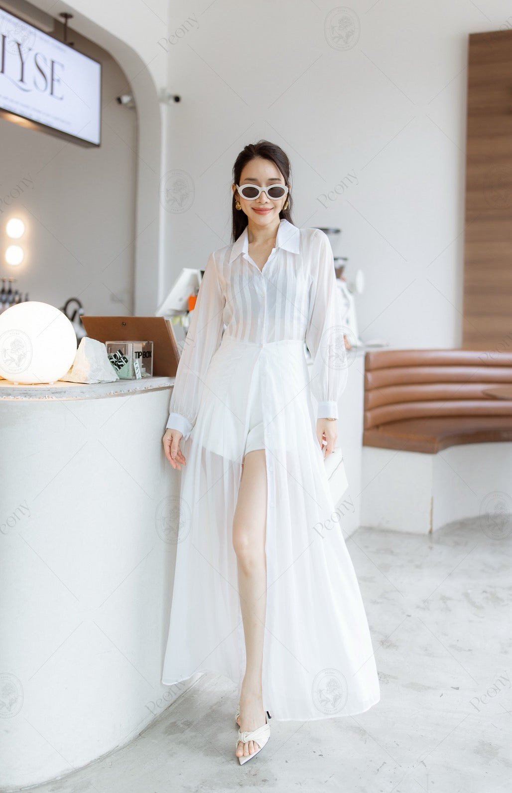 Long sheer top with a collar and front buttons, paired with matching shorts.