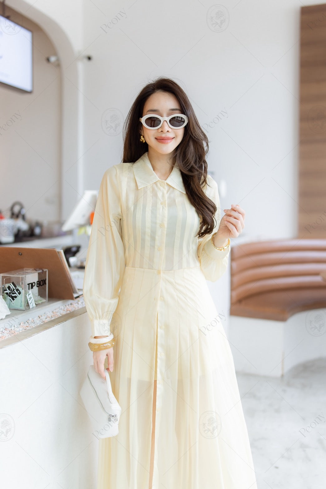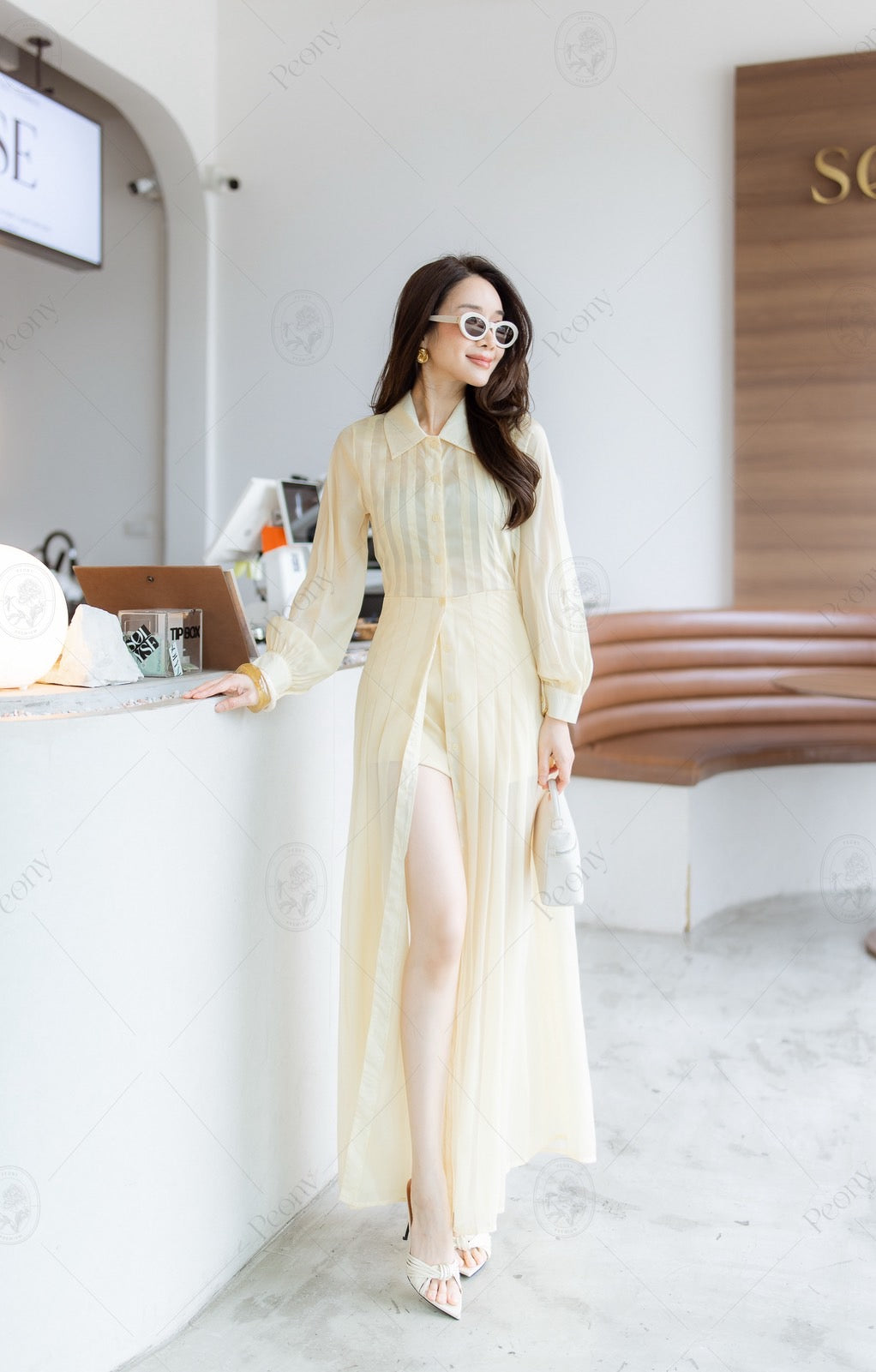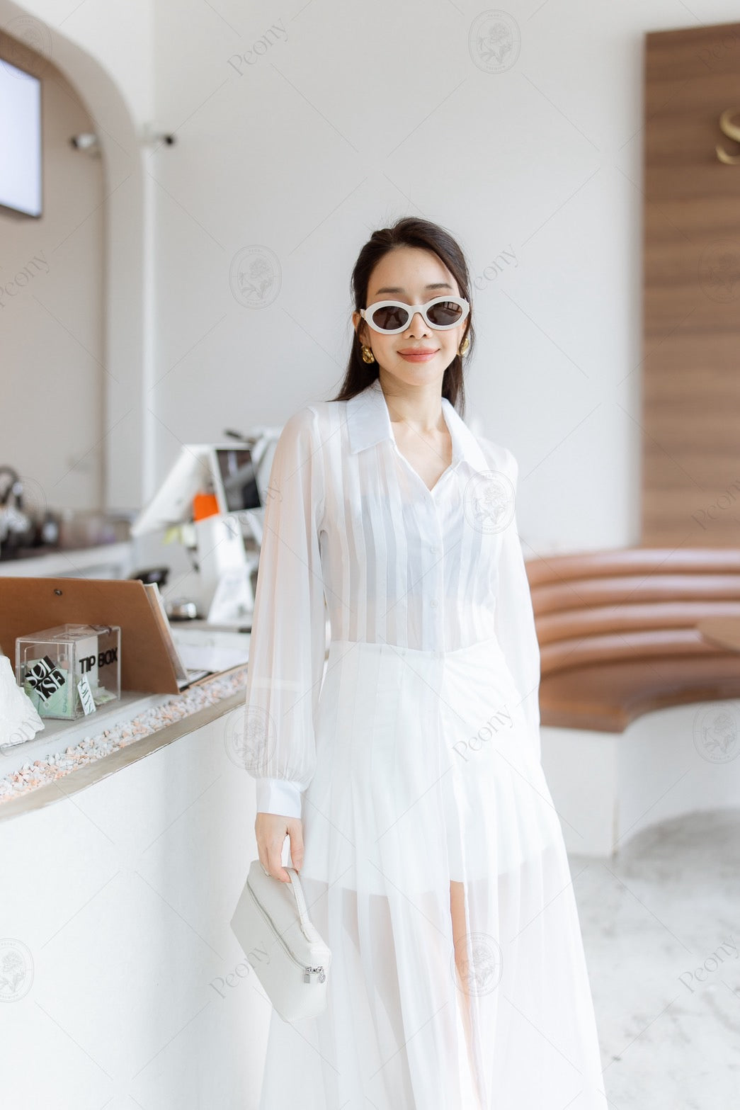 Long sheer top with a collar and front buttons, paired with matching shorts.