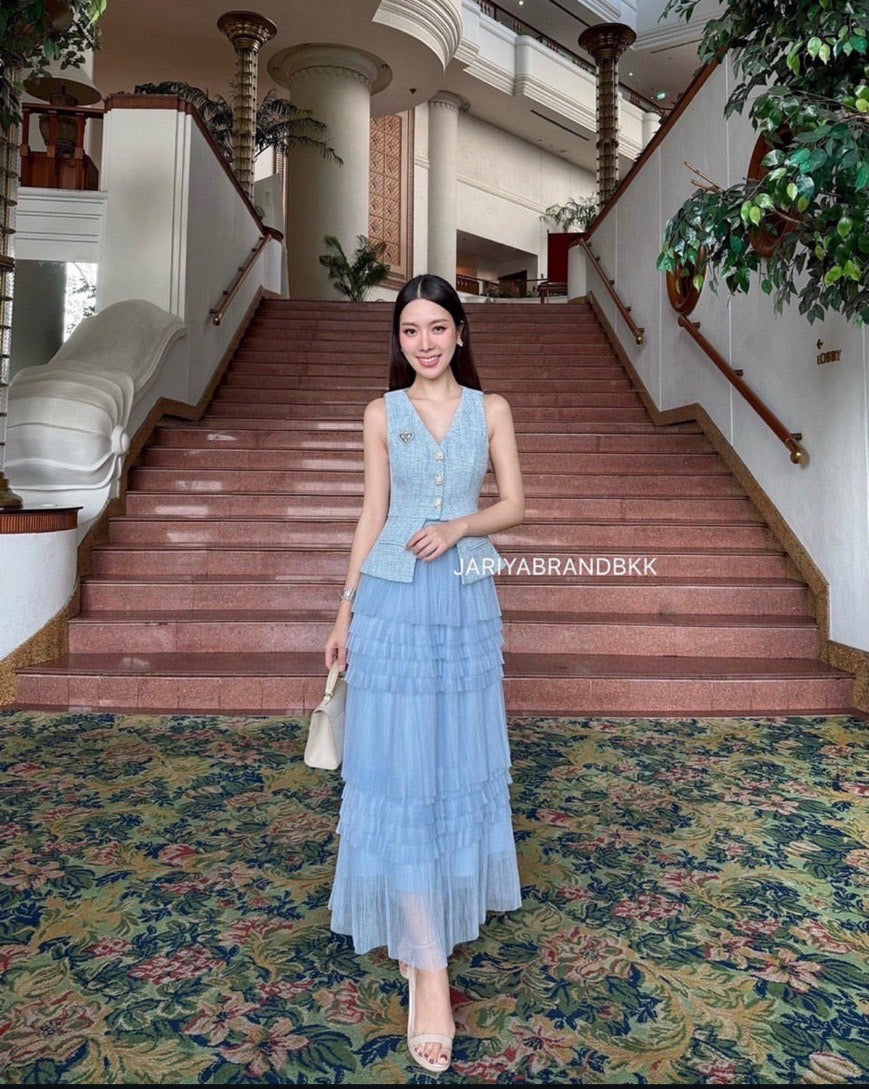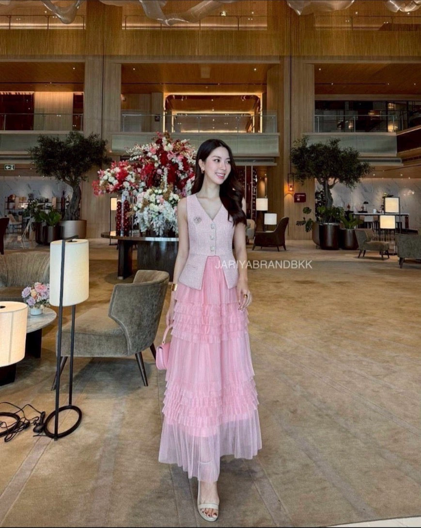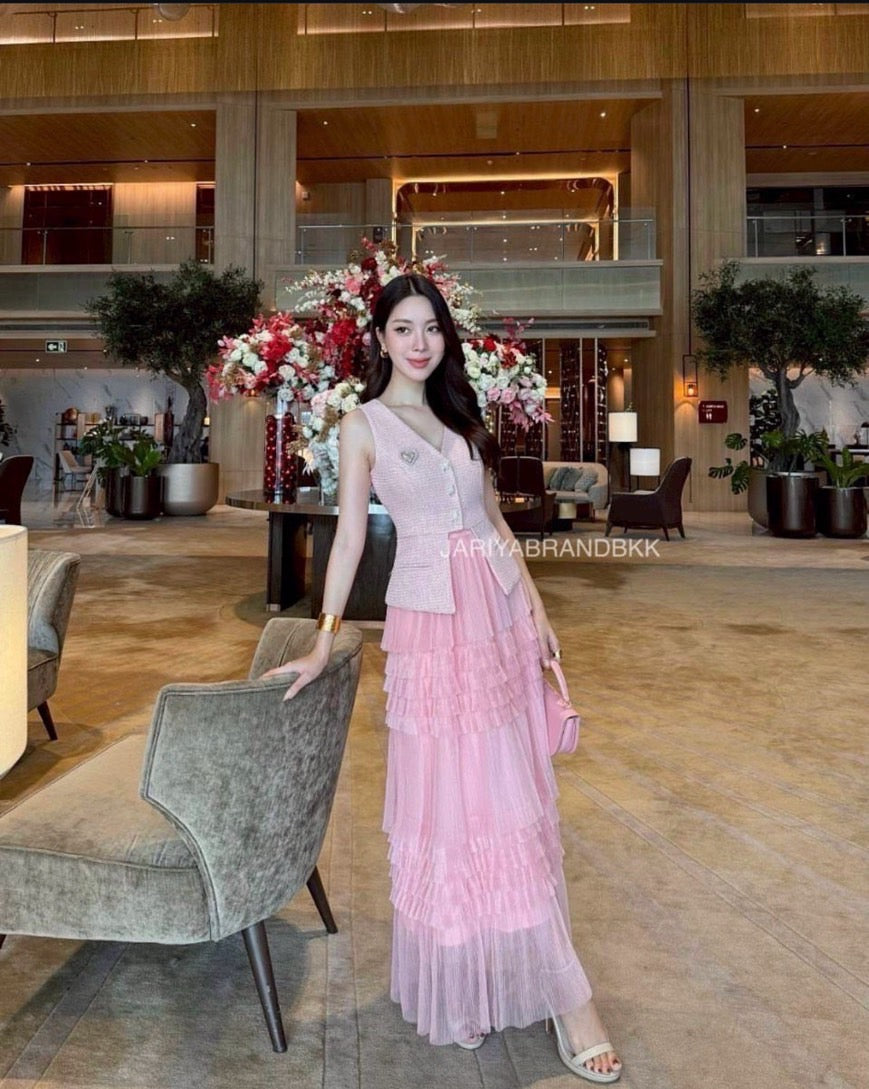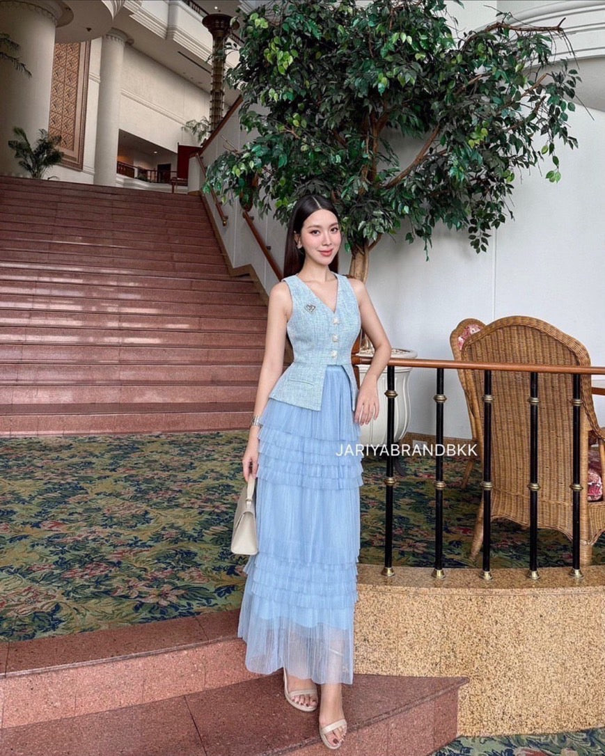 📌DETAIL ~~ Two-piece set made from soft tweed fabric. Features a short-sleeve V-neck top paired with a pleated ruffle skirt. Comes with a stylish brooch for an added touch of elegance. Super comfortable, flattering fit, and looks absolutely stunning in person. The soft, structured fabric gives it a luxurious, high-end feel.