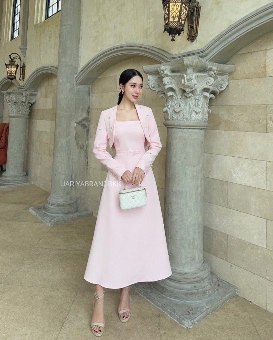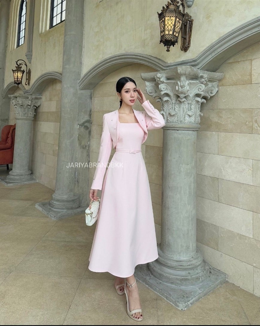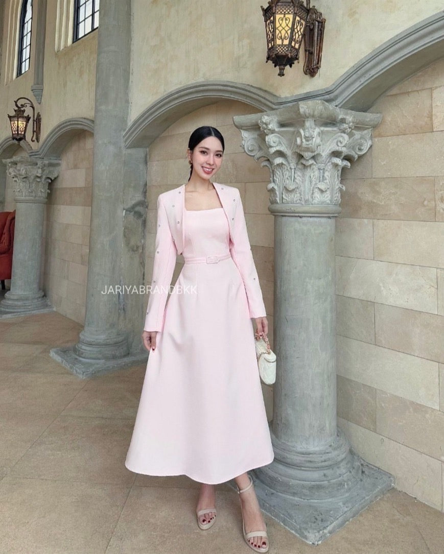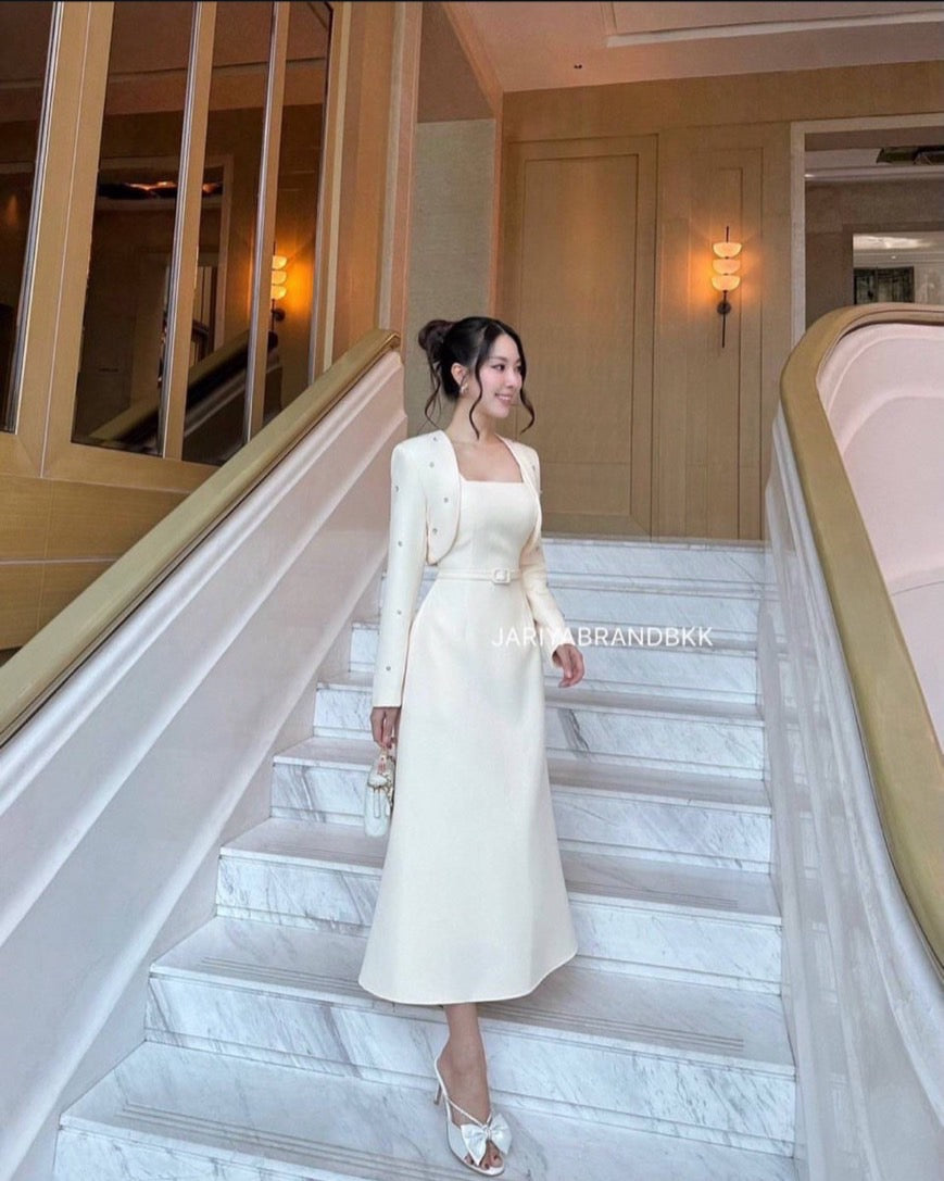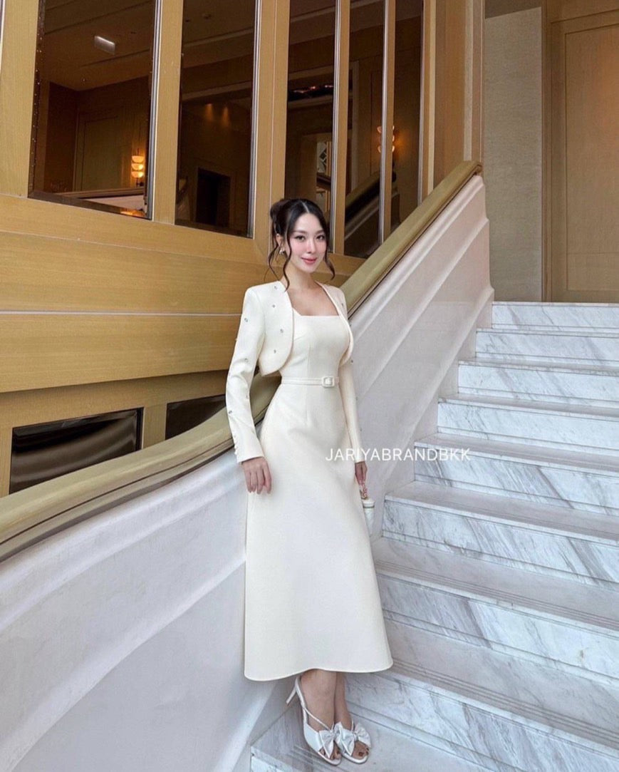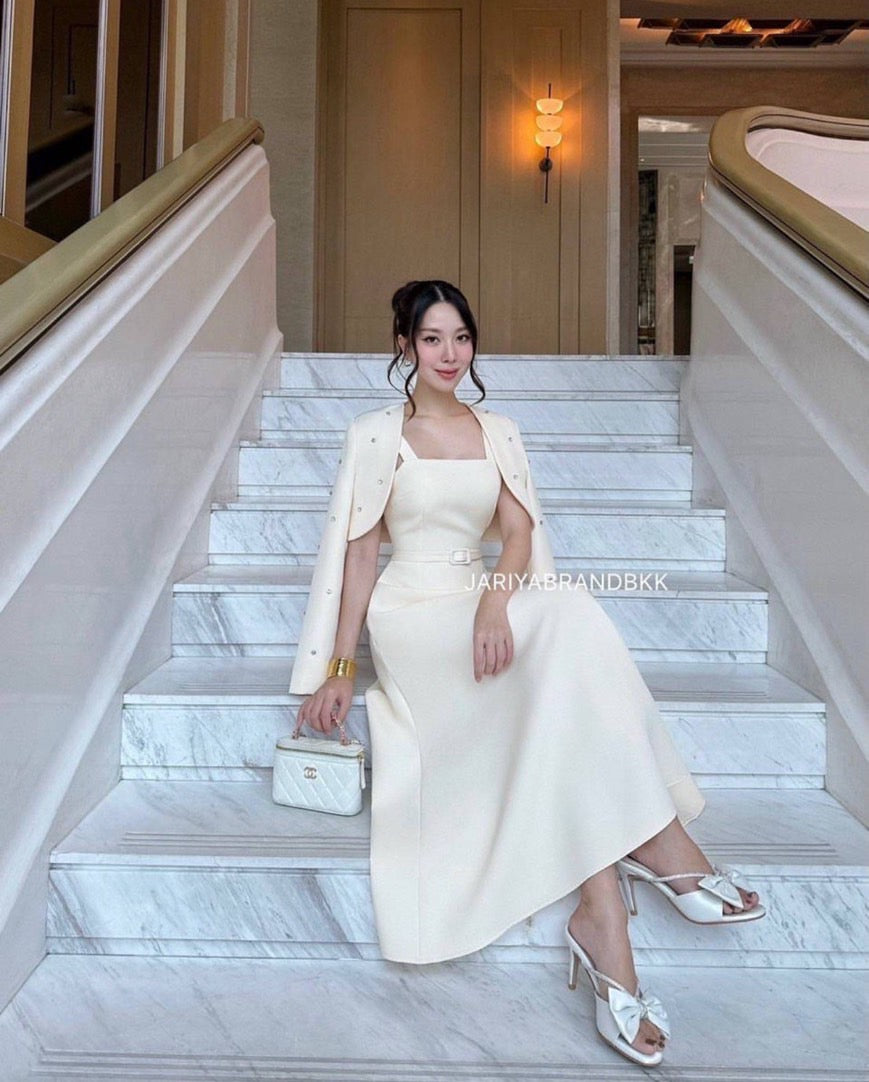3-piece set featuring a long-sleeve embellished cover-up with rhinestone details, a sleeveless dress, and a matching belt. Absolutely beautiful, comfortable to wear, and very elegant. The real piece is stunning—crafted from soft, high-quality fabric that feels great on the skin and holds its shape perfectly. Exceptional craftsmanship—chic, luxurious, and polished.