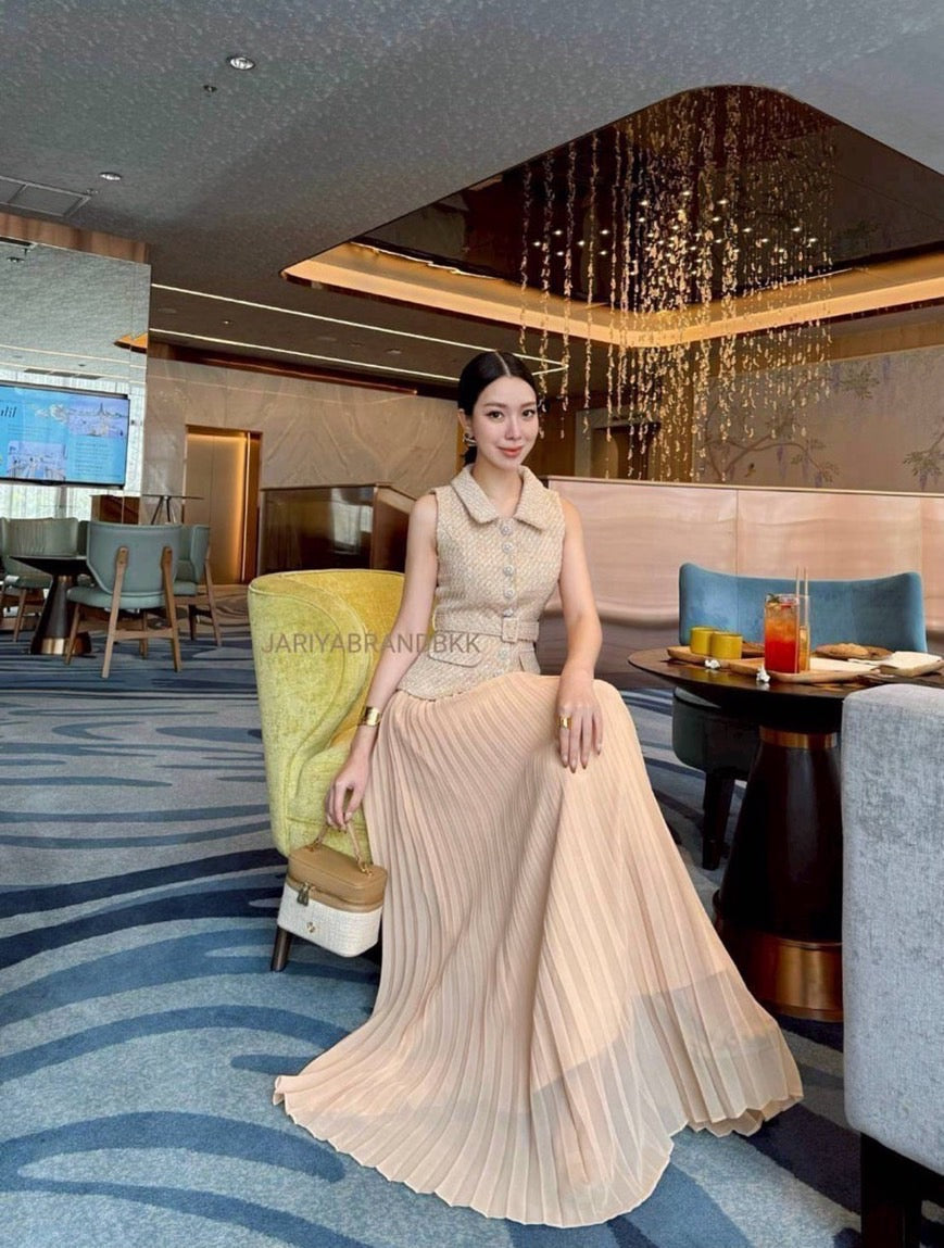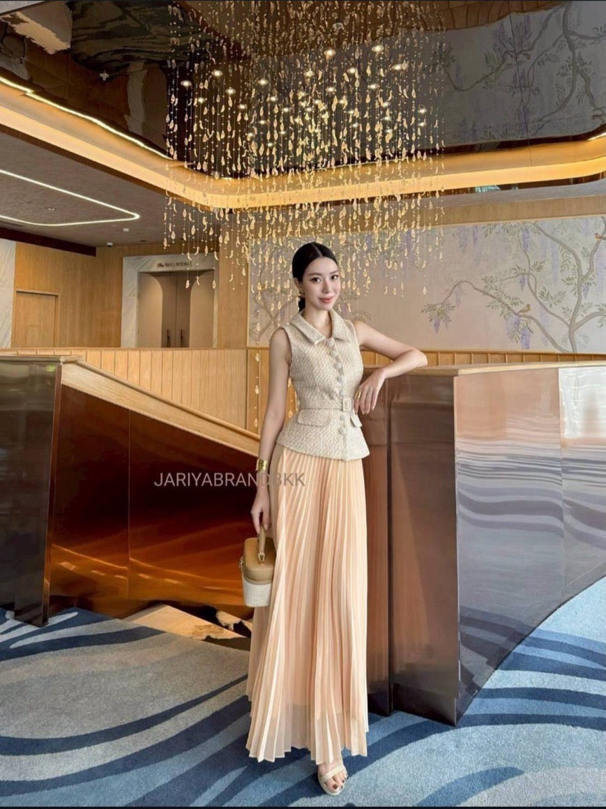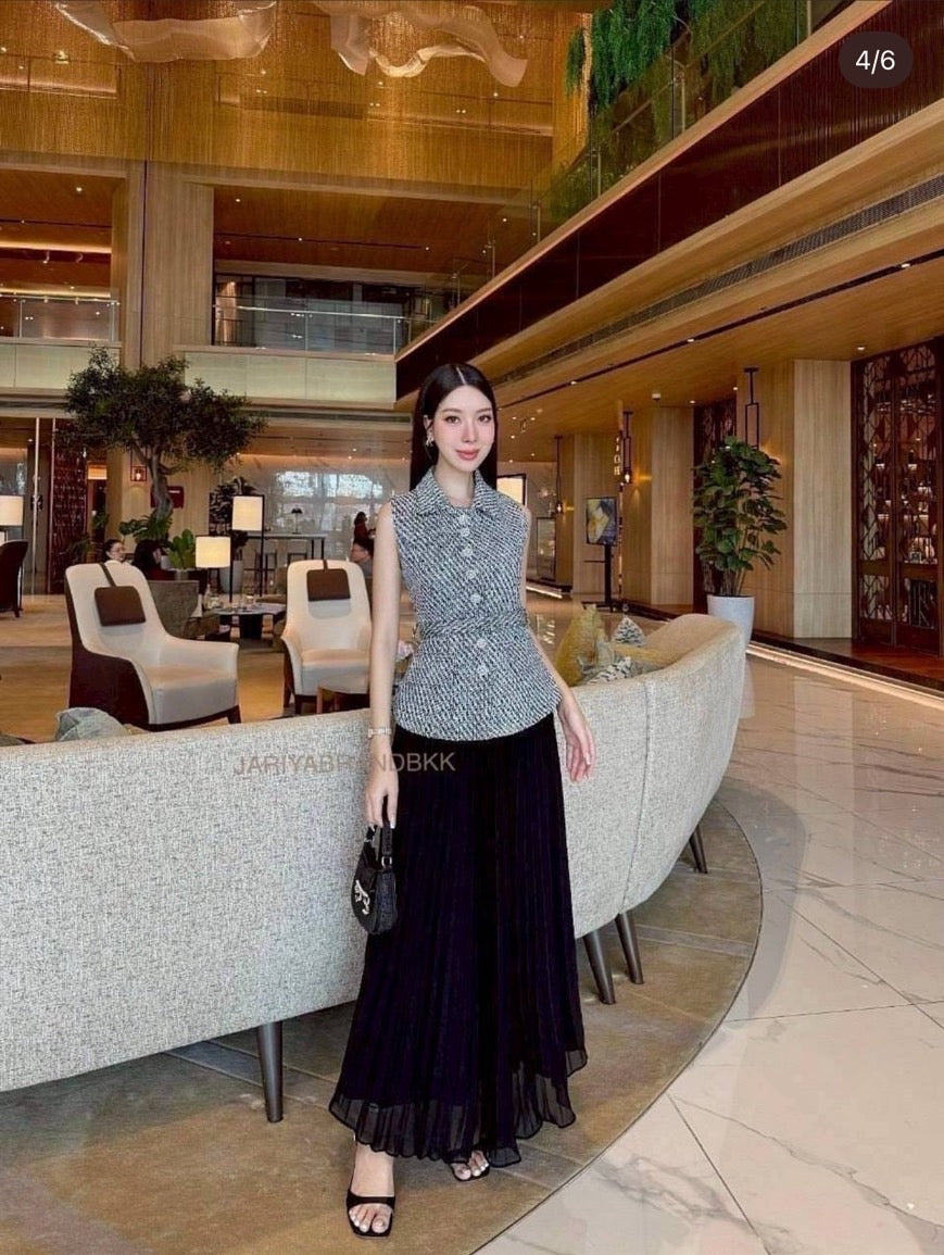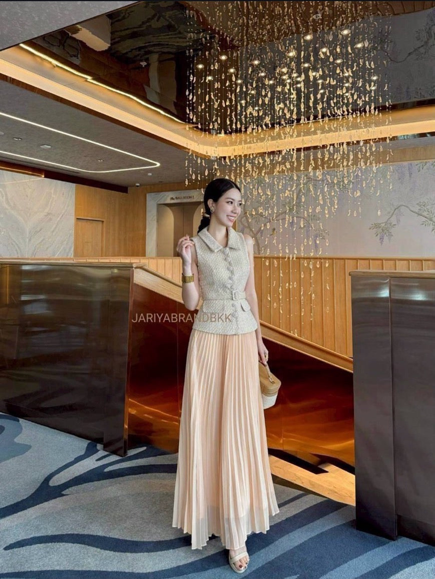 ✅DETAIL ~~ 3-piece set featuring a sleeveless tweed top with dazzling rhinestone buttons, paired with a long pleated skirt and a matching belt. Absolutely stunning and incredibly comfortable to wear. The actual piece looks even more beautiful in person — made from high-quality, soft fabric that holds its shape perfectly. A truly elegant look that feels luxurious and effortlessly chic! 💎✨