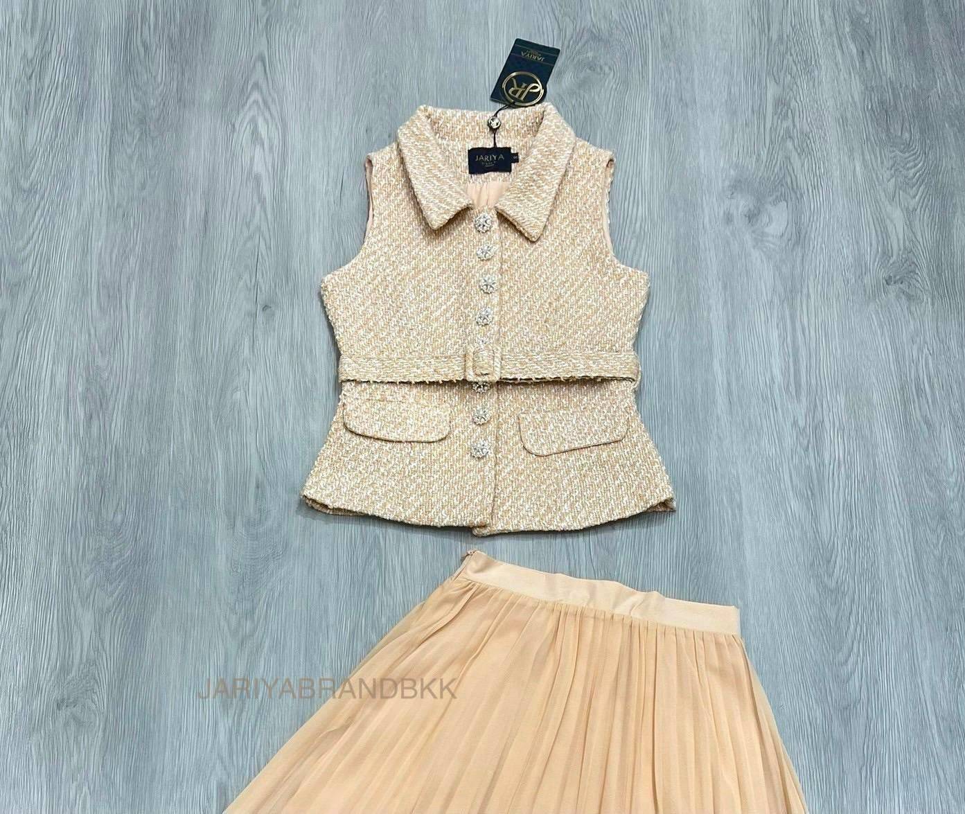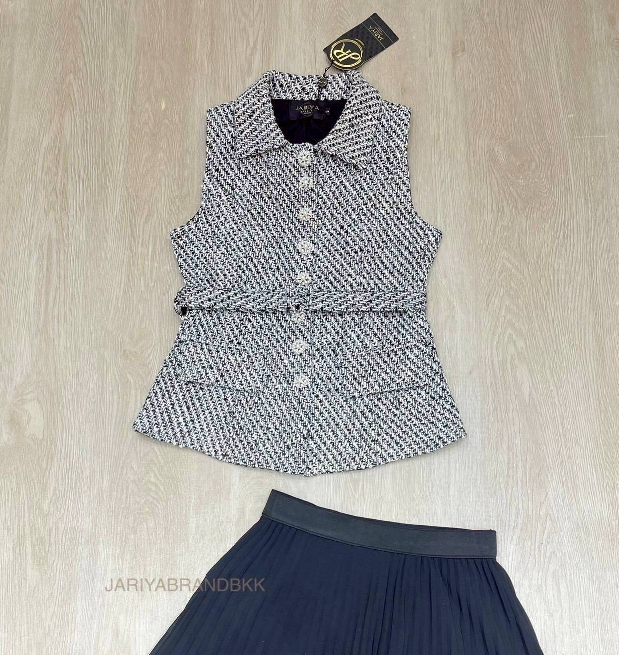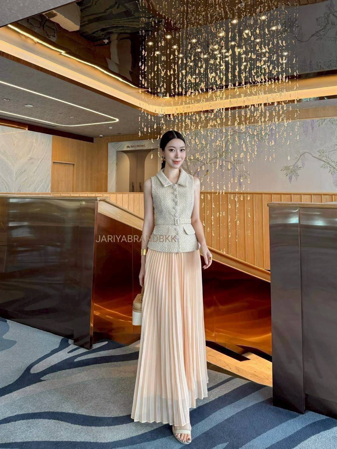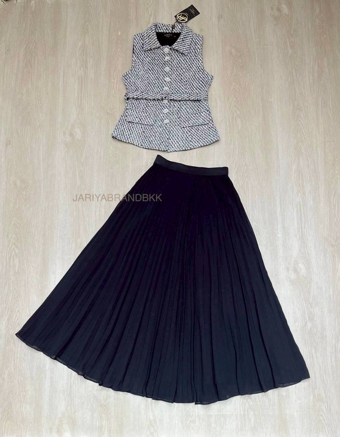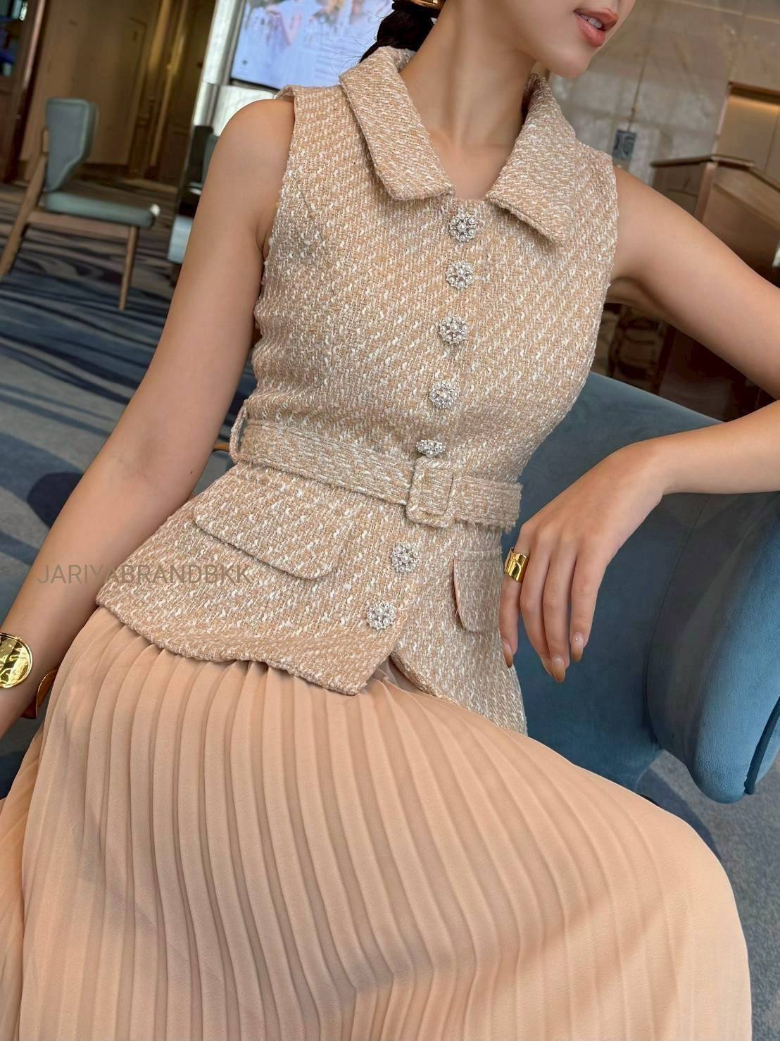 Elegant sleeveless tweed top with sparkling rhinestone buttons, paired with a long pleated skirt and matching belt.