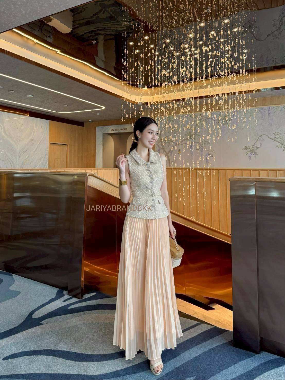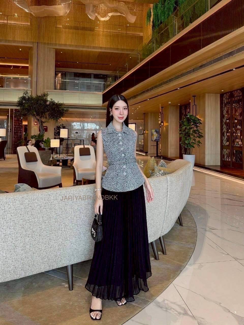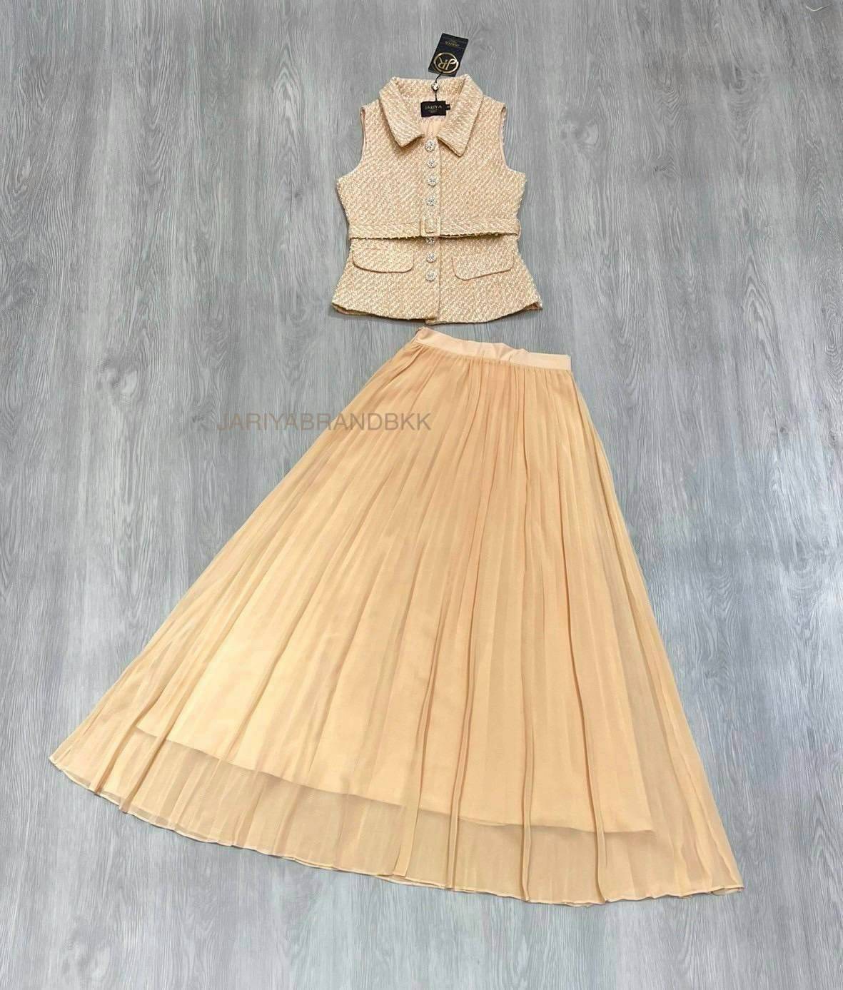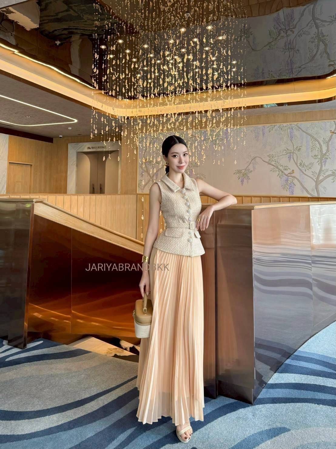 Elegant sleeveless tweed top with sparkling rhinestone buttons, paired with a long pleated skirt and matching belt.