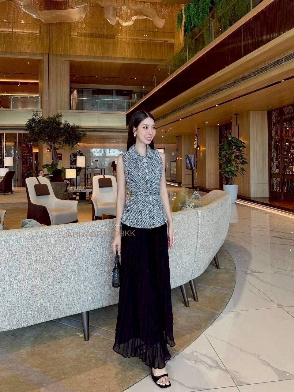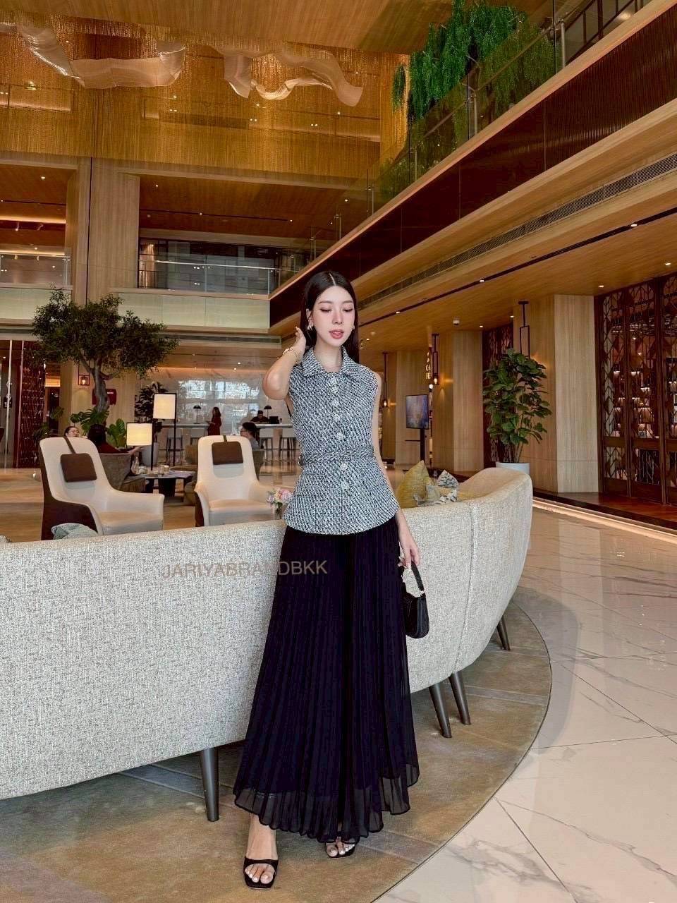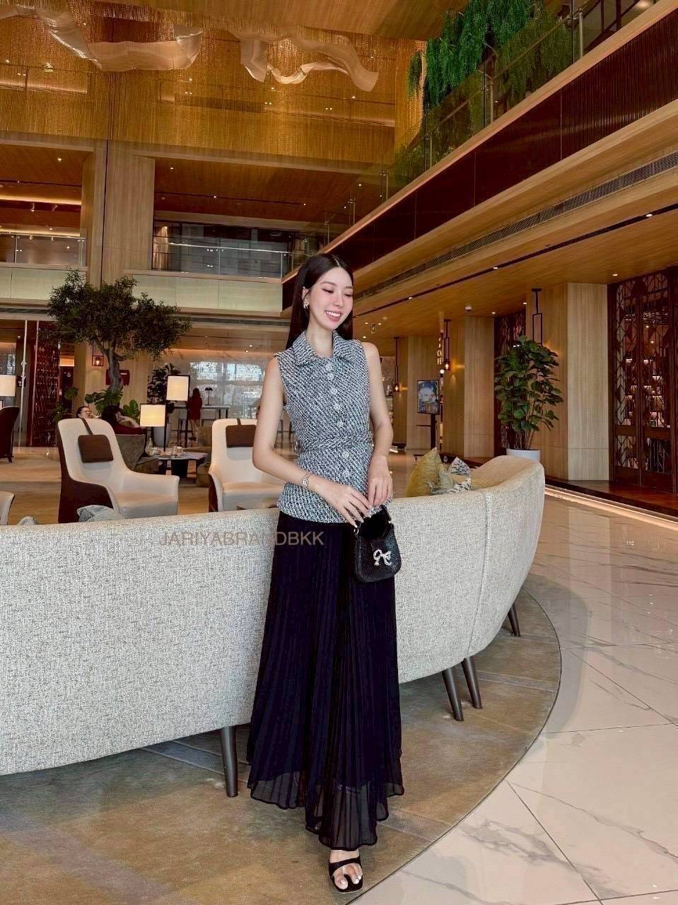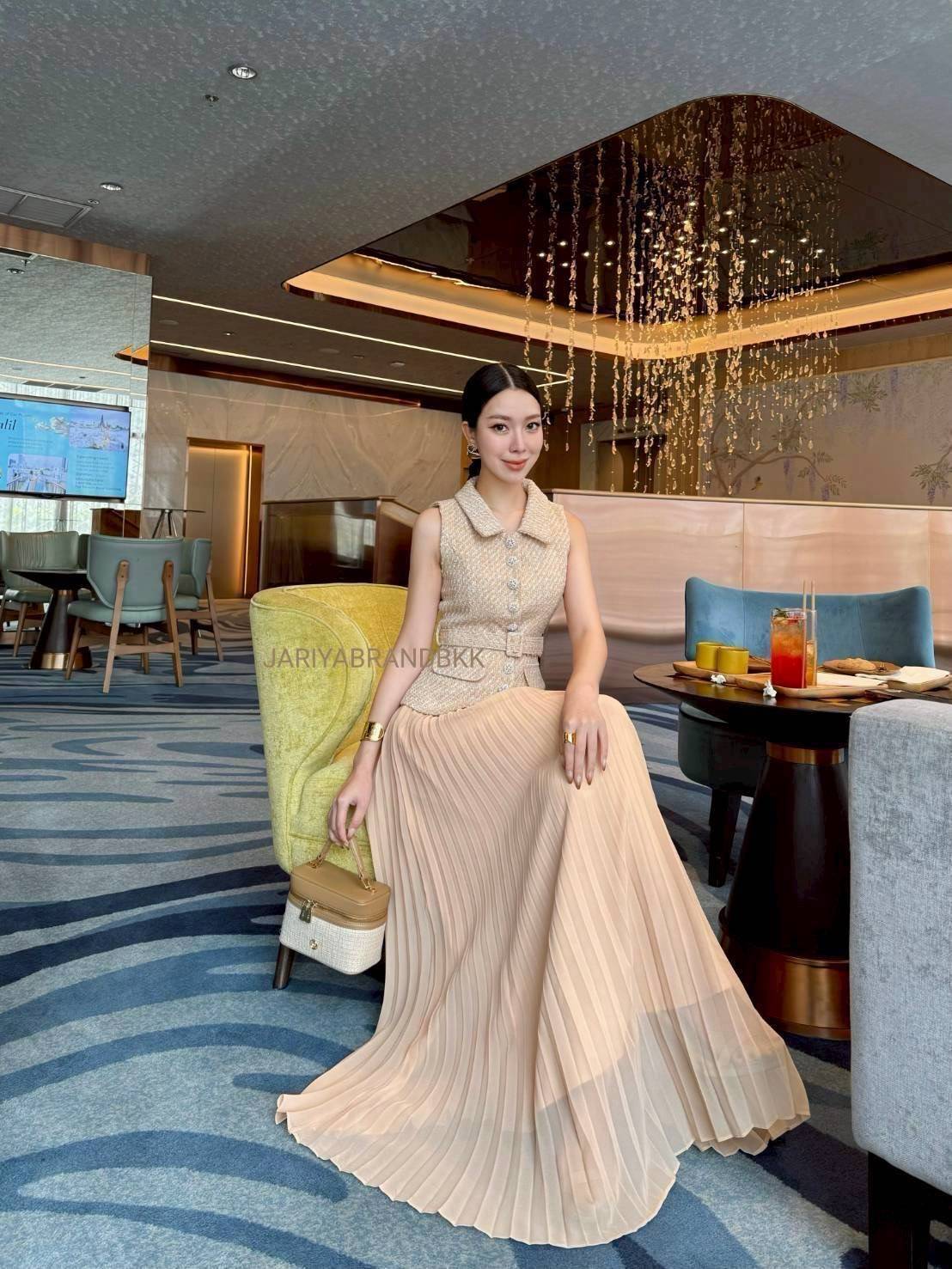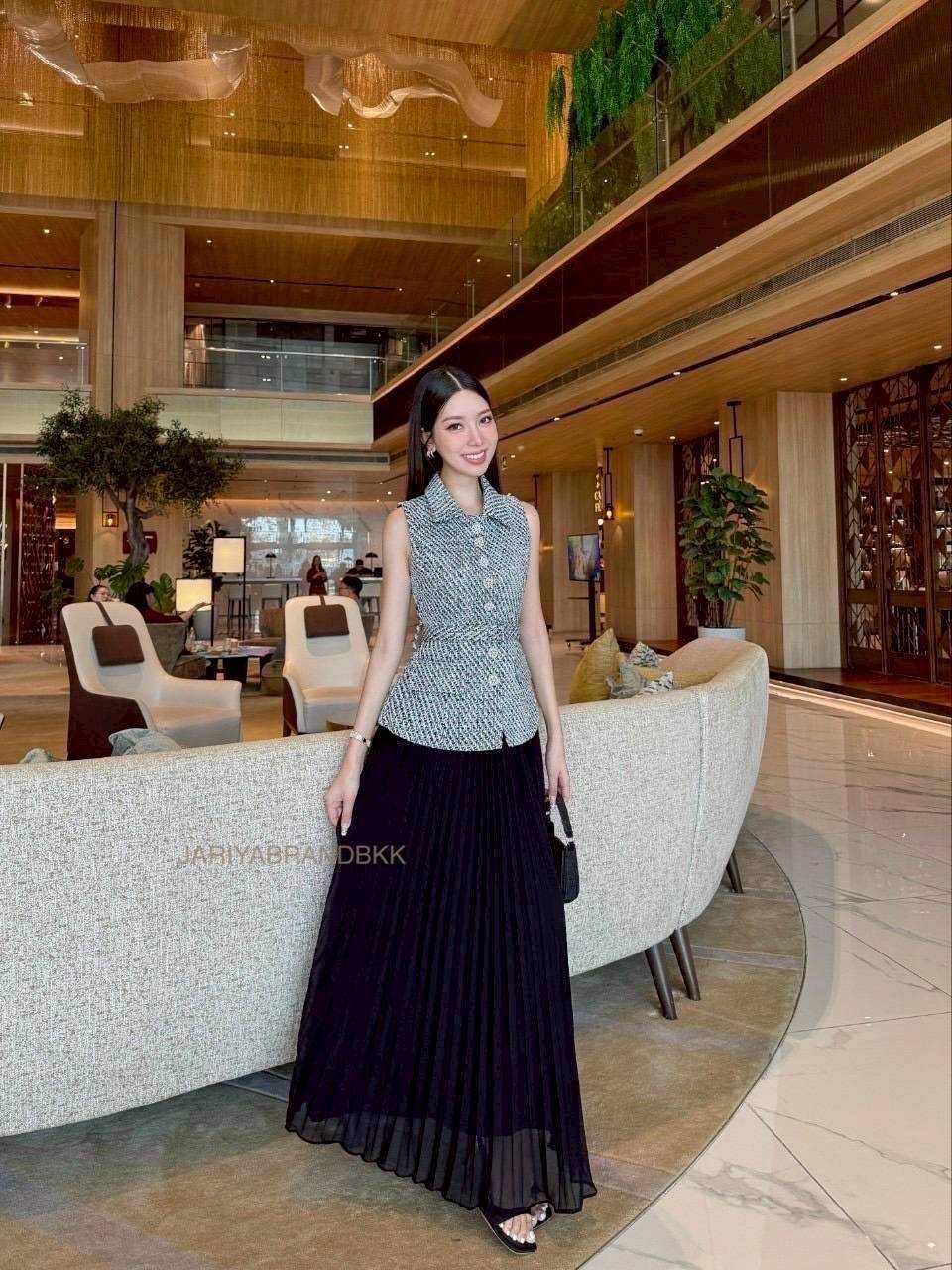 Elegant sleeveless tweed top with sparkling rhinestone buttons, paired with a long pleated skirt and matching belt.