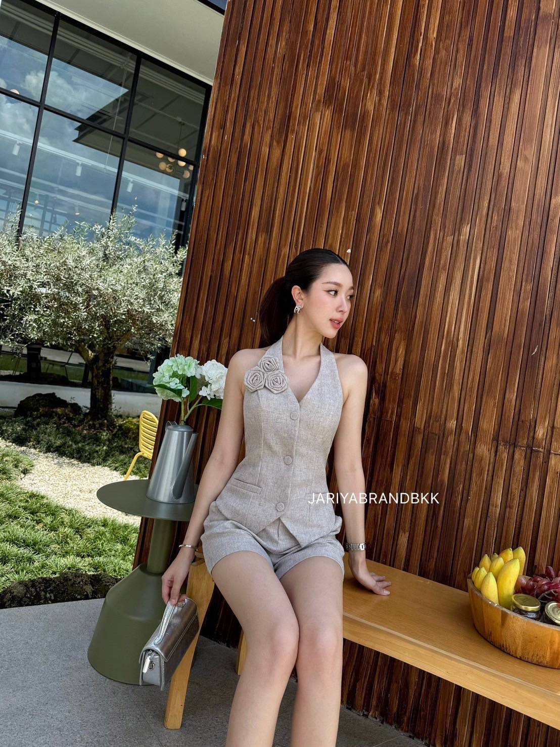 Halter neck crochet-style top with front buttons, decorated with 3 flower accessories.