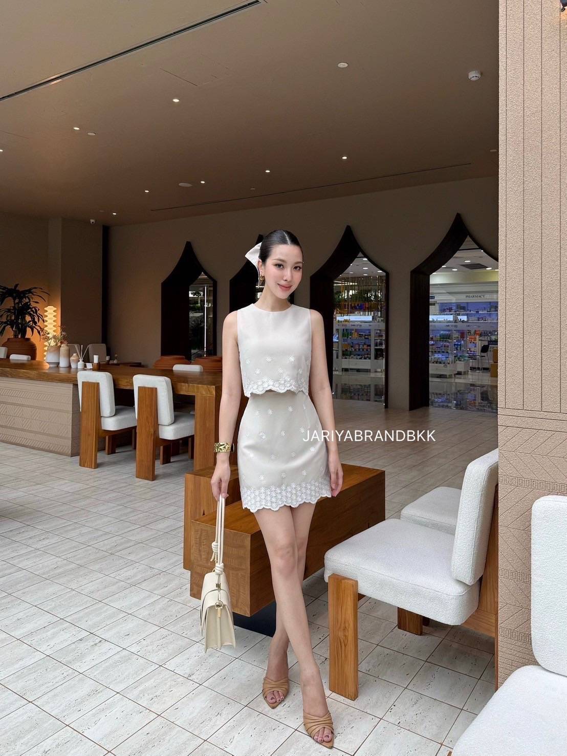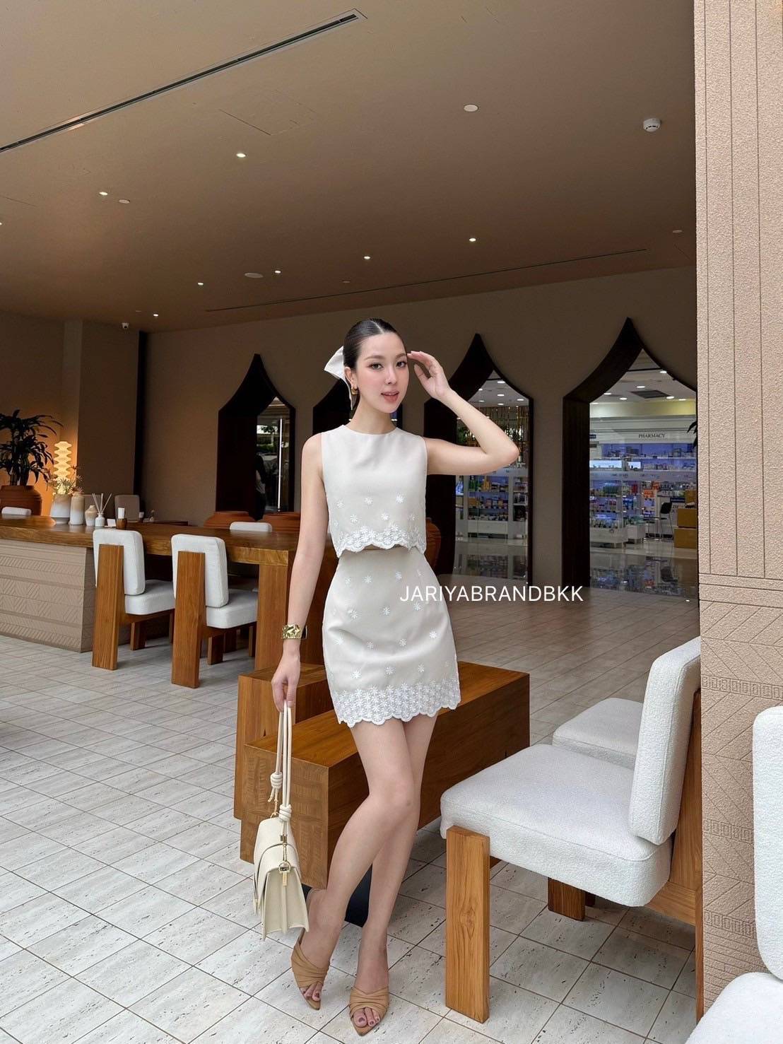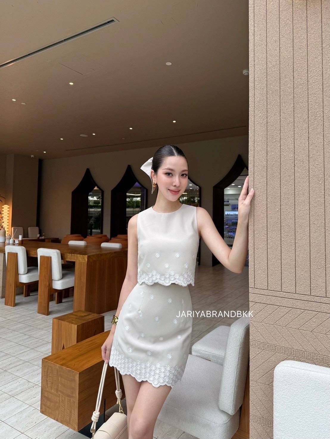 📌 DETAILS — 3-piece embroidered set featuring a sleeveless floral-embroidered top, a high-waisted skirt with built-in shorts, and a matching fabric scrunchie. This set is absolutely gorgeous in person — soft, breathable fabric that holds its shape well. Stylish, comfortable, and effortlessly elegant with a luxury feel!
