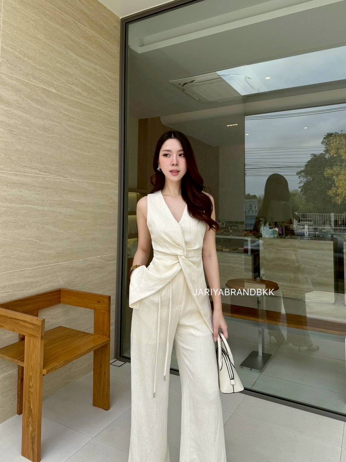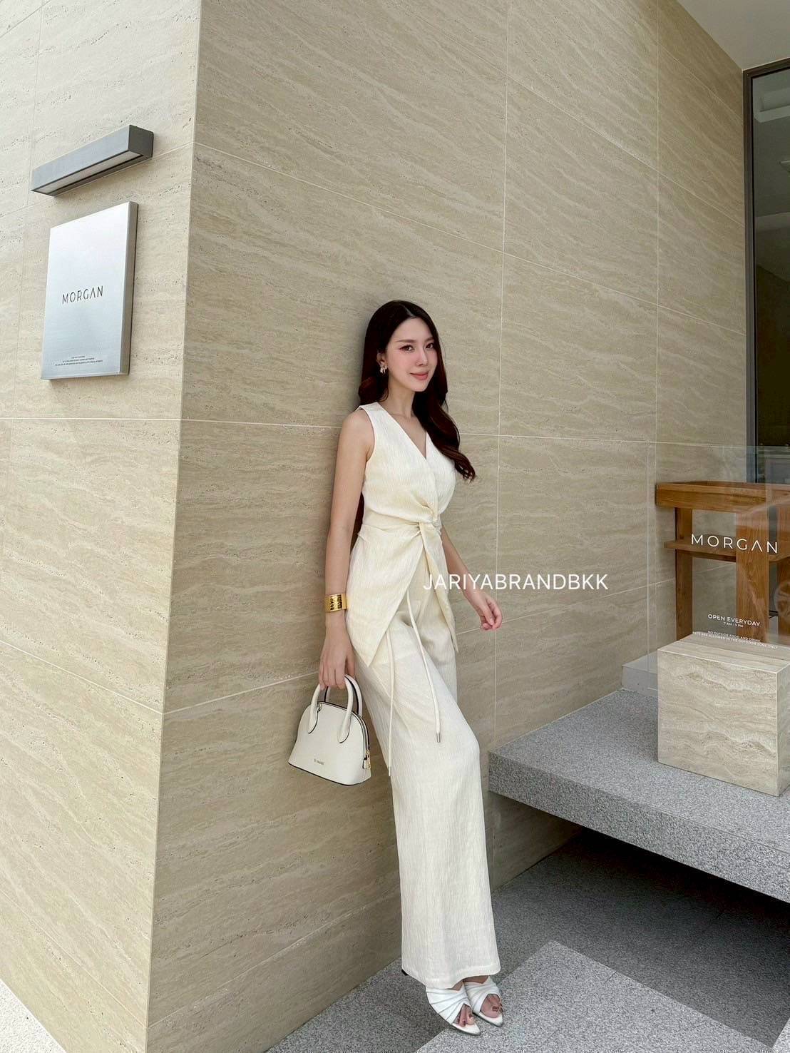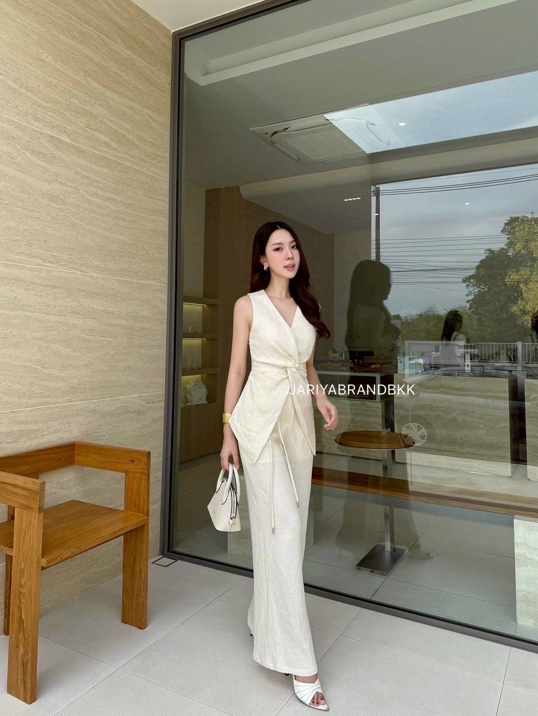 3-piece set with a sleeveless V-neck top, paired with high-waisted straight-leg long pants with a drawstring waist. Very beautiful, comfortable, and looks great. The actual product is gorgeous, made from very soft fabric that’s comfortable to wear and holds its shape well. The design is stunning, elegant, and looks high-end.