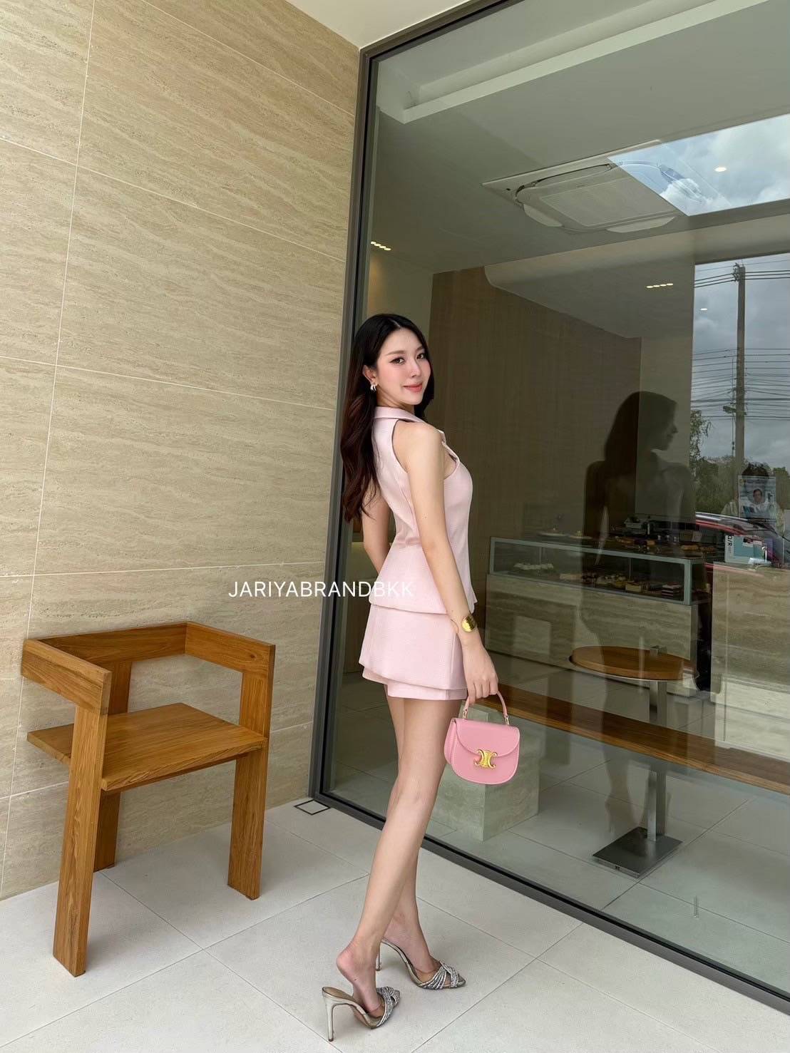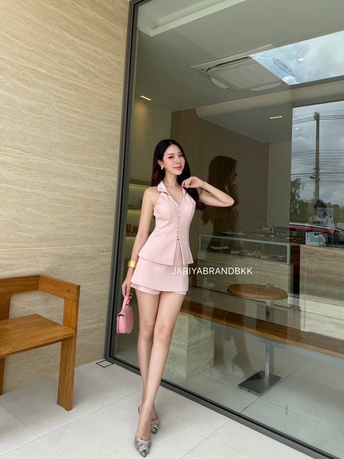2-piece set with a sleeveless collared shirt featuring gold buttons on the front, paired with a high-waisted short skirt-pants. Very beautiful, comfortable, and looks great. The actual product is stunning, made from very soft fabric that’s comfortable to wear and holds its shape well. The design is elegant, luxurious, and stylish.