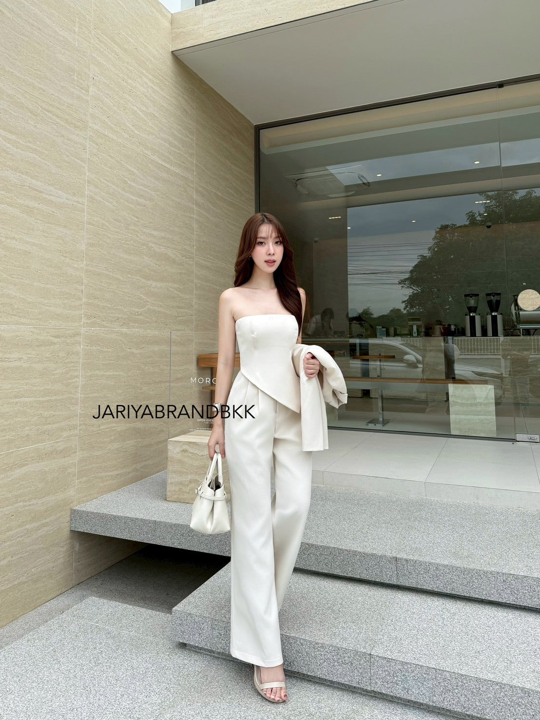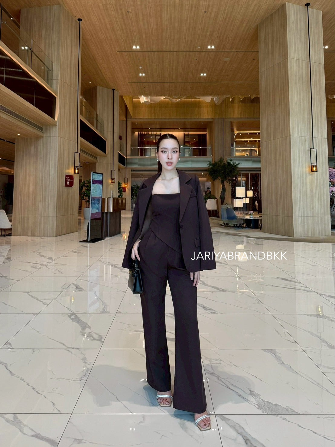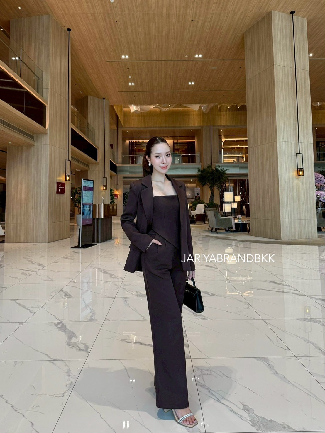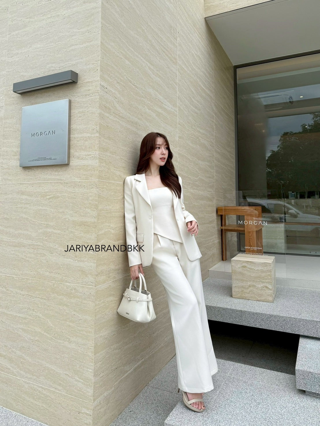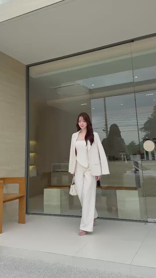 Stunning 3-piece set β includes a long-sleeve blazer, an asymmetrical off-shoulder crop top, and high-waisted wide-leg pants.