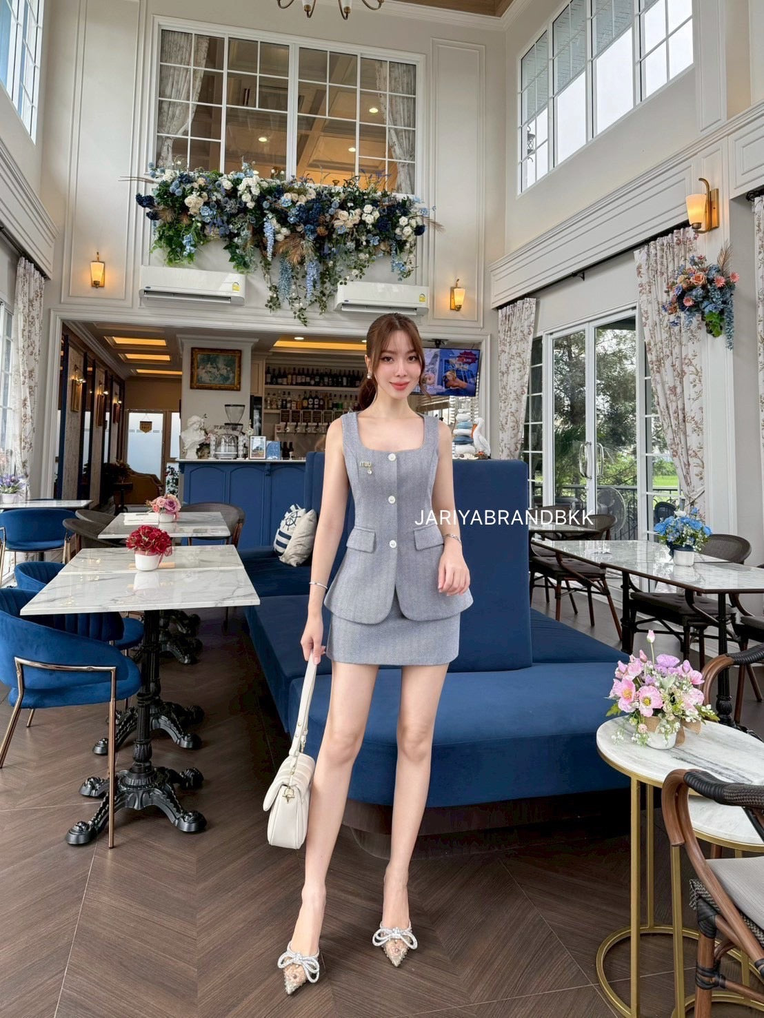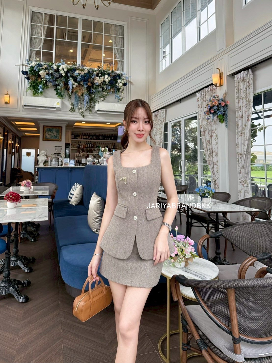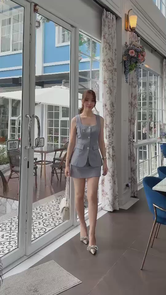Chic 3-piece set made from structured suit fabric β includes a sleeveless top paired with high-waisted shorts. Comes with a stylish brooch for added elegance.