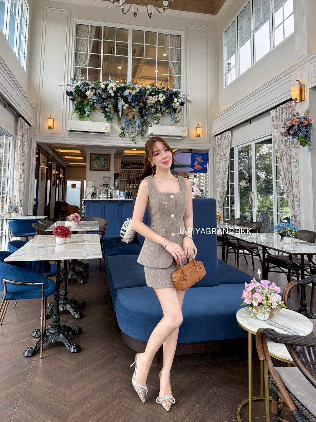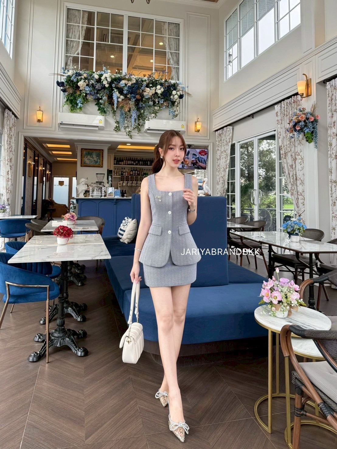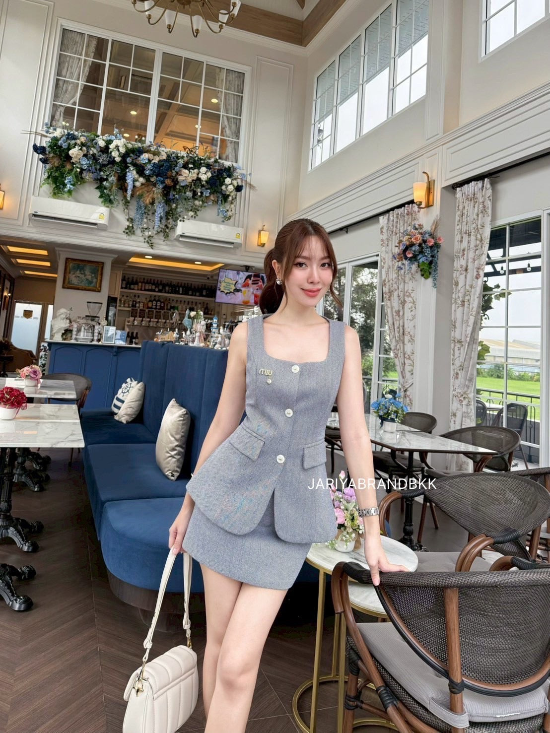 Chic 3-piece set made from structured suit fabric β includes a sleeveless top paired with high-waisted shorts. Comes with a stylish brooch for added elegance.