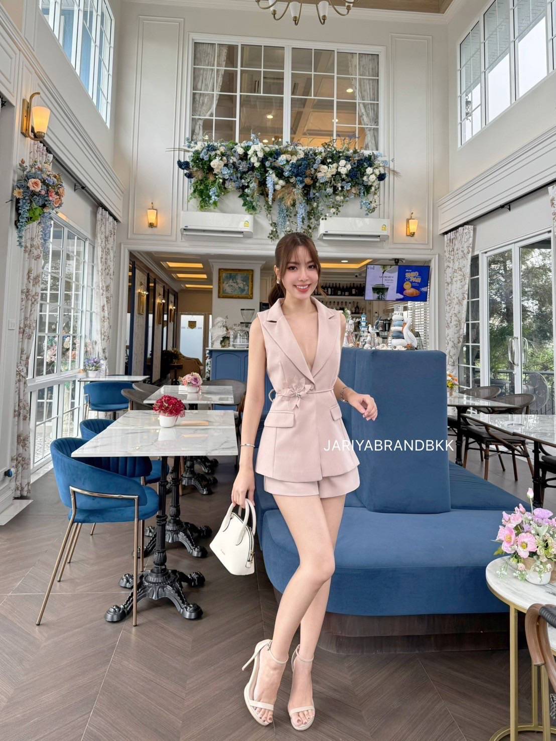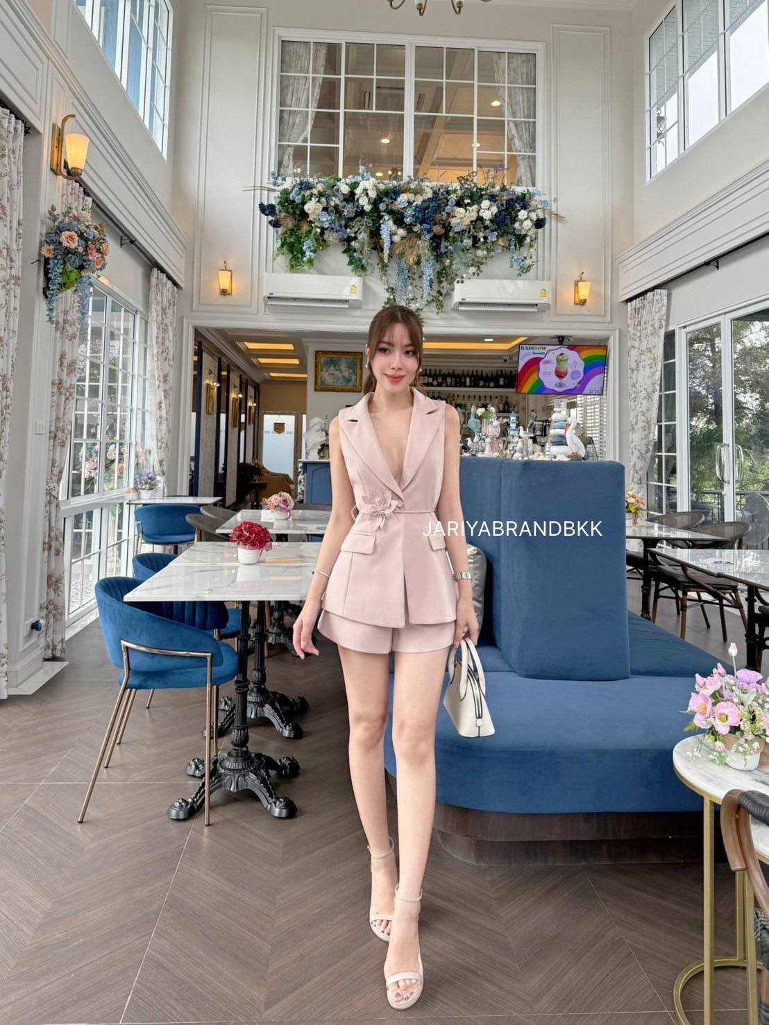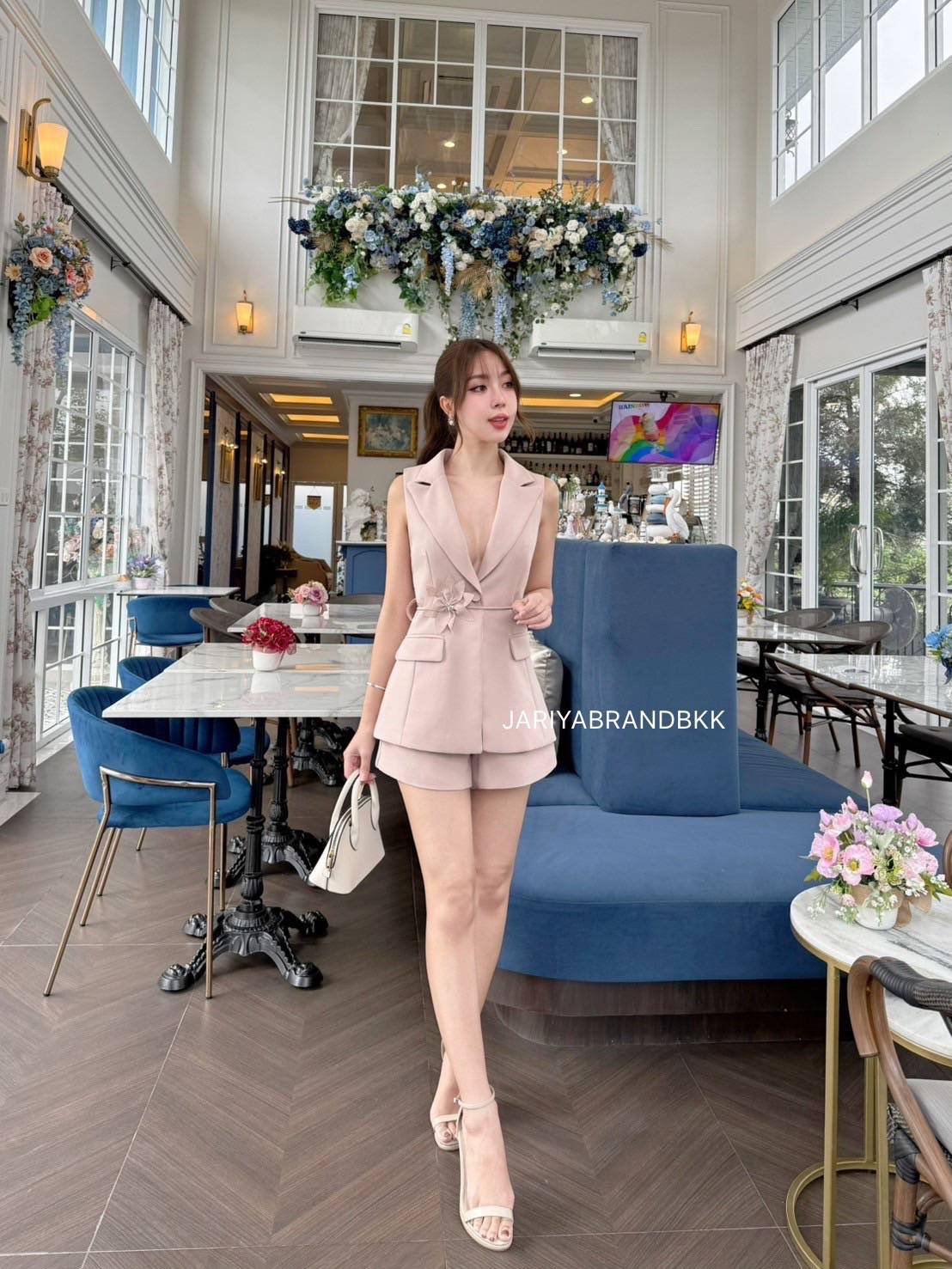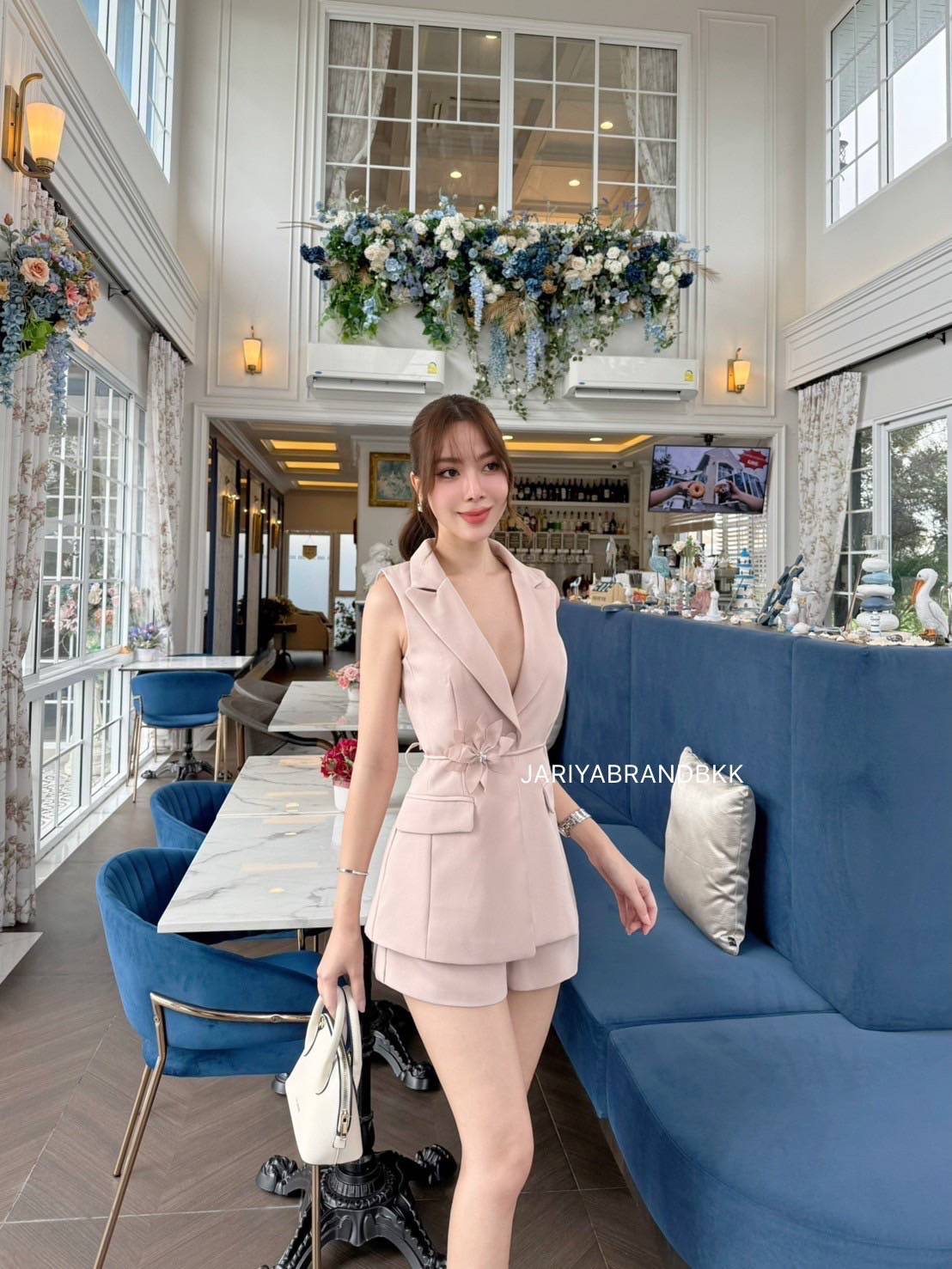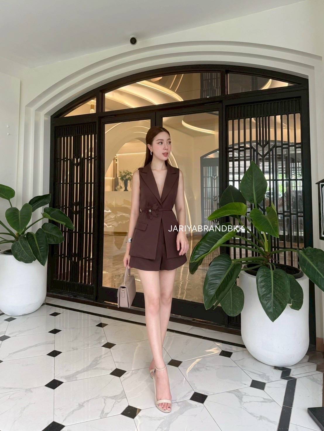 Chic 3-piece set made from structured suit fabric β features a sleeveless collared top paired with tailored high-waisted shorts, and comes with a floral belt tie to complete the look.