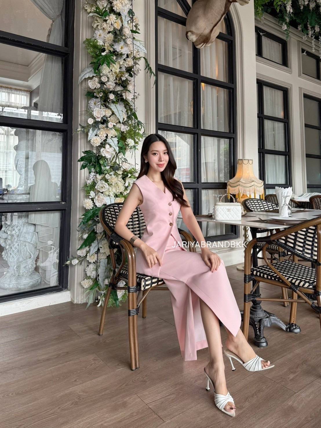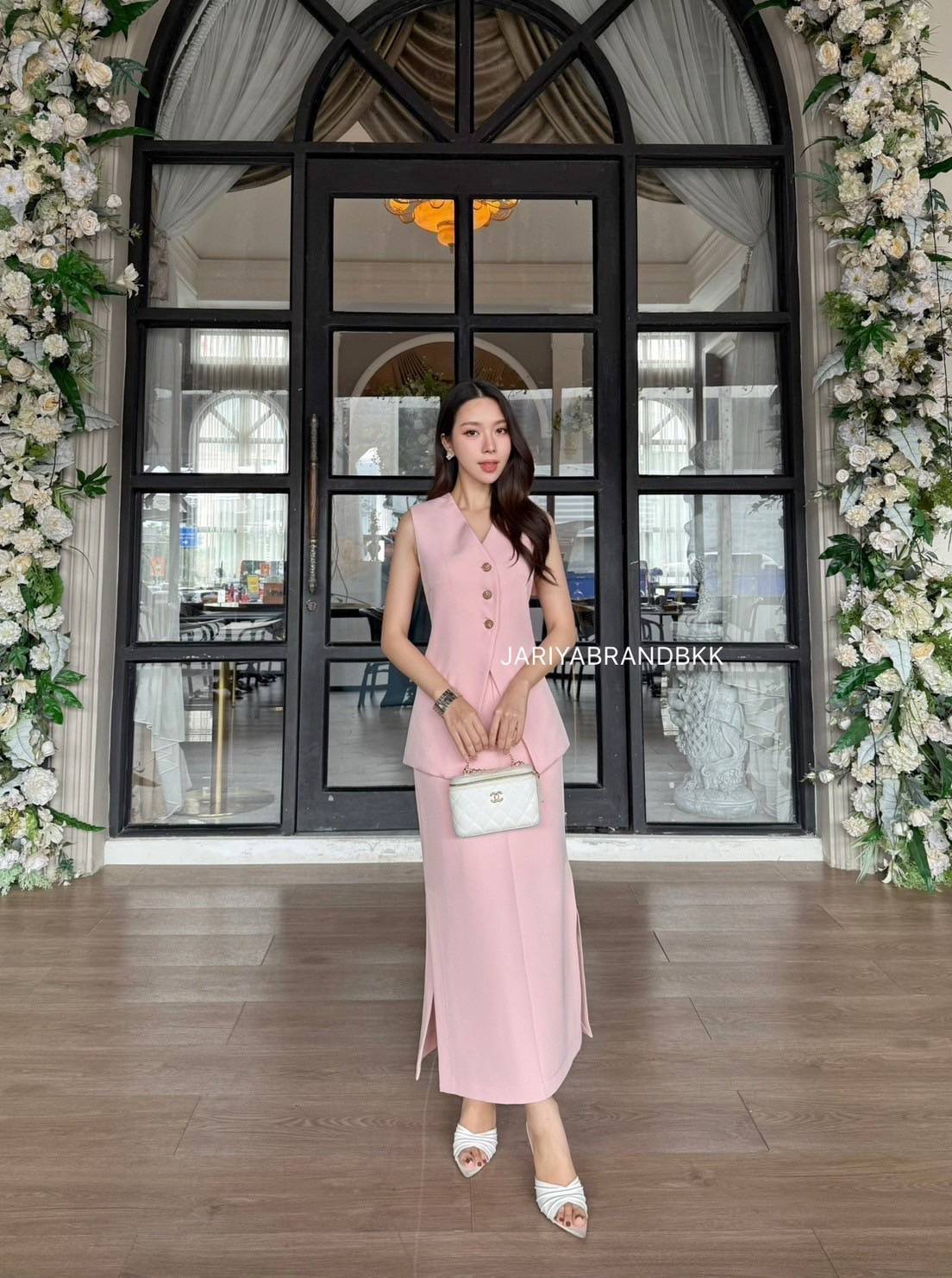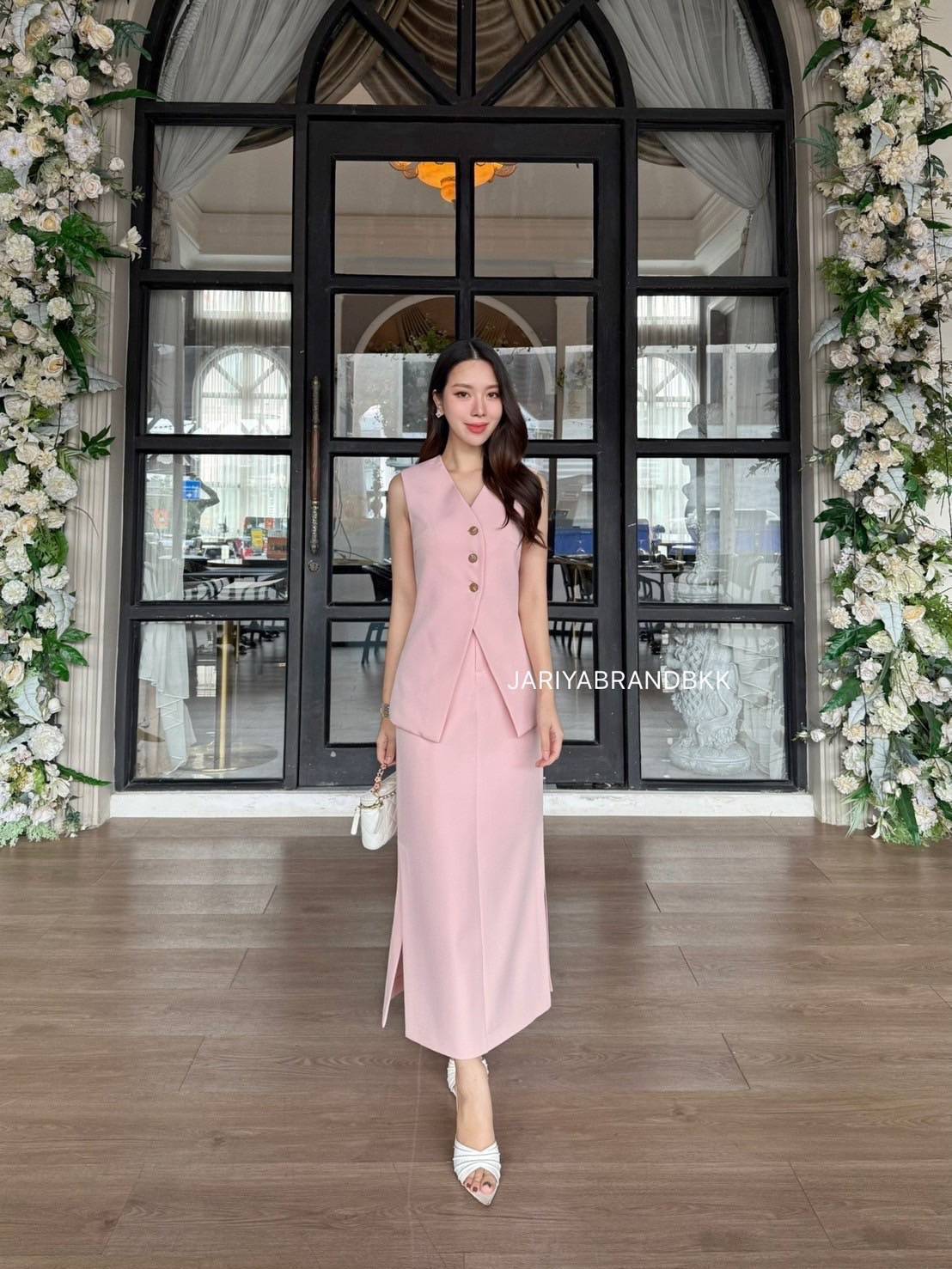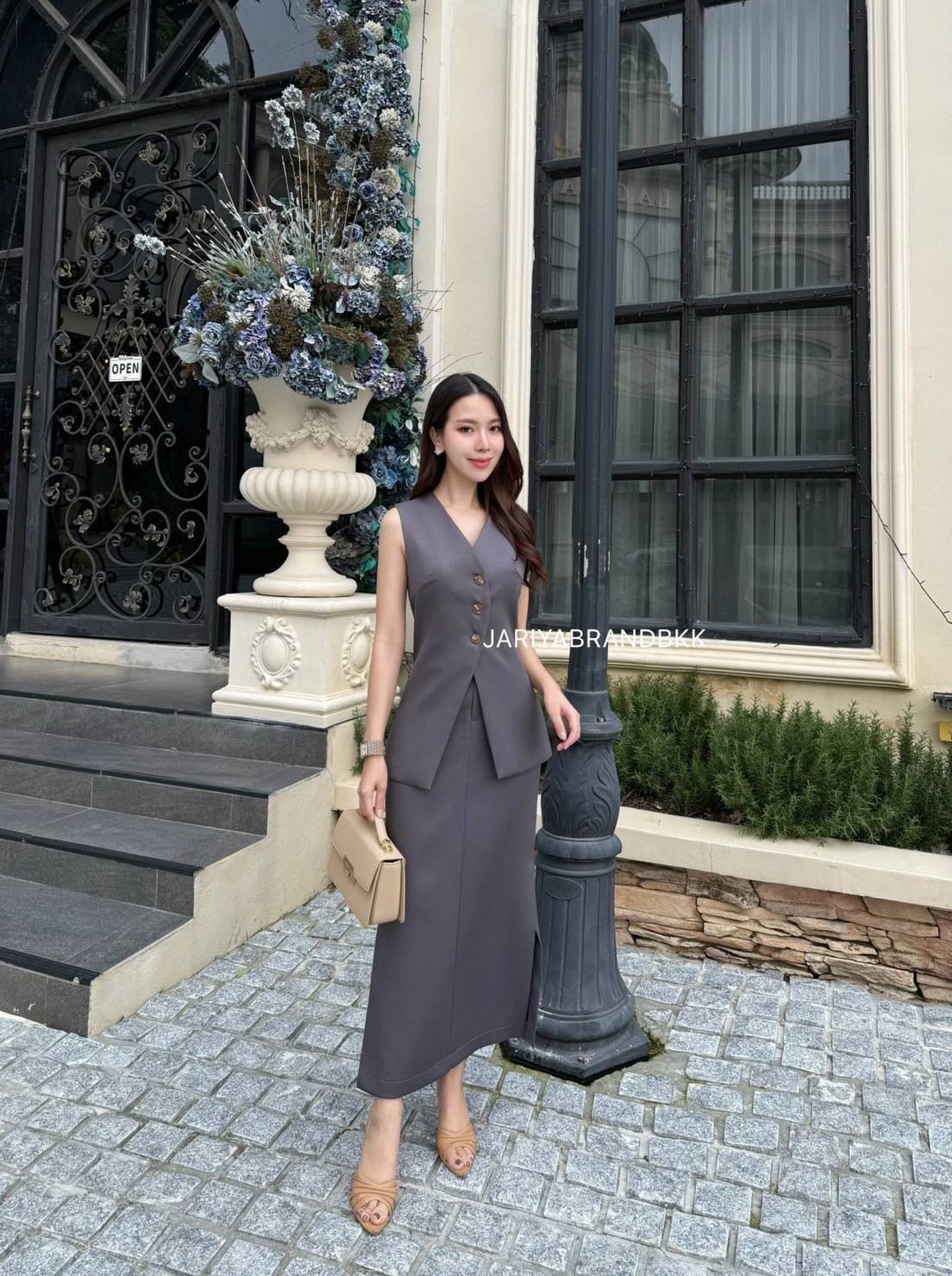 2-piece set: sleeveless V-neck top with front buttons, paired with a high-waisted long skirt featuring a side slit in the same color as the top. Super stylish and very comfortable to wear. The actual product looks stunning β soft fabric, elegant design, high-quality tailoring. It looks premium and feels amazing on!