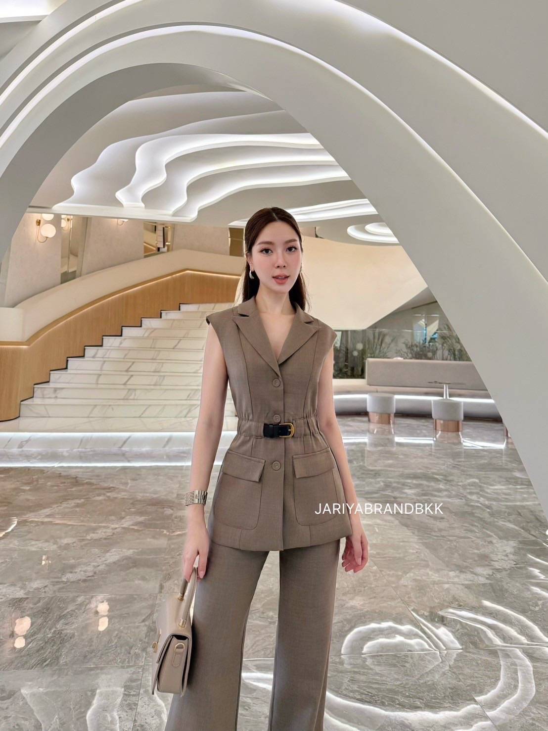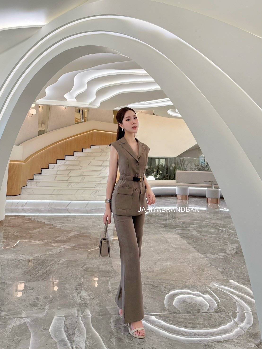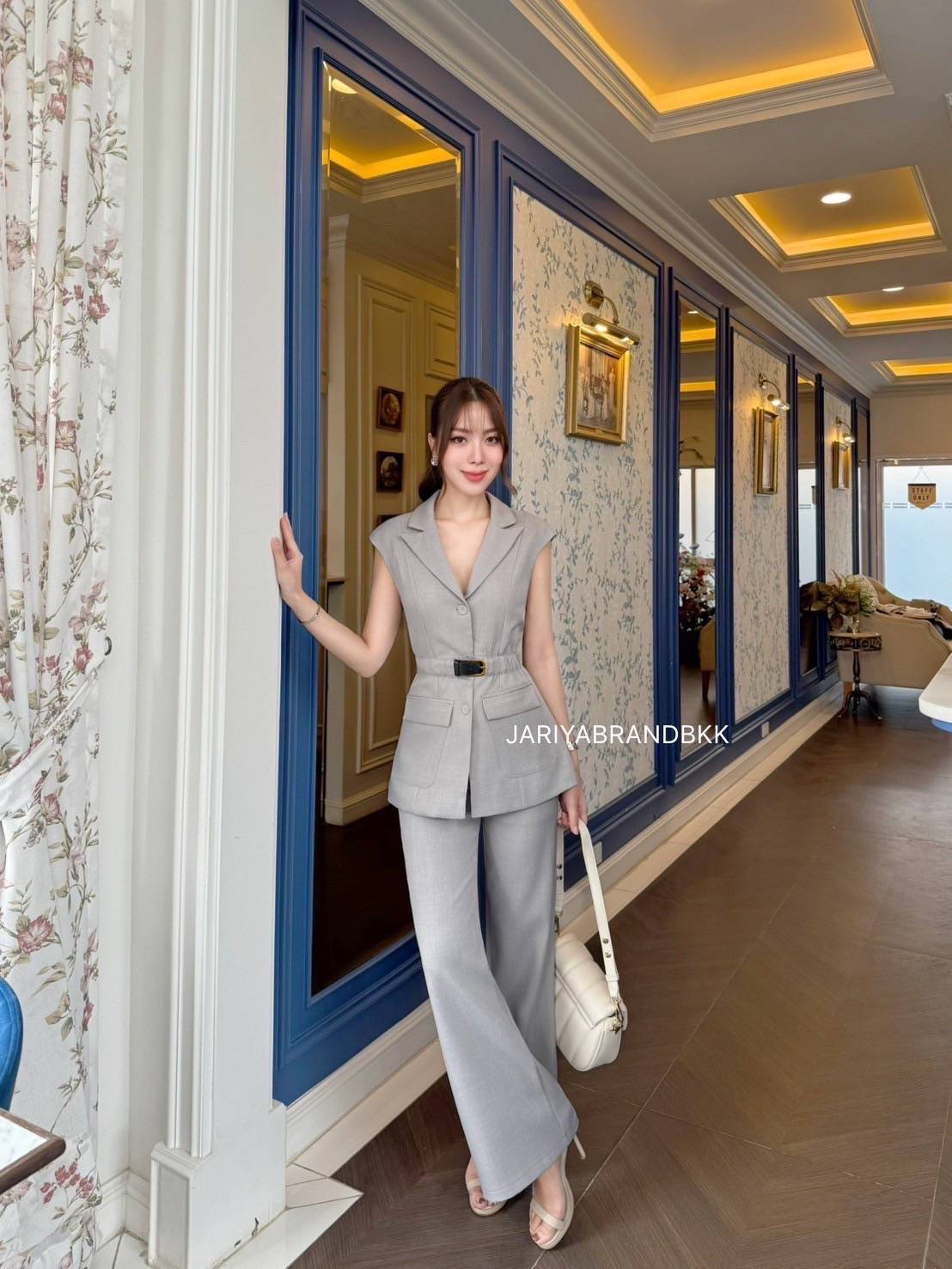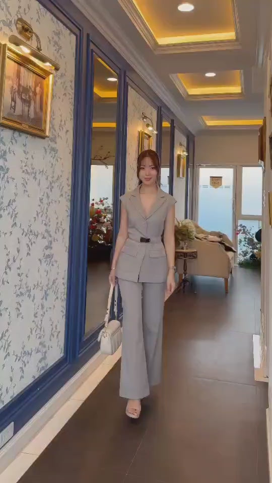 Includes a collared sleeveless top with a matching belt and high-waisted straight-leg trousers.
