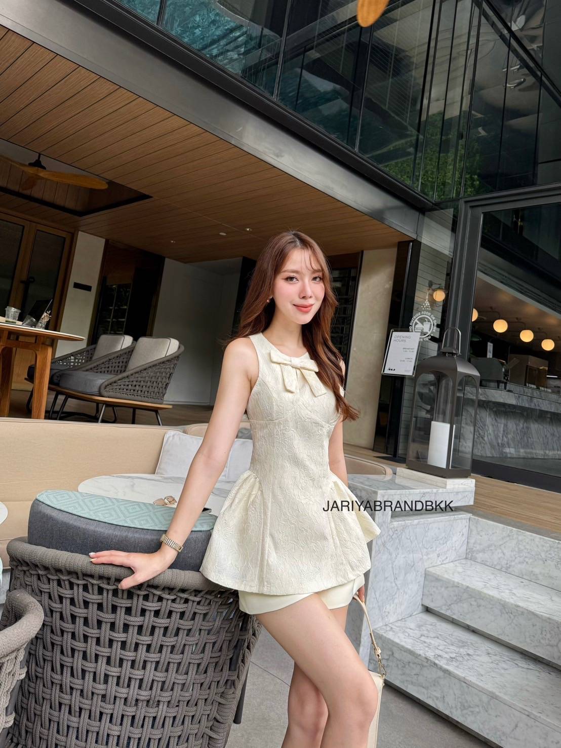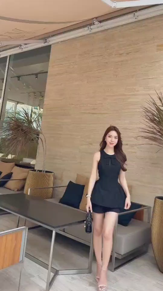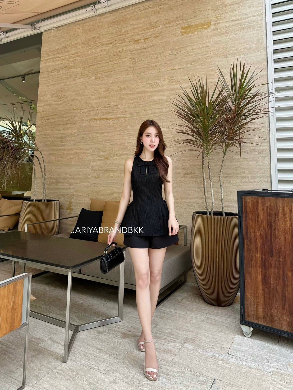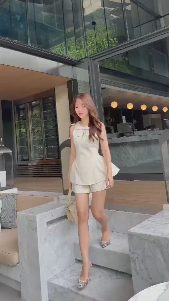 This elegant 2-piece set features a sleeveless lace top with a bow-tie collar, paired with matching high-waisted shorts.