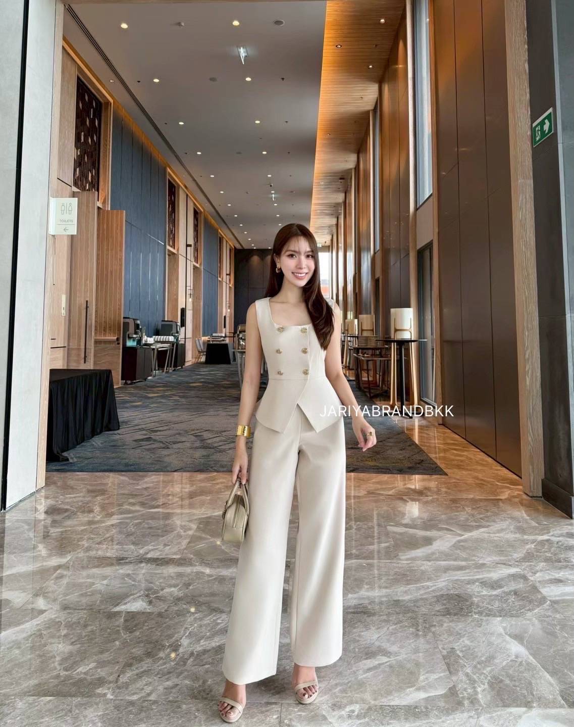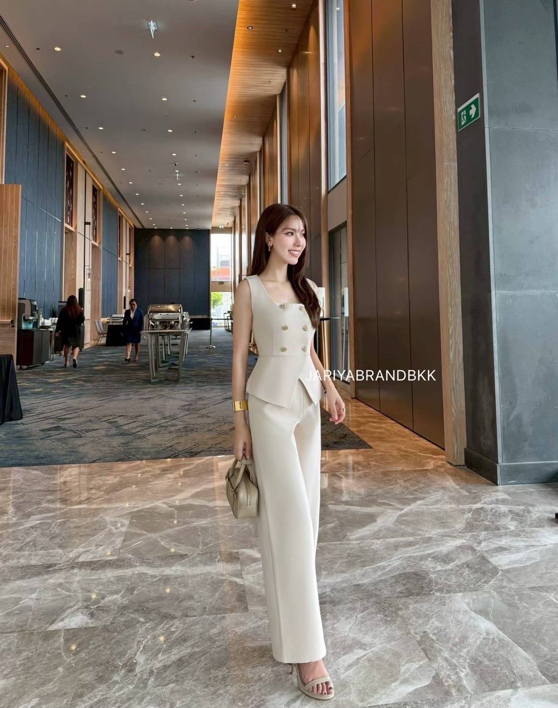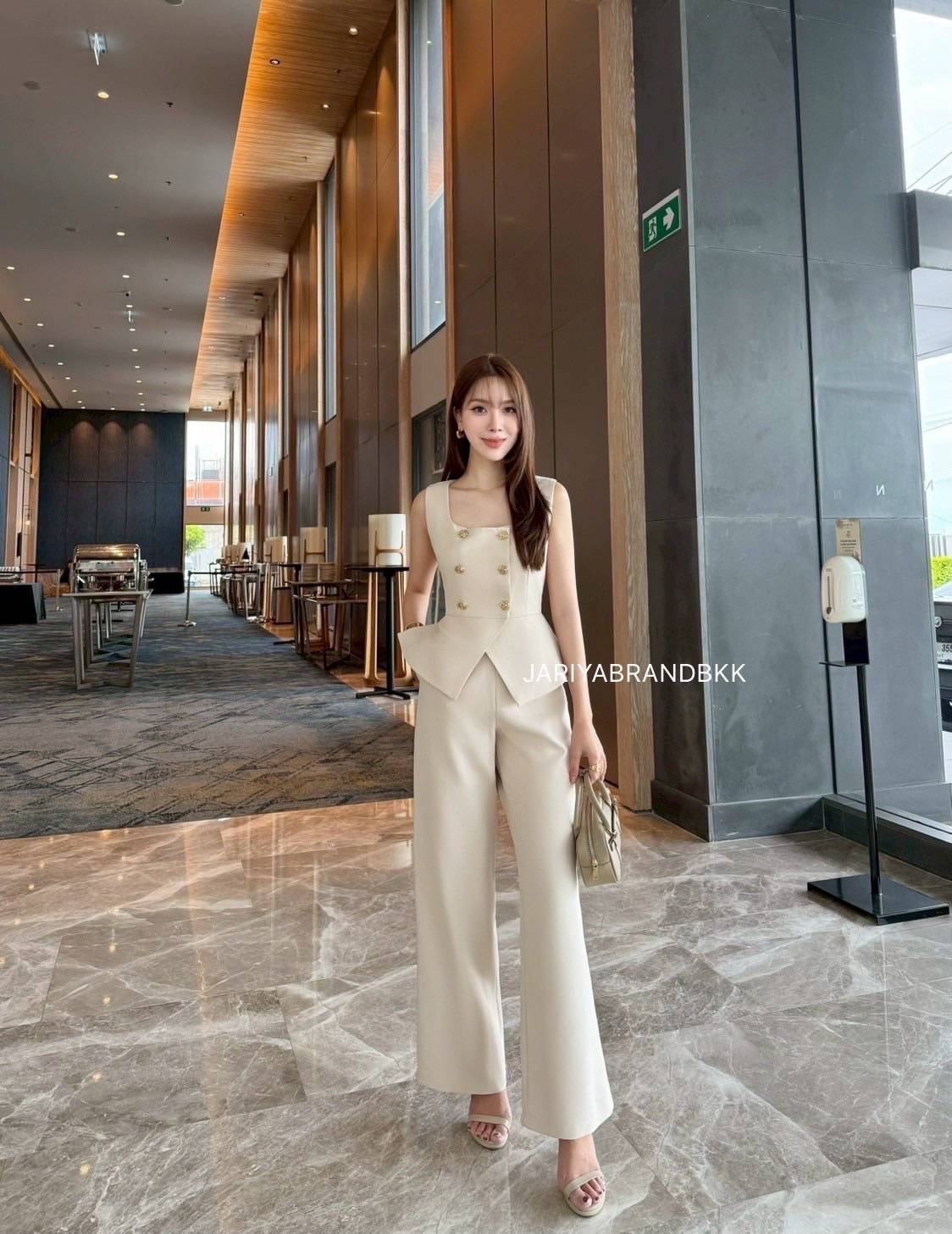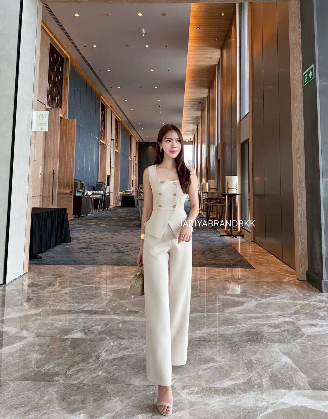 This chic 2-piece tailored set includes a sleeveless U-neck top with gold button details, paired with high-waisted long pants in matching fabric. Made from structured suiting fabric that’s soft, breathable, and holds its shape beautifully.