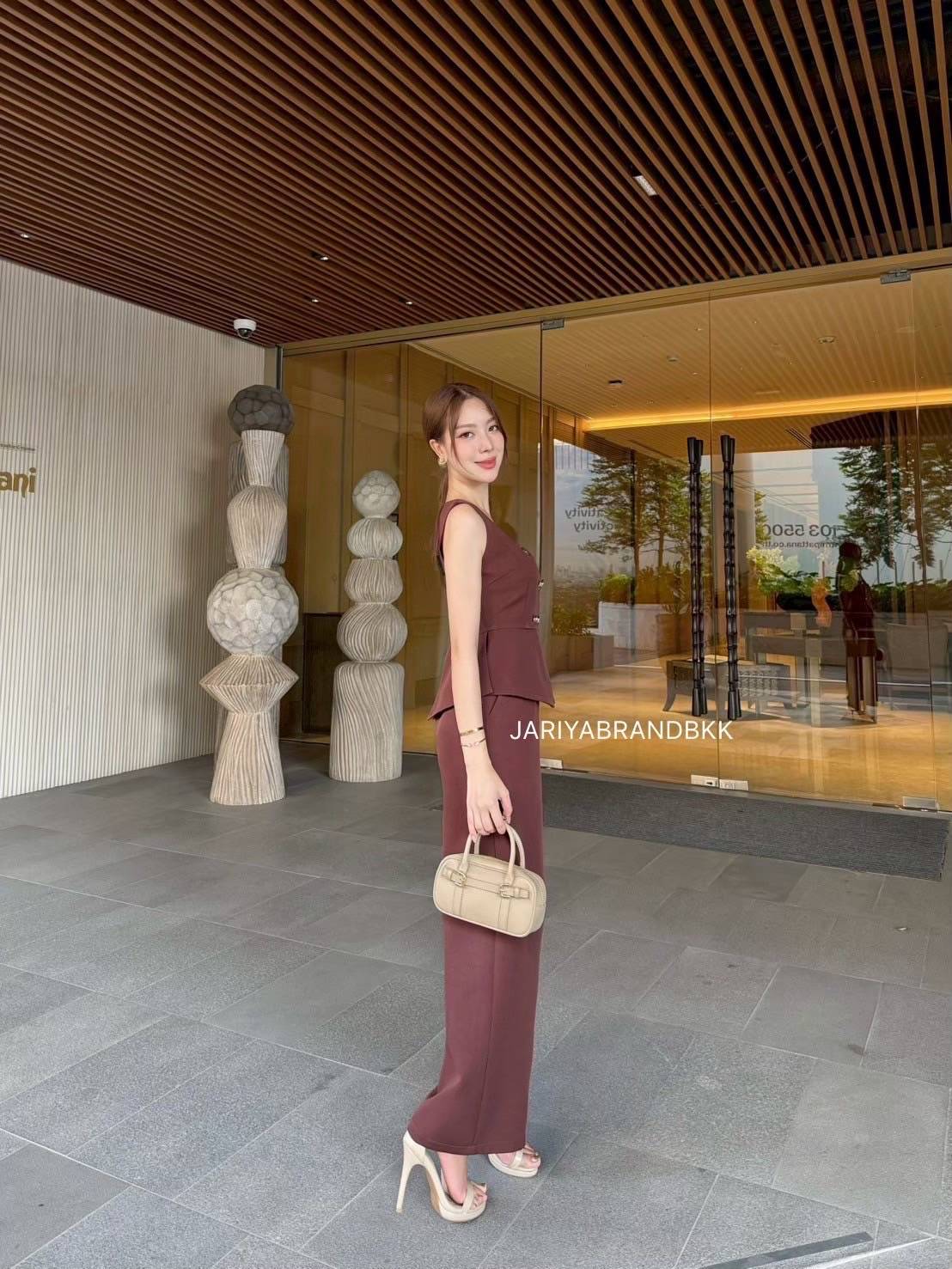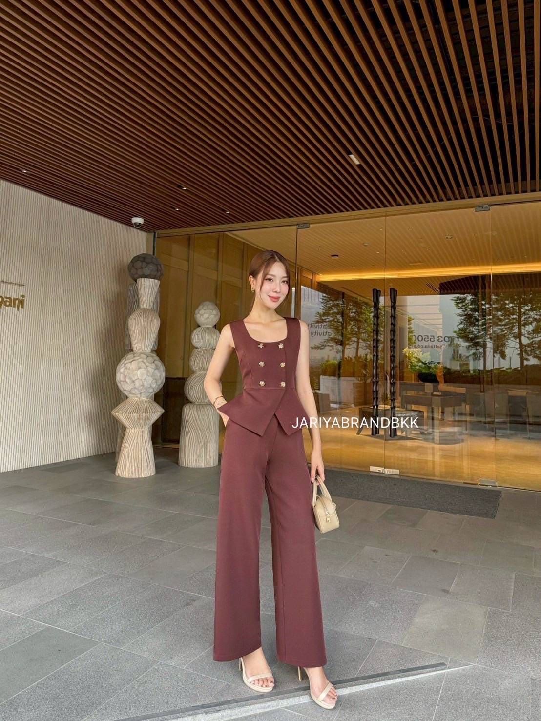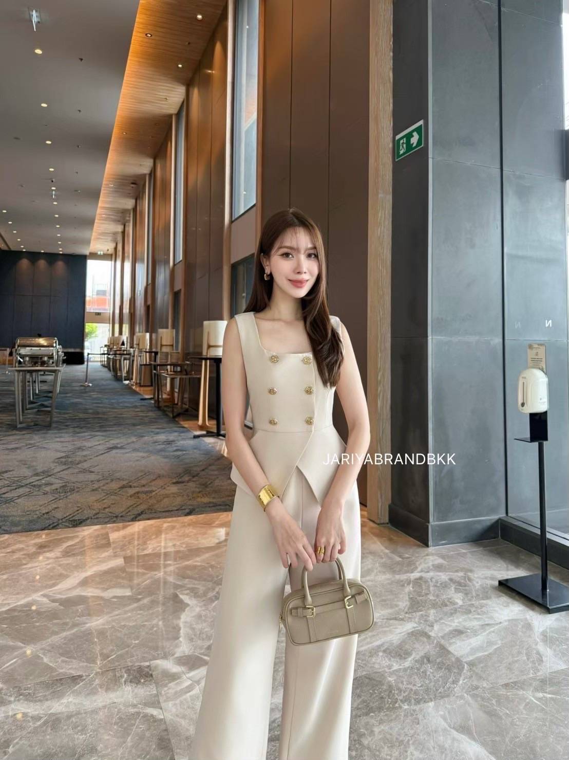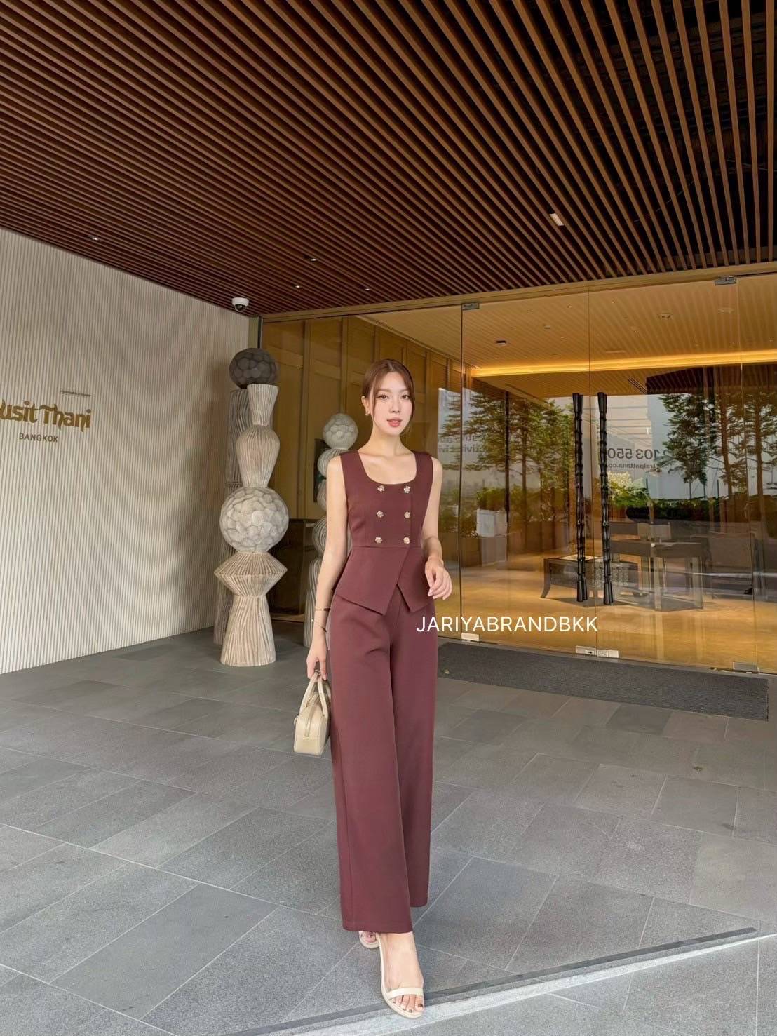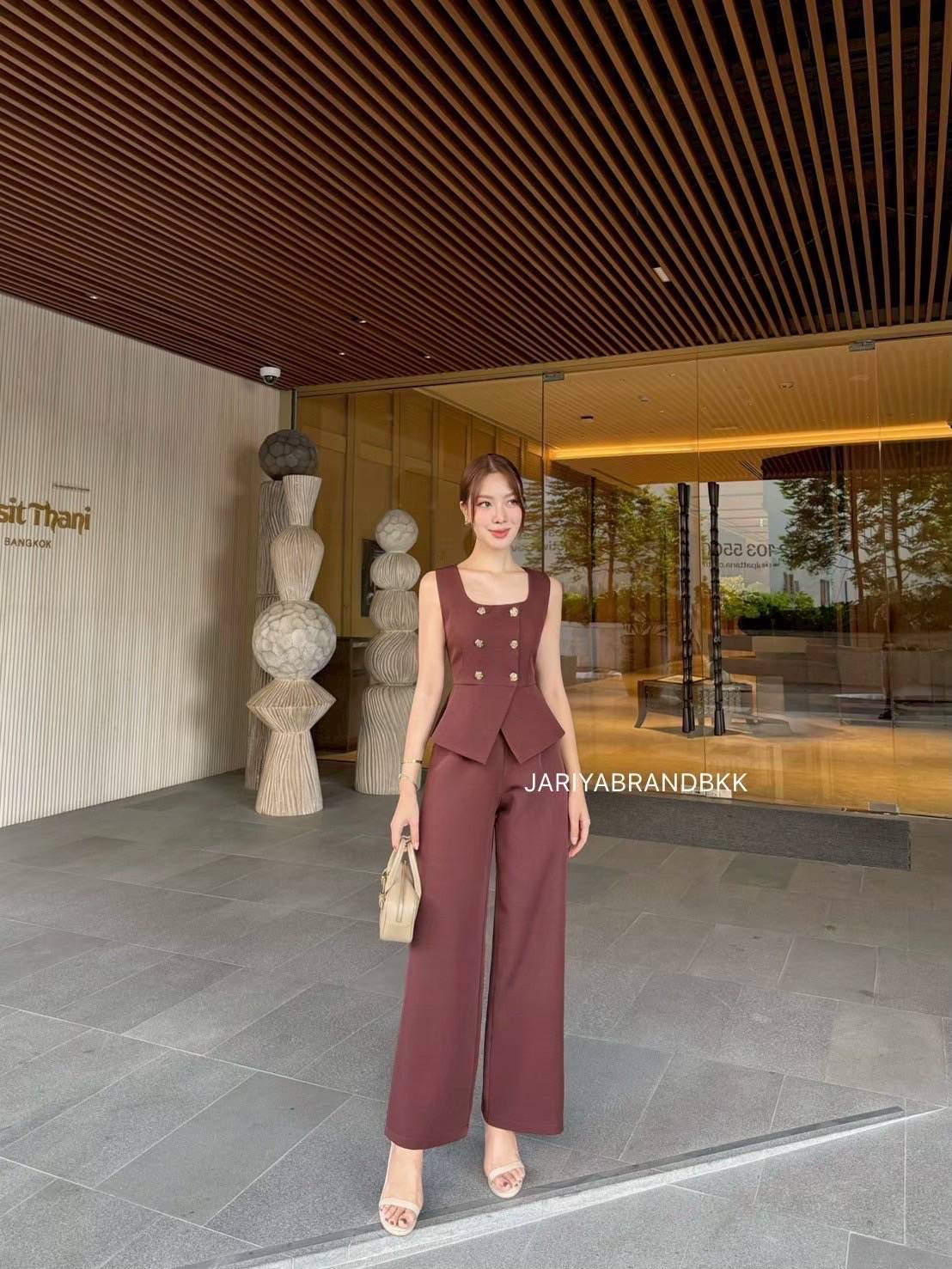This chic 2-piece tailored set includes a sleeveless U-neck top with gold button details, paired with high-waisted long pants in matching fabric. Made from structured suiting fabric that’s soft, breathable, and holds its shape beautifully.