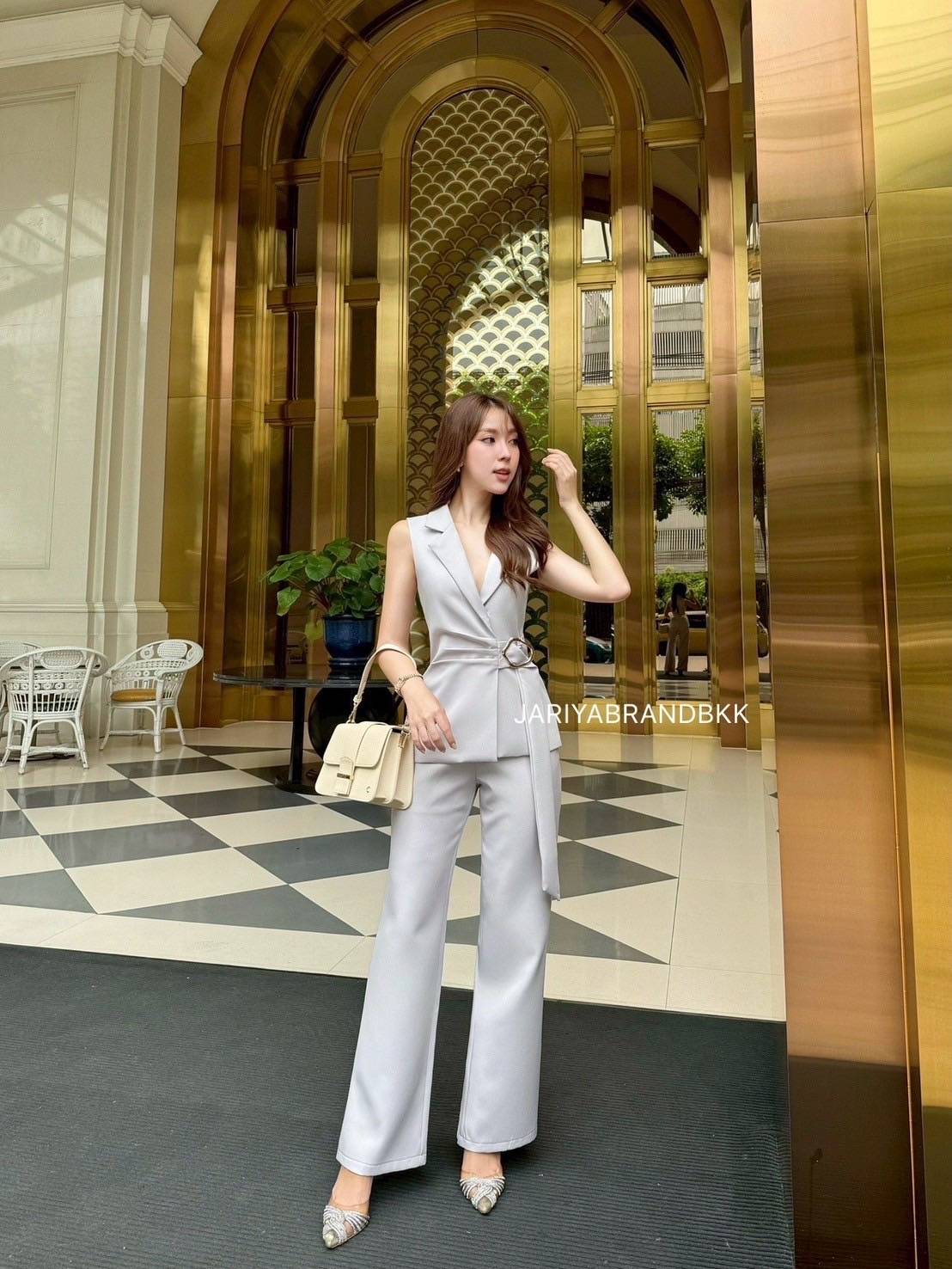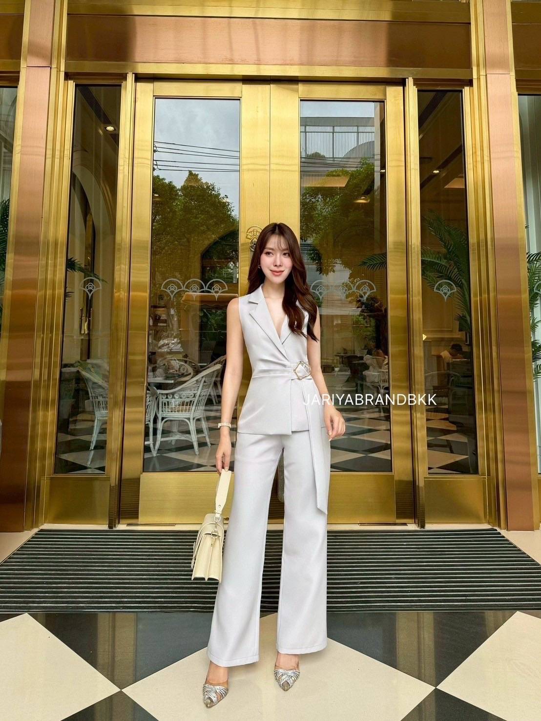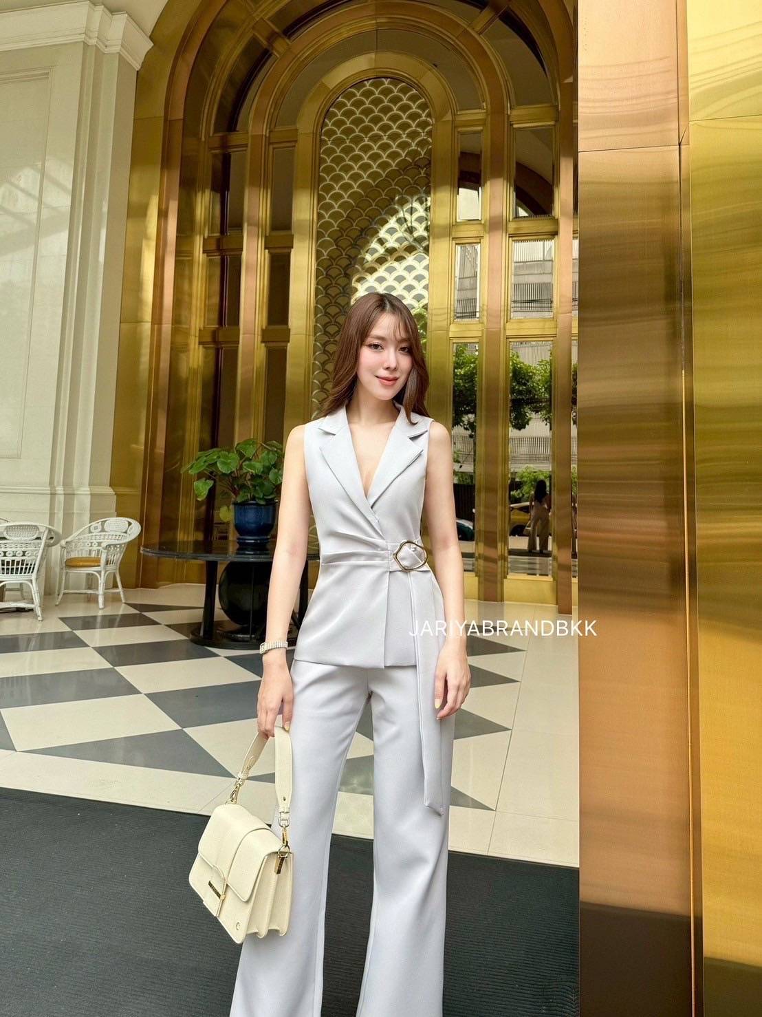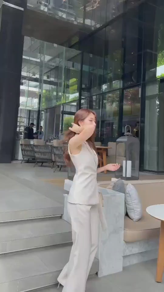 This chic 2-piece set features a structured suit fabric with a sleeveless collared top with a buckle detail, paired with matching long pants. Designed for a comfortable yet polished look, this set fits beautifully and feels soft to wear. Perfect for both work and special occasions with a sophisticated and luxurious touch.
