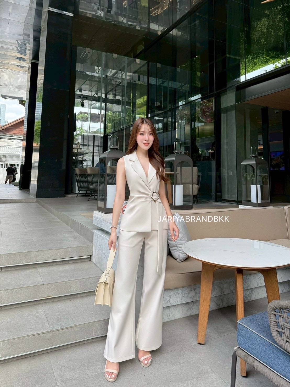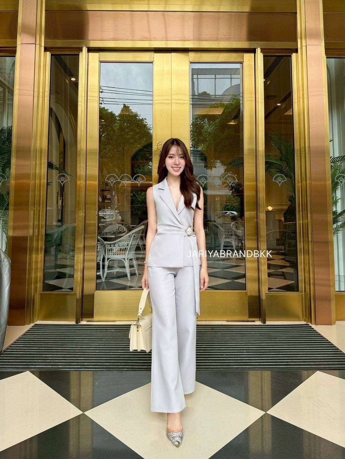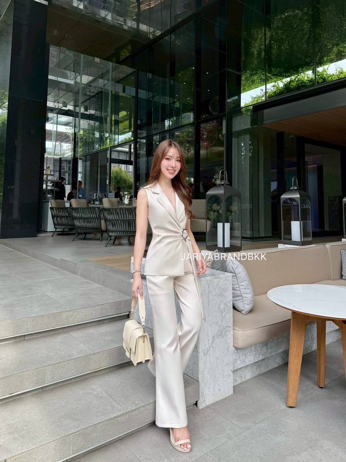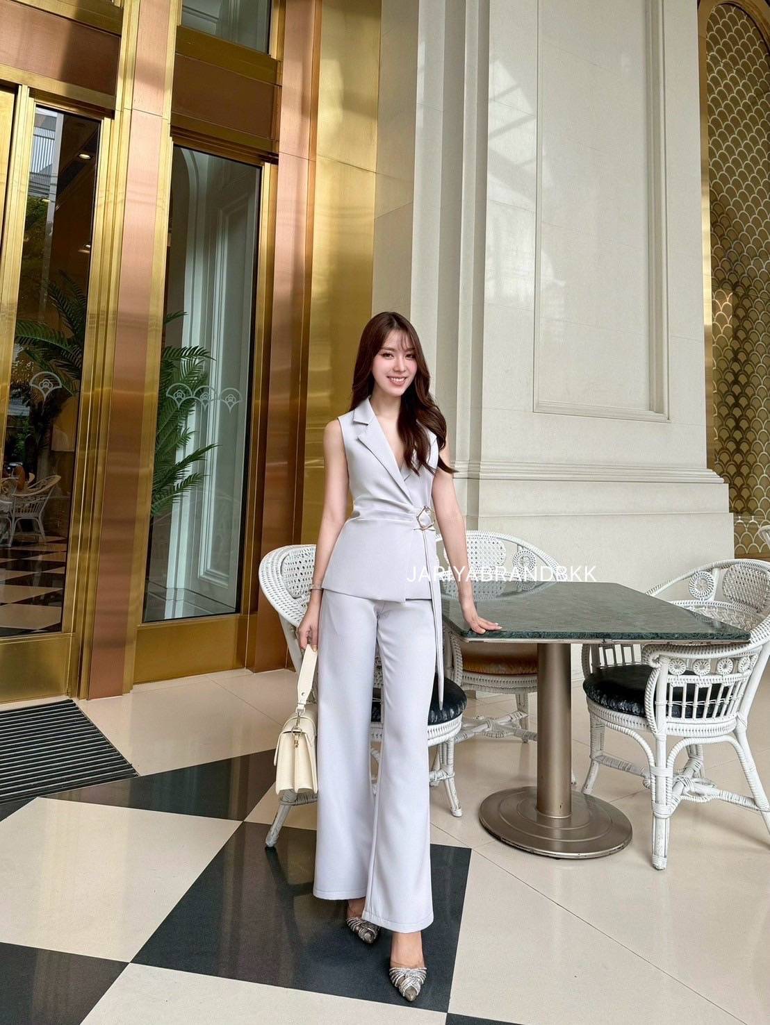 This chic 2-piece set features a structured suit fabric with a sleeveless collared top with a buckle detail, paired with matching long pants. Designed for a comfortable yet polished look, this set fits beautifully and feels soft to wear. Perfect for both work and special occasions with a sophisticated and luxurious touch.