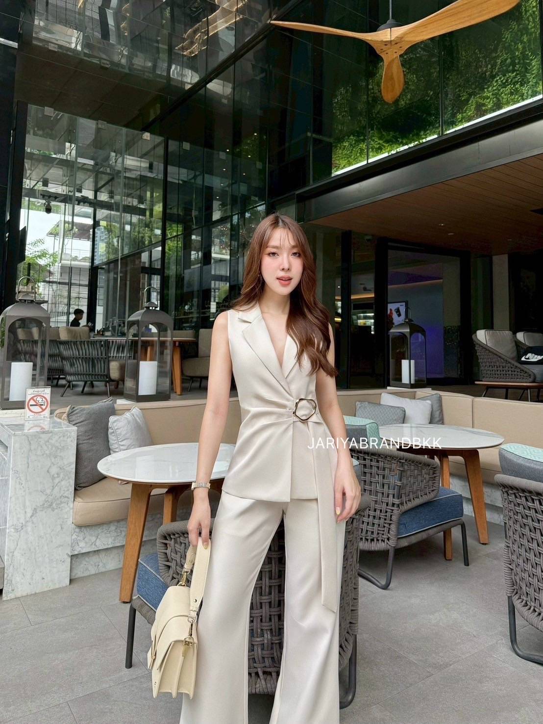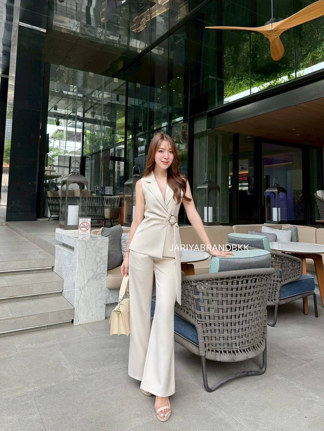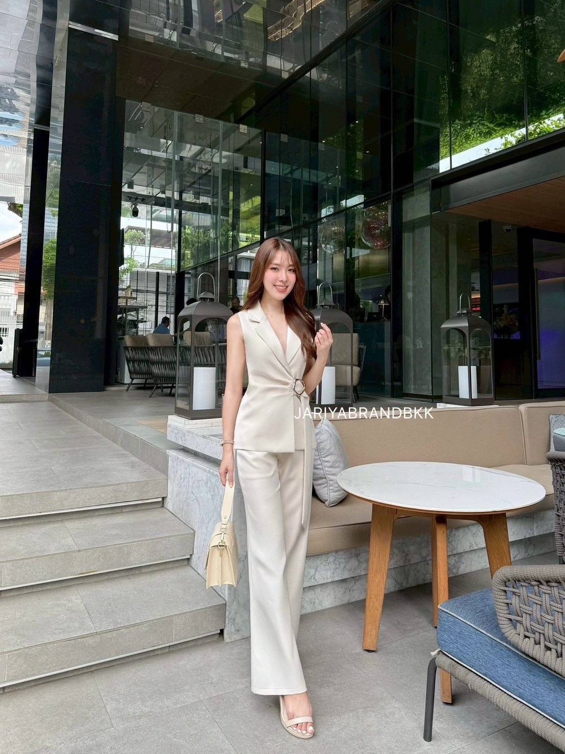 This chic 2-piece set features a structured suit fabric with a sleeveless collared top with a buckle detail, paired with matching long pants. Designed for a comfortable yet polished look, this set fits beautifully and feels soft to wear. Perfect for both work and special occasions with a sophisticated and luxurious touch.
