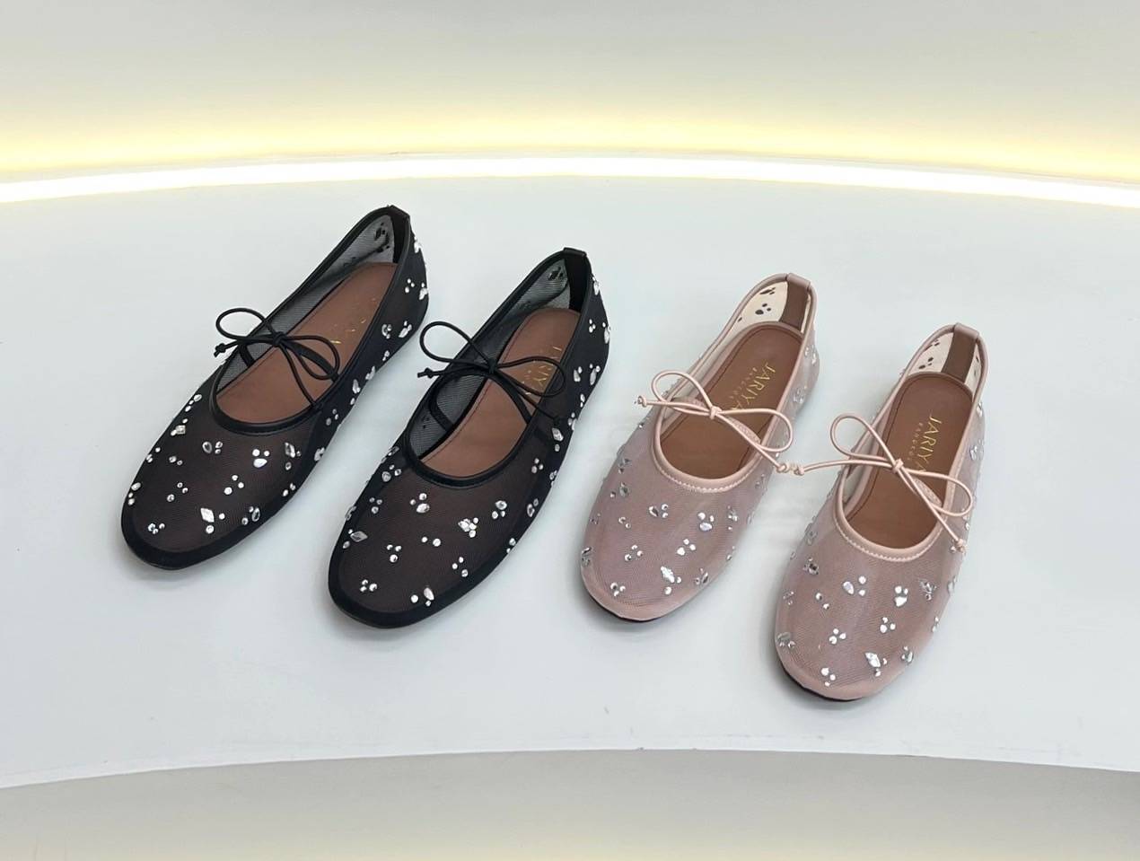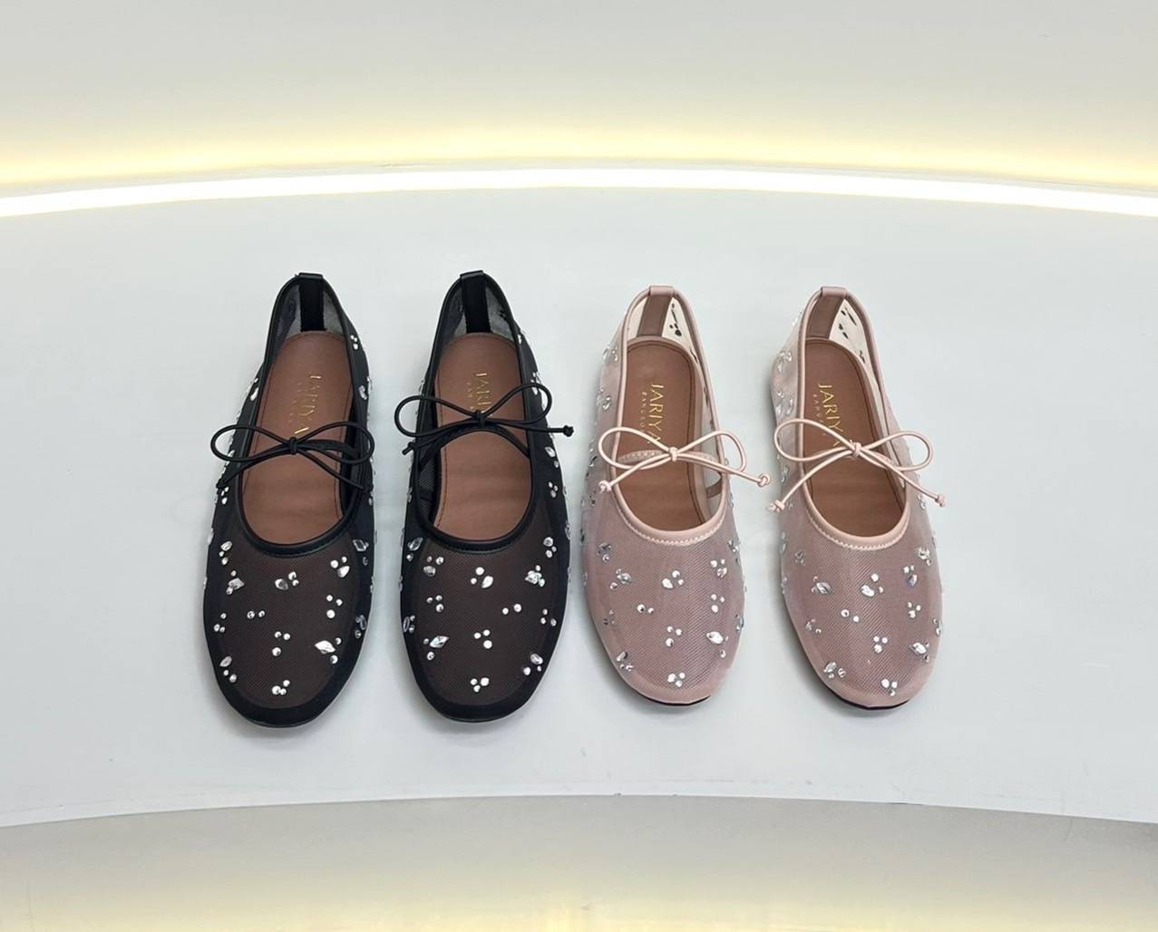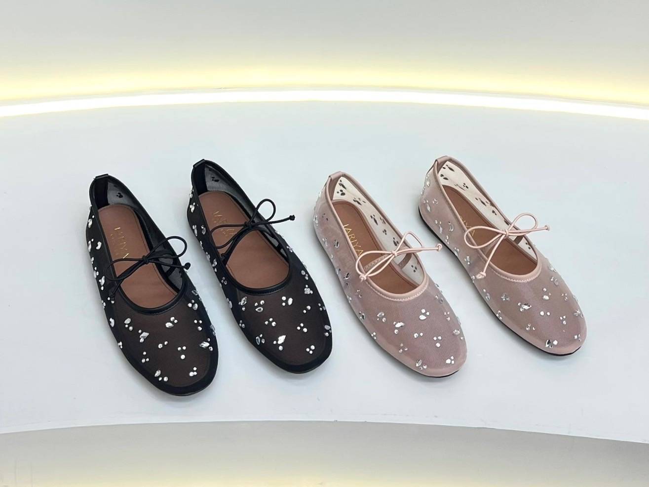 Chic closed-toe flats featuring a delicate bow strap across the foot, made from mesh fabric adorned with rhinestones.