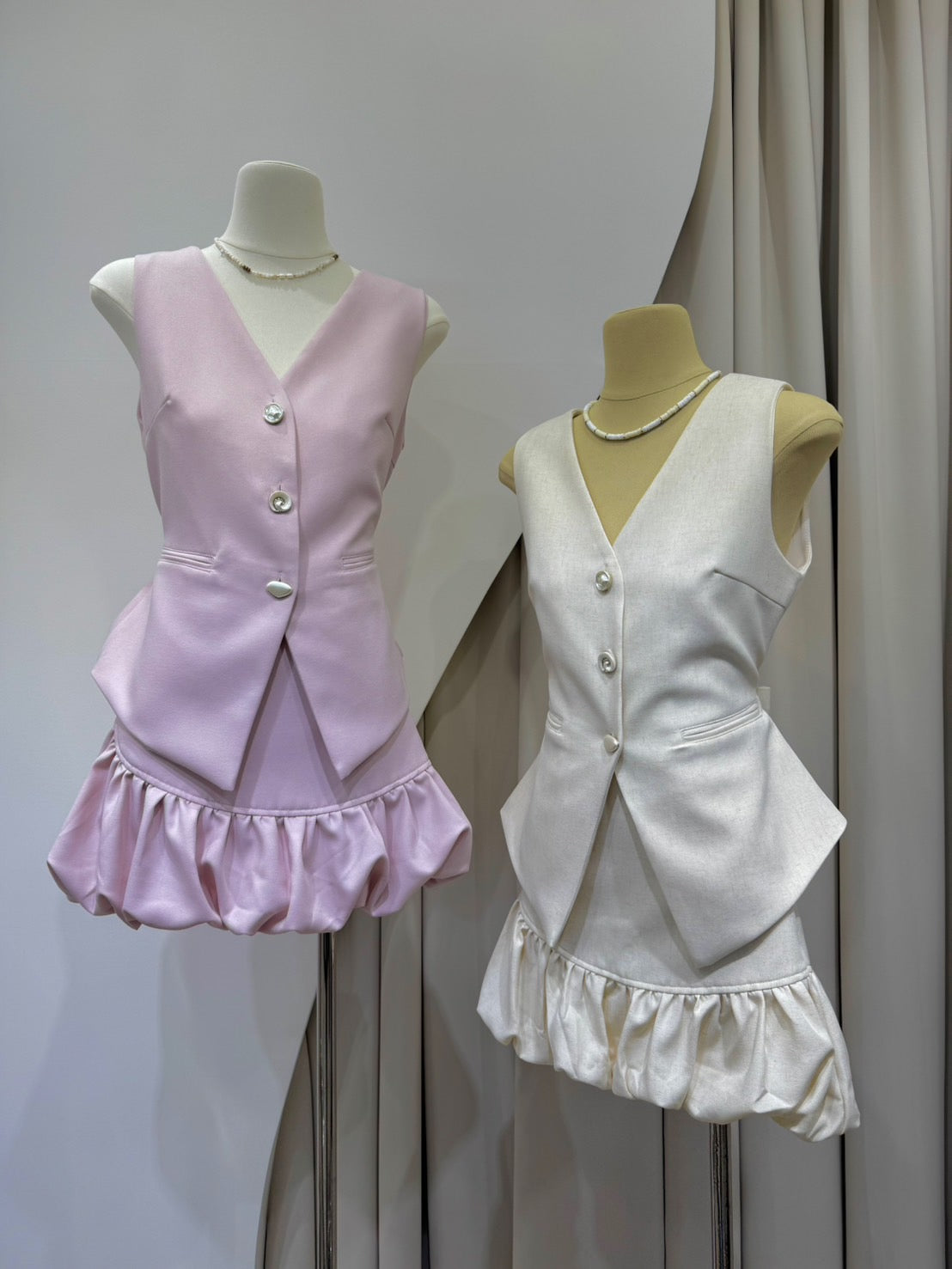 🤍 This sophisticated two-piece set is tailored from a high-quality linen-blend fabric featuring a unique woven pattern. The top is elegantly designed with a V-neckline, front closure adorned with pearl buttons, and a refined ribbon tie at the back for added charm. It is paired with a fully lined balloon-style skirt, offering both structure and comfort. Worn together, the ensemble delivers a graceful and polished look, while each piece can also be styled separately for versatile and timeless appeal.
