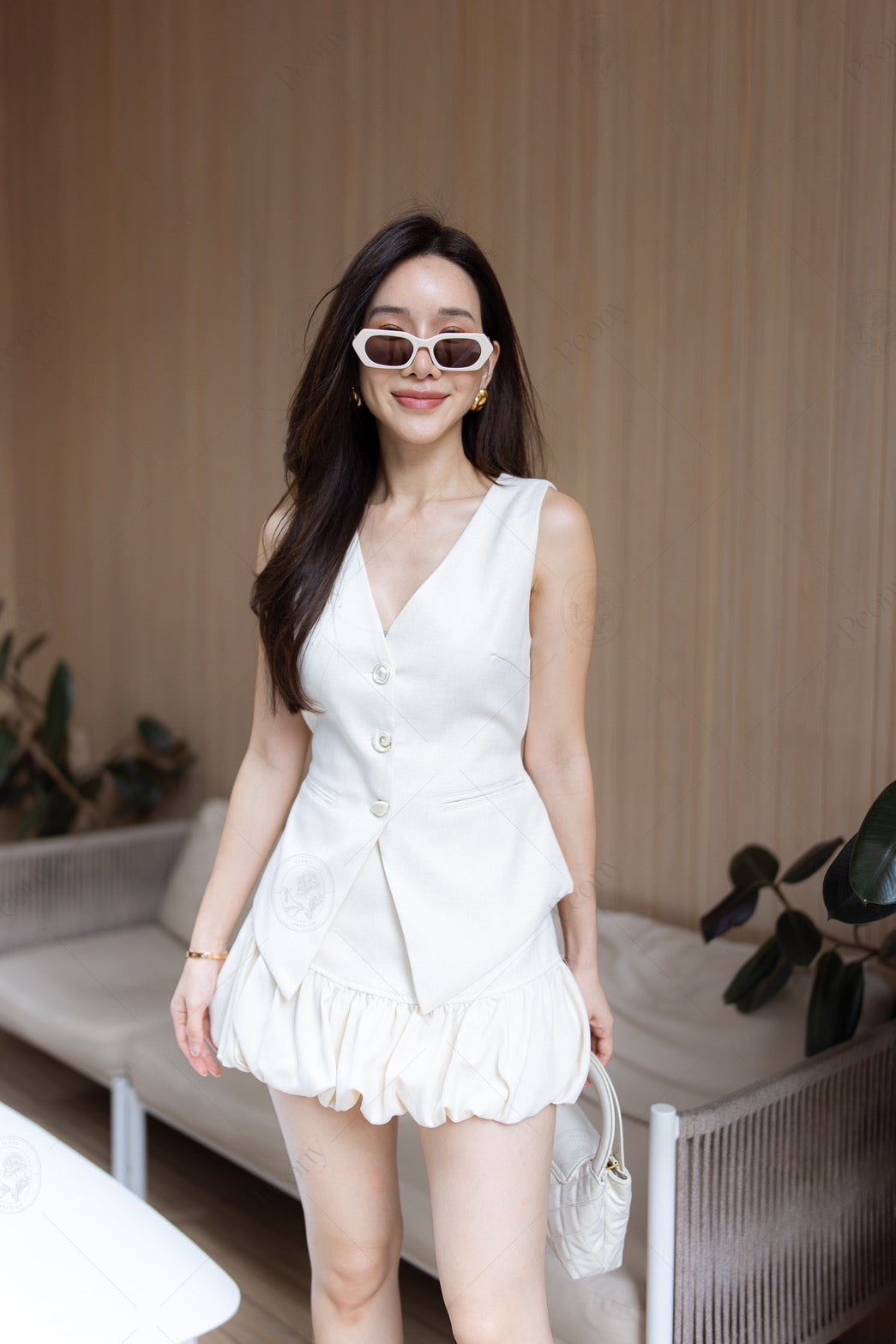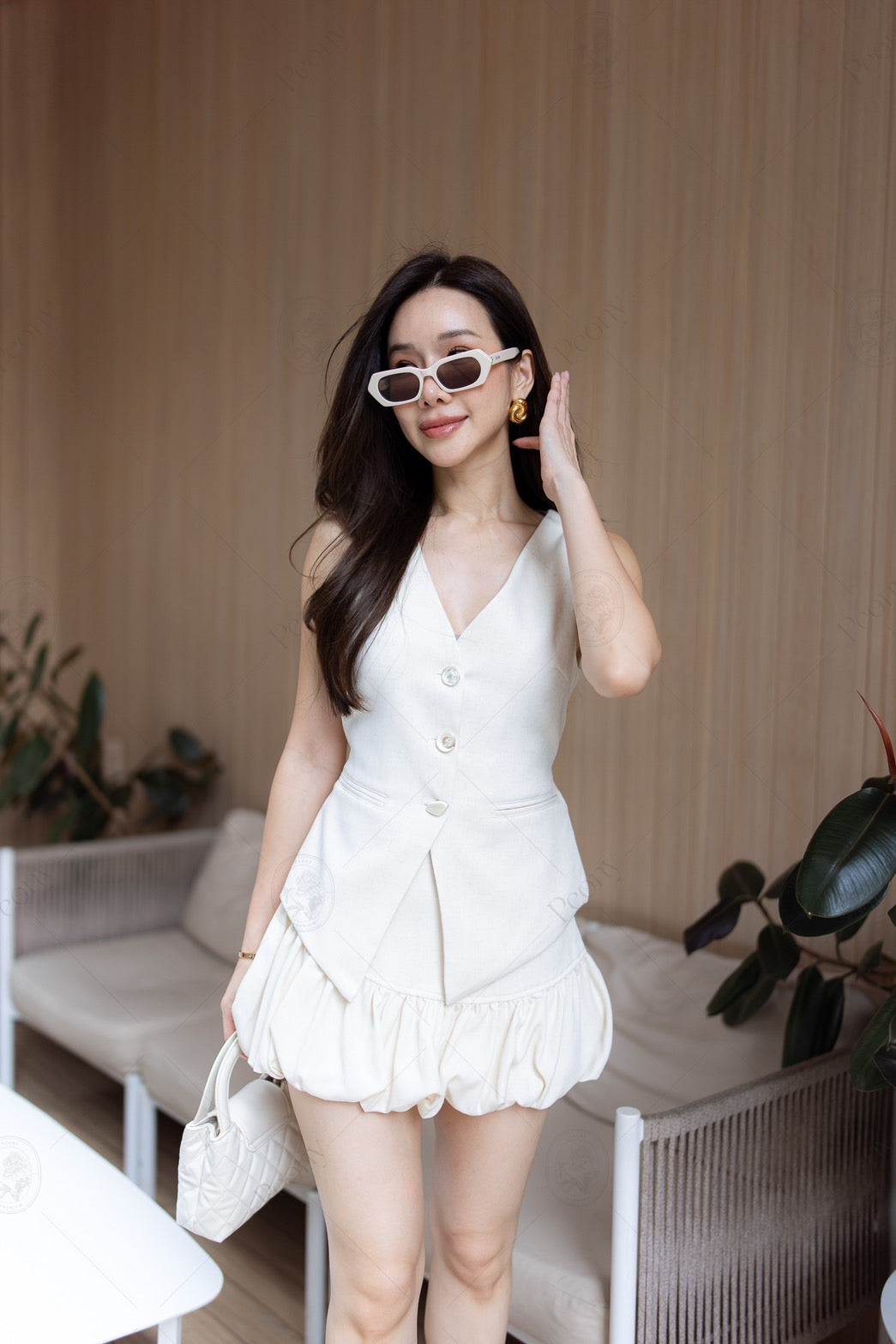 🤍 A charming linen-blend set featuring a unique woven pattern. The top comes with a V-neckline, front pearl buttons, and a cute ribbon tie at the back. Paired with a balloon-shaped skirt that includes inner lining for extra comfort. Wear it as a matching set for an adorable look, or mix and match for versatile styling.