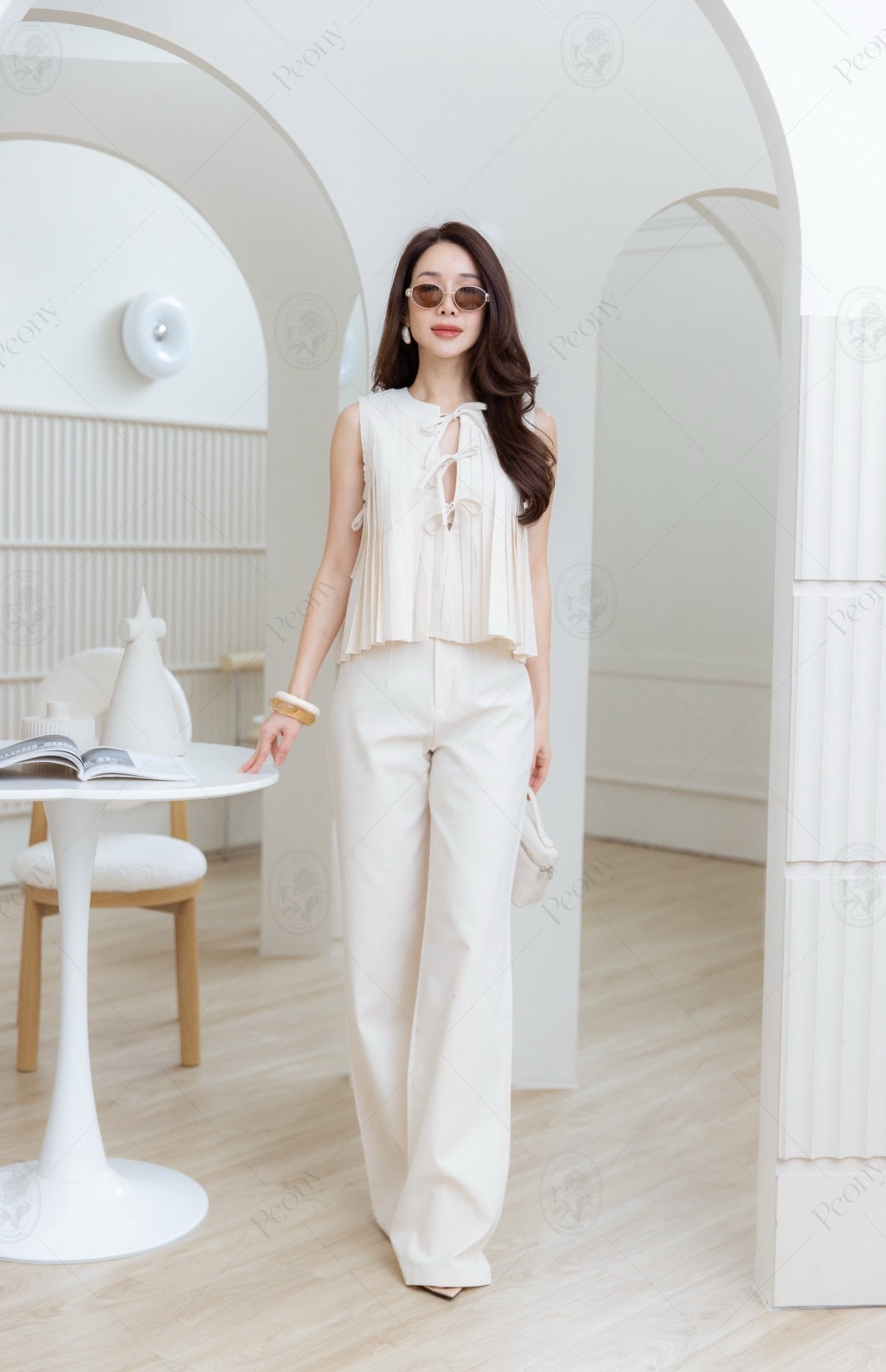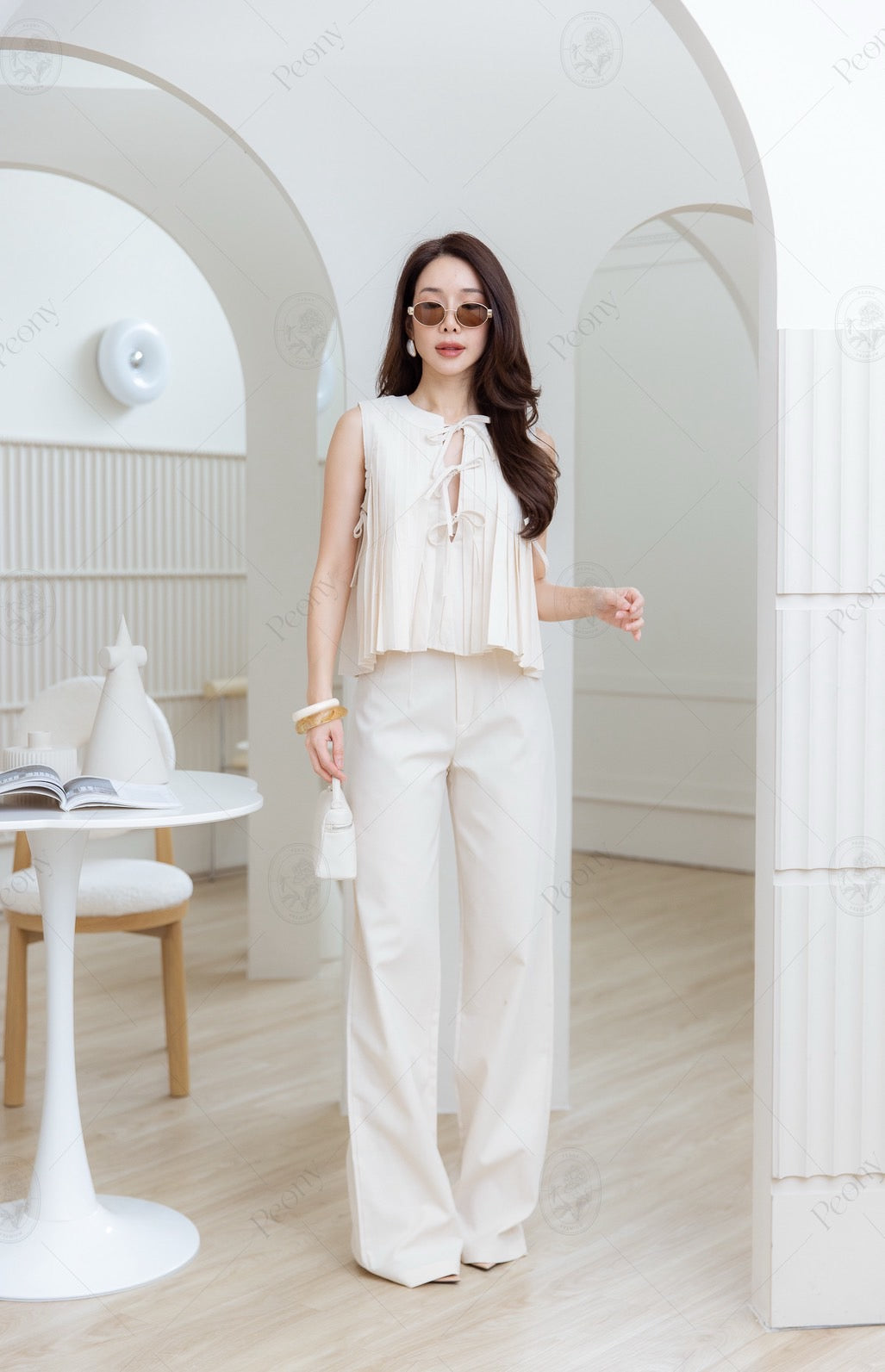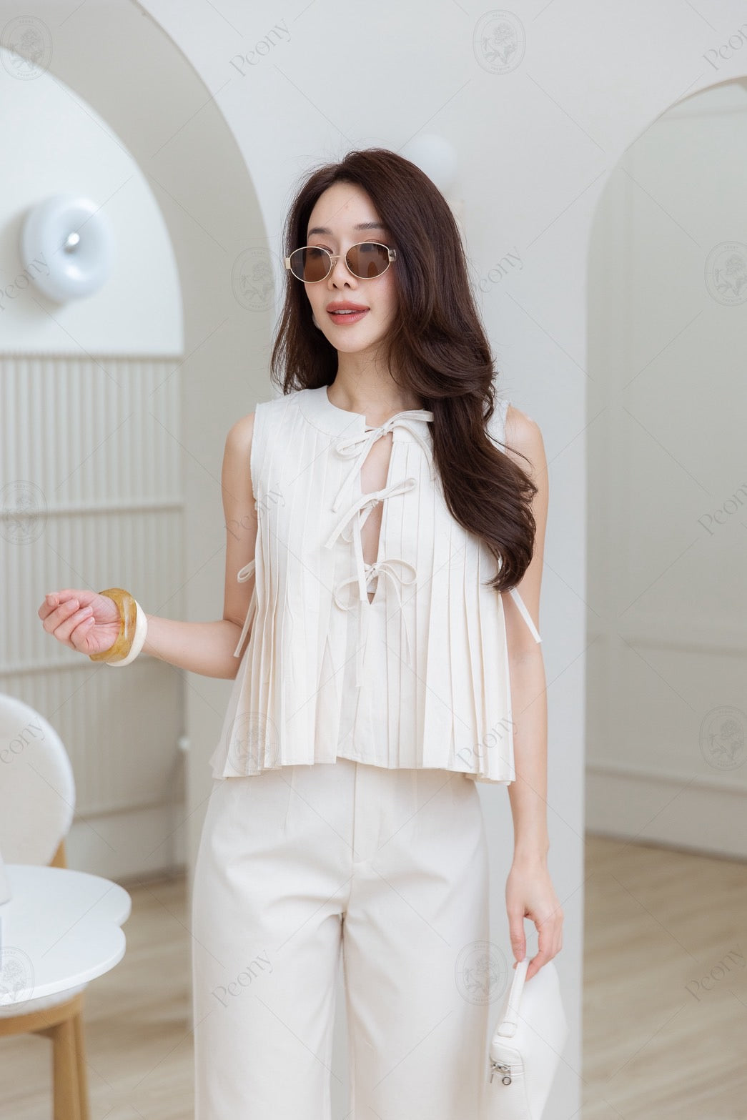 A beautiful set made from a cotton-linen blend with subtle woven texture. The top features all-around pleats, a V-neckline, and a delicate bow tie detail. Paired with high-waisted, full-length trousers with a flattering cut â this set creates a complete, charming, and soft look with a touch of playful elegance.