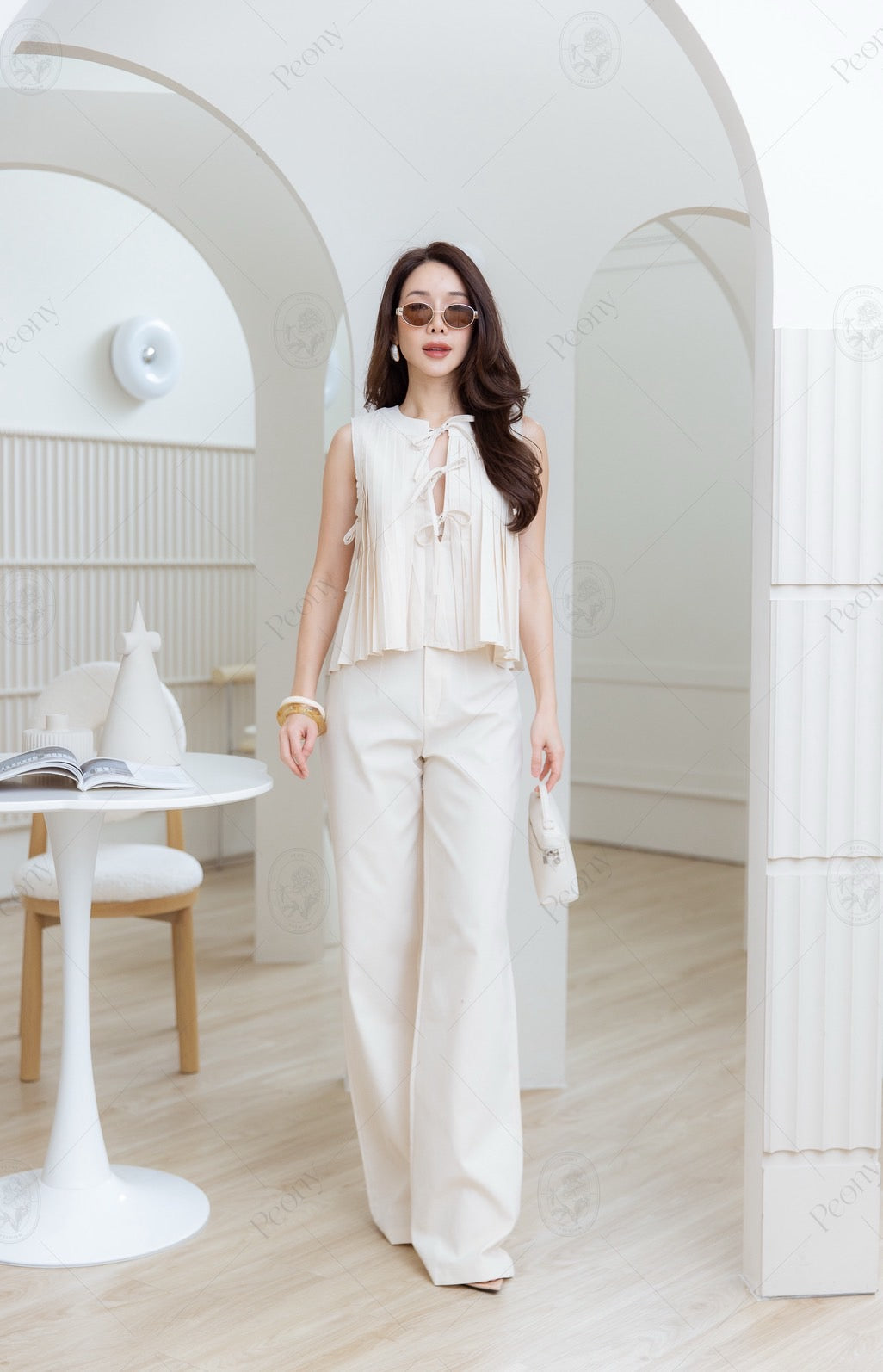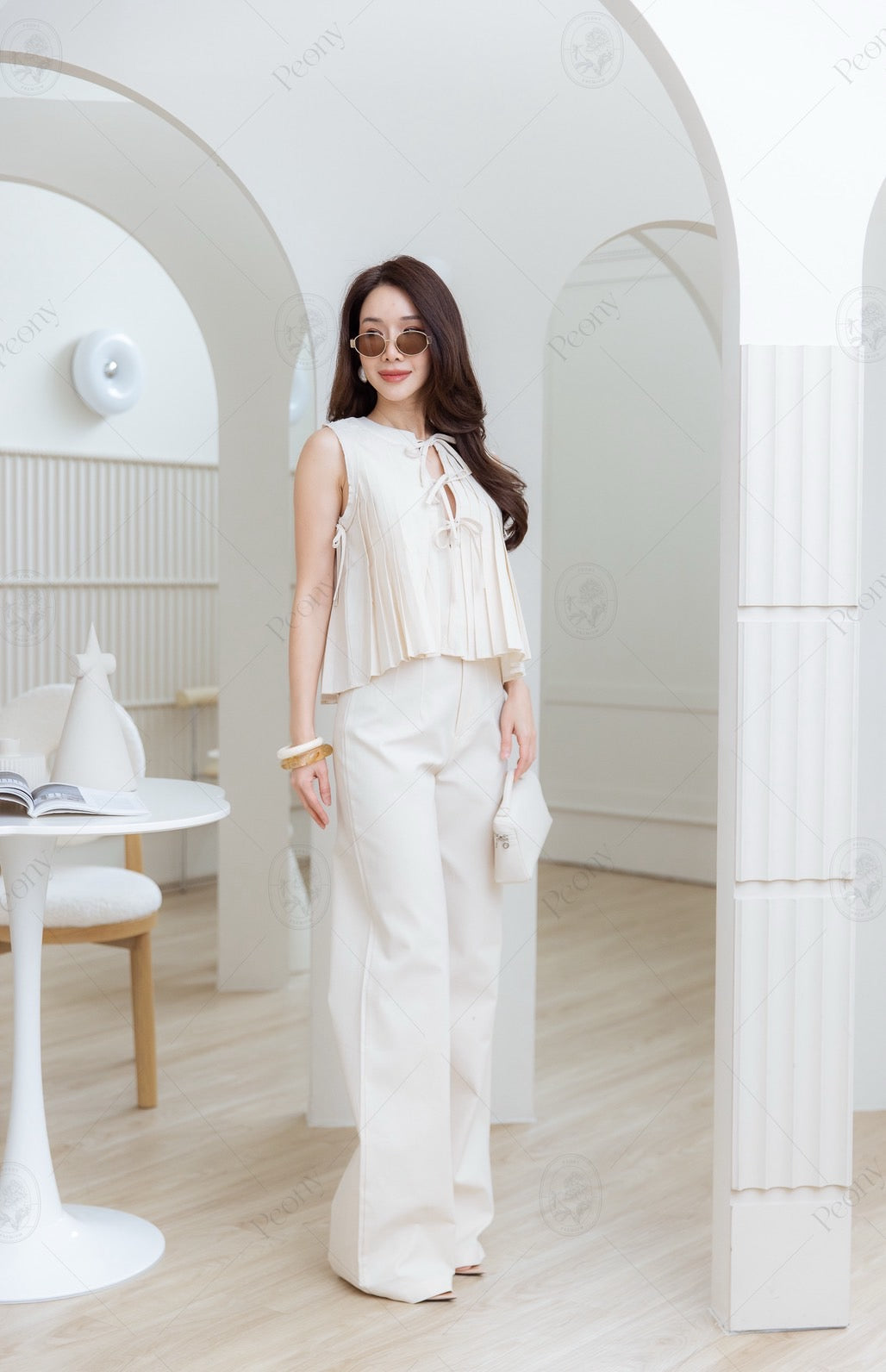 A soft and elegant matching set made from a cotton-linen blend with a subtle woven texture. The top features delicate pleats all around, a V-neckline, and a bow tie detail at the neck. It’s paired with high-waisted long trousers in a flattering cut — a complete look that’s clean, cute, and full of charm.