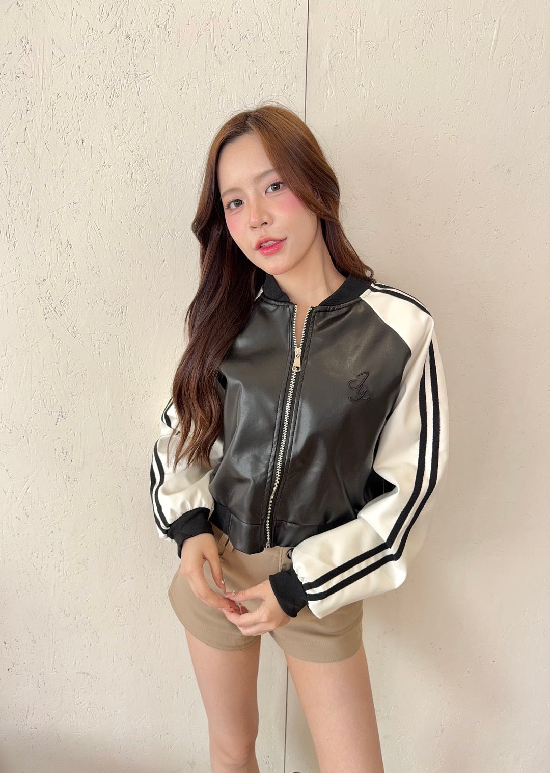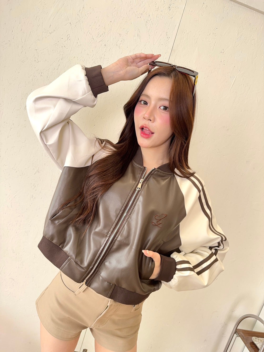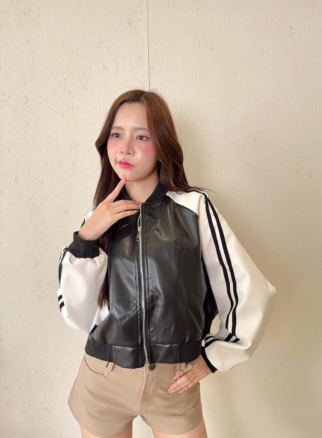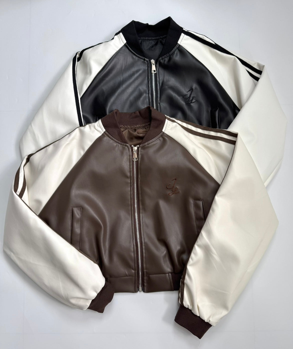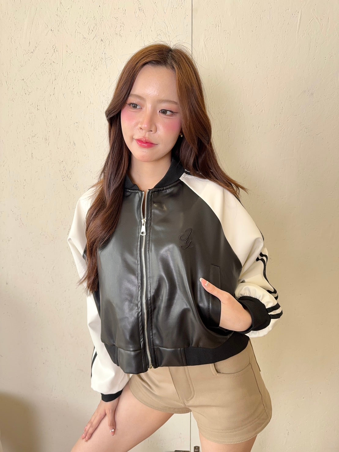 Two-tone faux leather jacket with side stripes and bold JY embroidery โ timeless style that never goes out of fashion! ๐