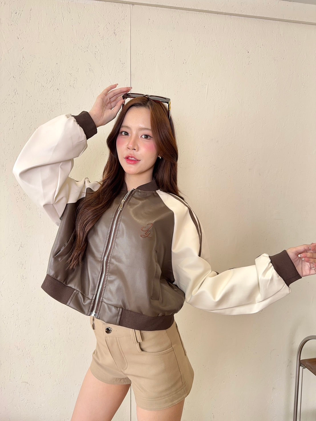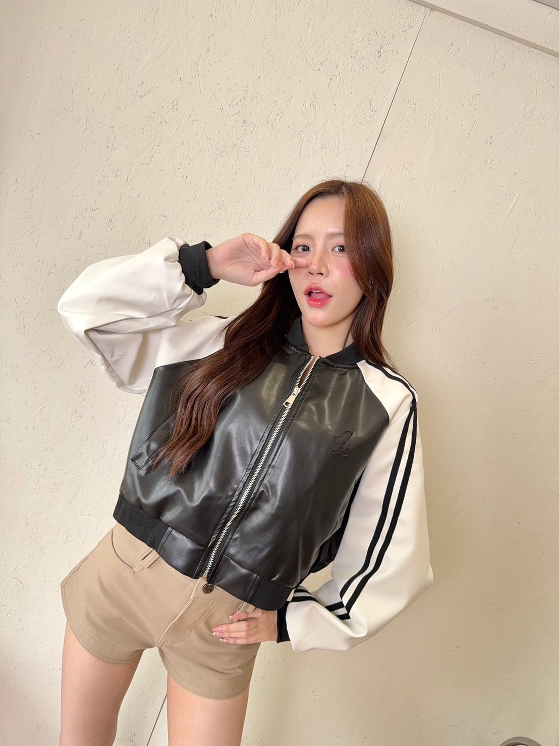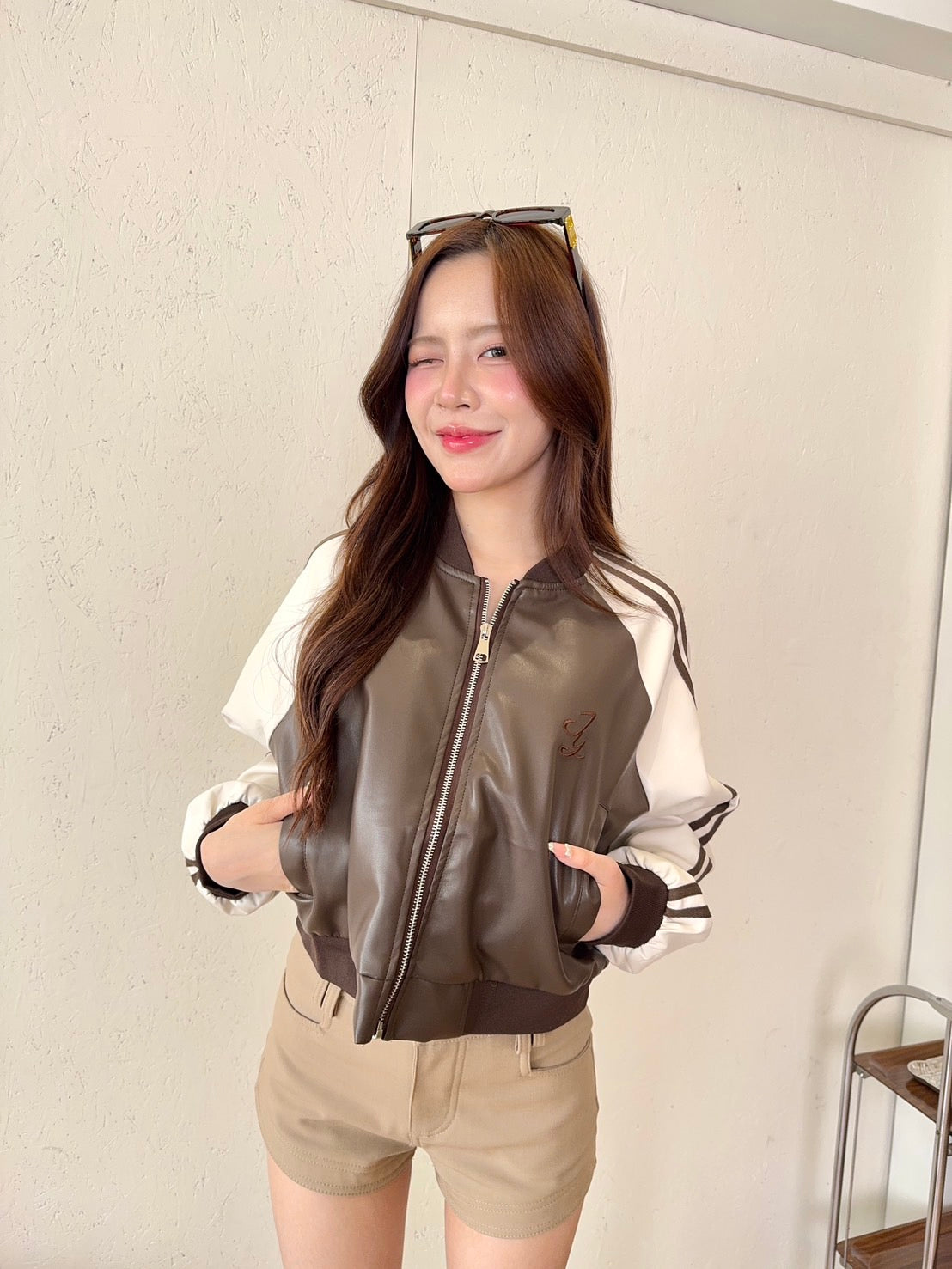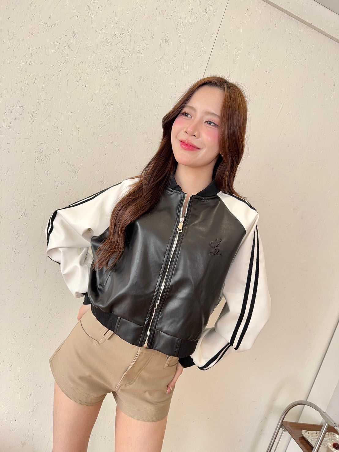 Two-tone faux leather jacket with side stripes and bold JY embroidery โ timeless style that never goes out of fashion! ๐